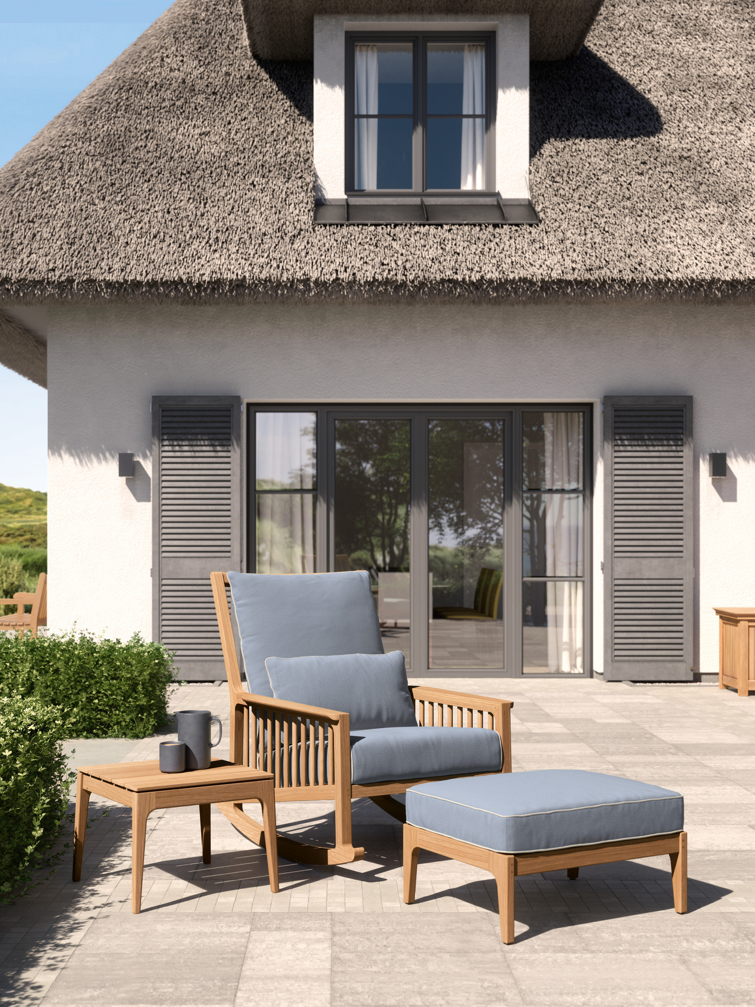 In die grosszügigen Polstermöbel im Loungeformat zieht man sich gerne zurück. Ihre Rahmen sind aus hochwertigem Plantagenteakholz gefertigt, die Sitzflächen mit einem Gewebe bespannt, das die komfortablen Polster sicher trägt. Als markantes Merkmal verleihen aufwendig verarbeitete Keder dem klassischen Refugium seine maritime Anmutung. Alle Kissen sind farbig umrandet.