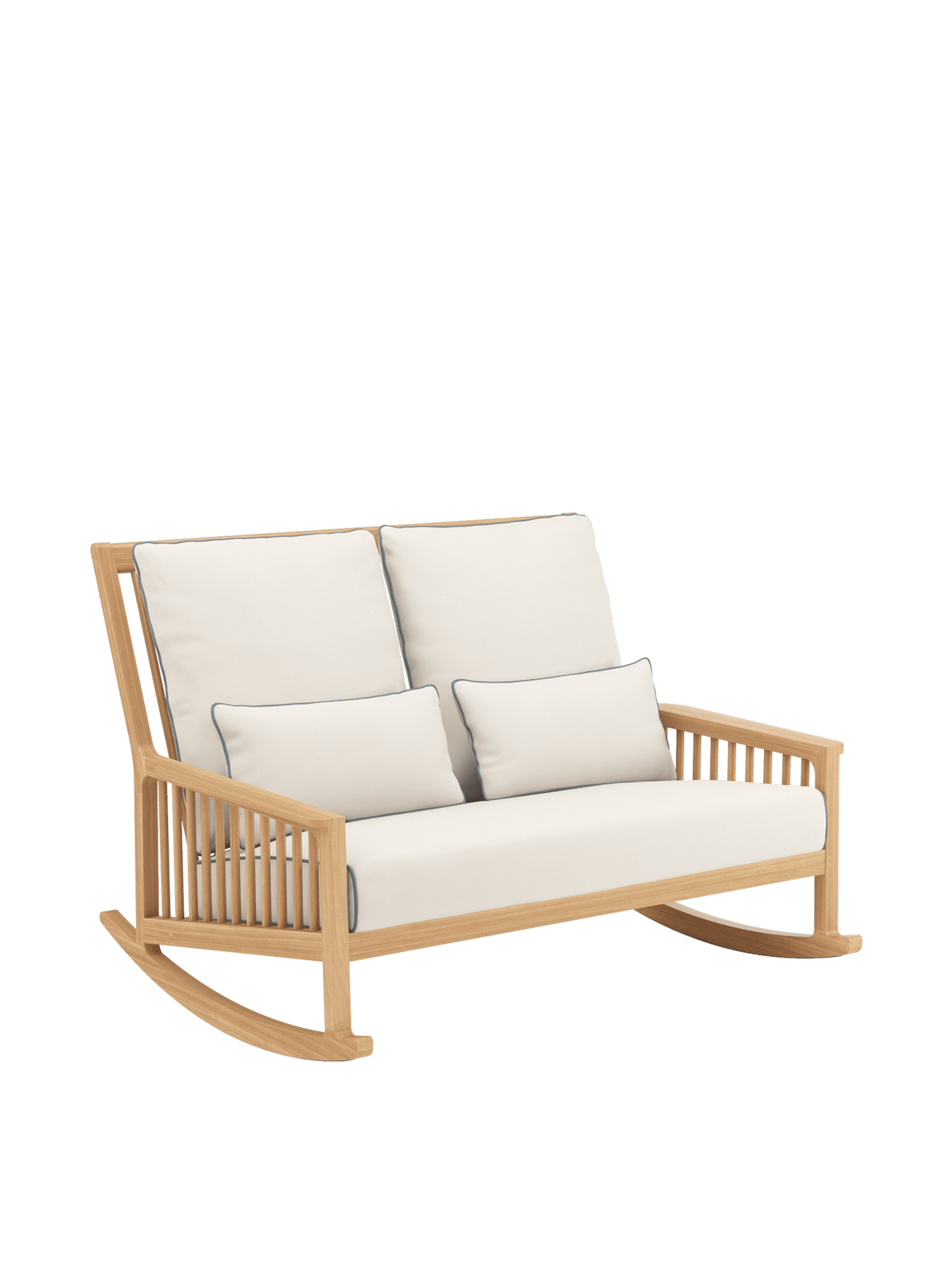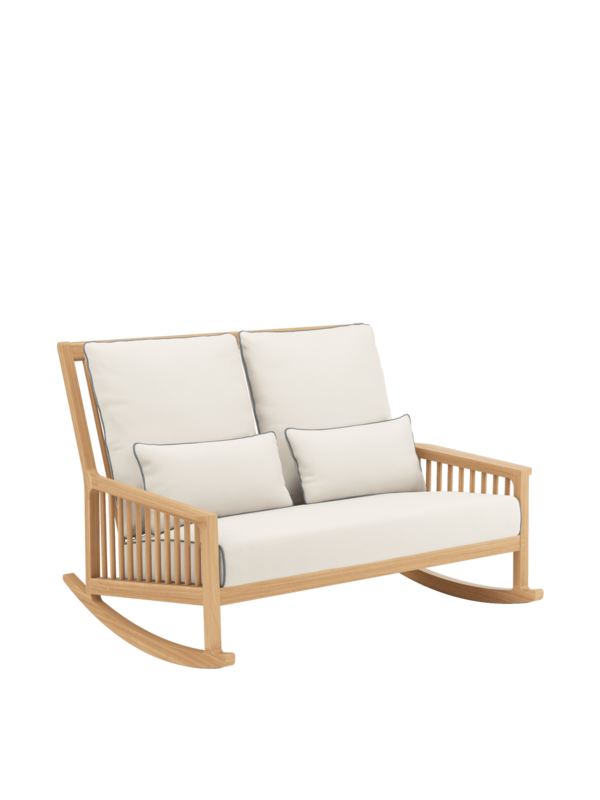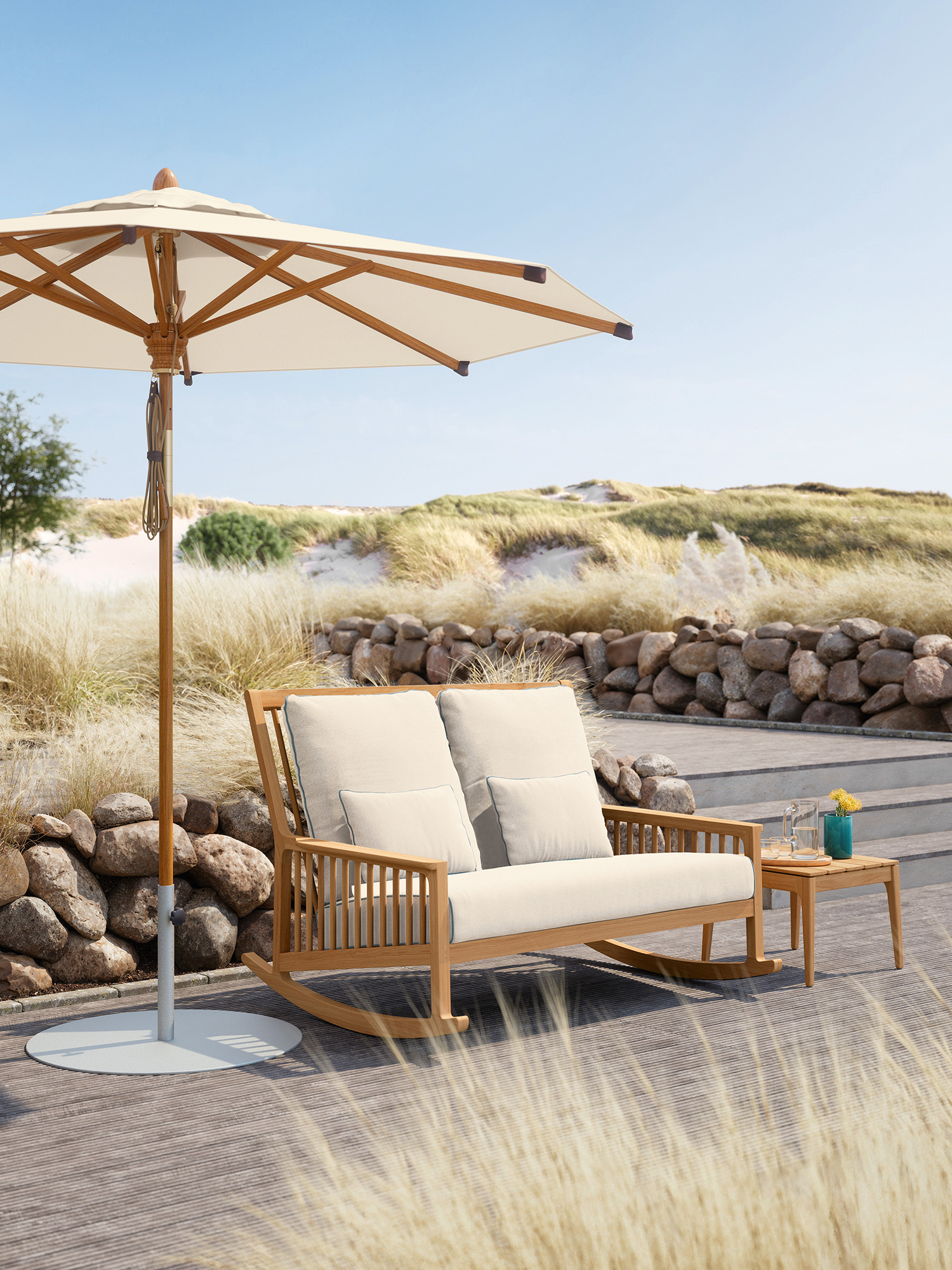 Die bewährten Qualitäten von Gartenbank und Schaukelstuhl potenzieren sich, wenn man sie vereint. Der Zweisitzer ist dazu da, glückliche Stunden zu teilen und Behaglichkeit Seite an Seite zu geniessen. Newhaven verwöhnt dabei mit einer schulterhohen Rückenlehne und besonders tiefem Sitz. Klassisches Teak bringt die nötige Bodenhaftung, elegantes Design den erwünschten Schwung. Hat man beide Sitzplätze einmal ganz für sich allein, kann man sich darauf auch ausstrecken, die Beine hoch- und eines der weichen Kissen unter den Kopf legen.