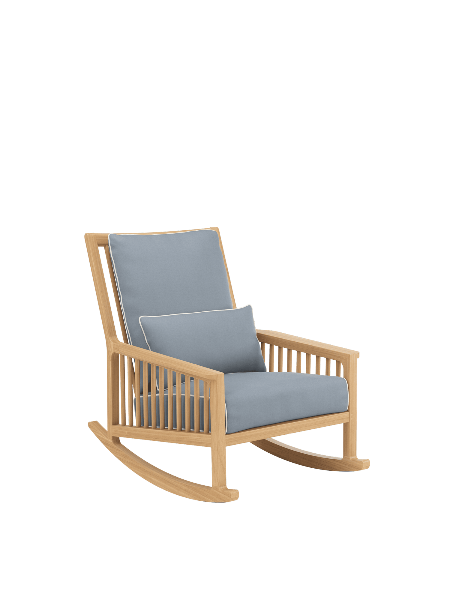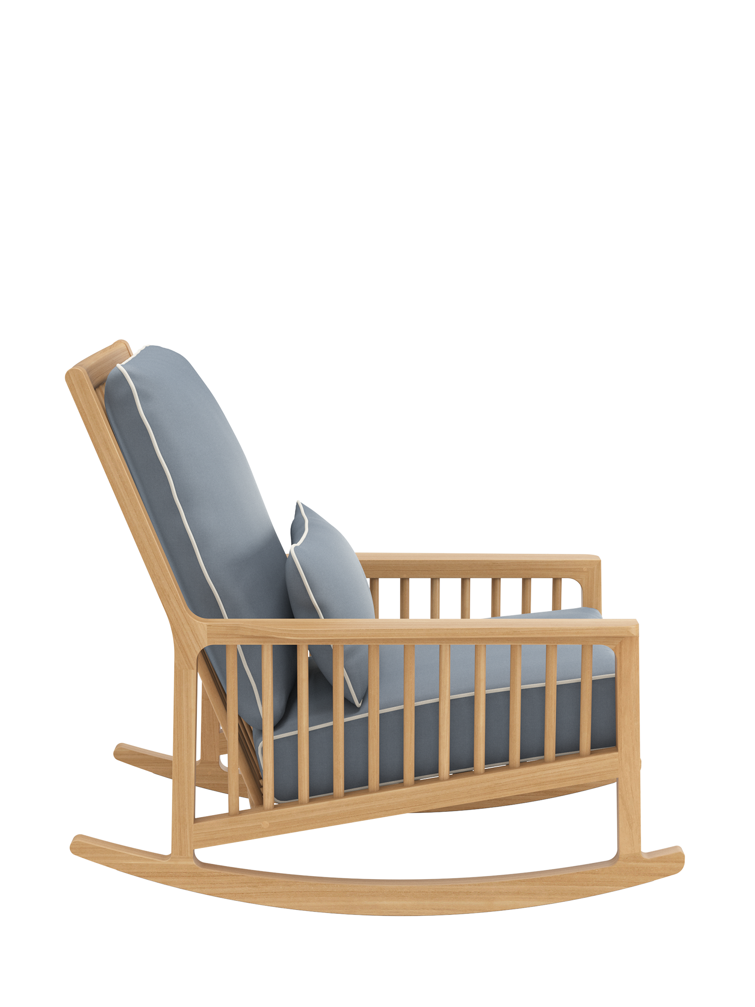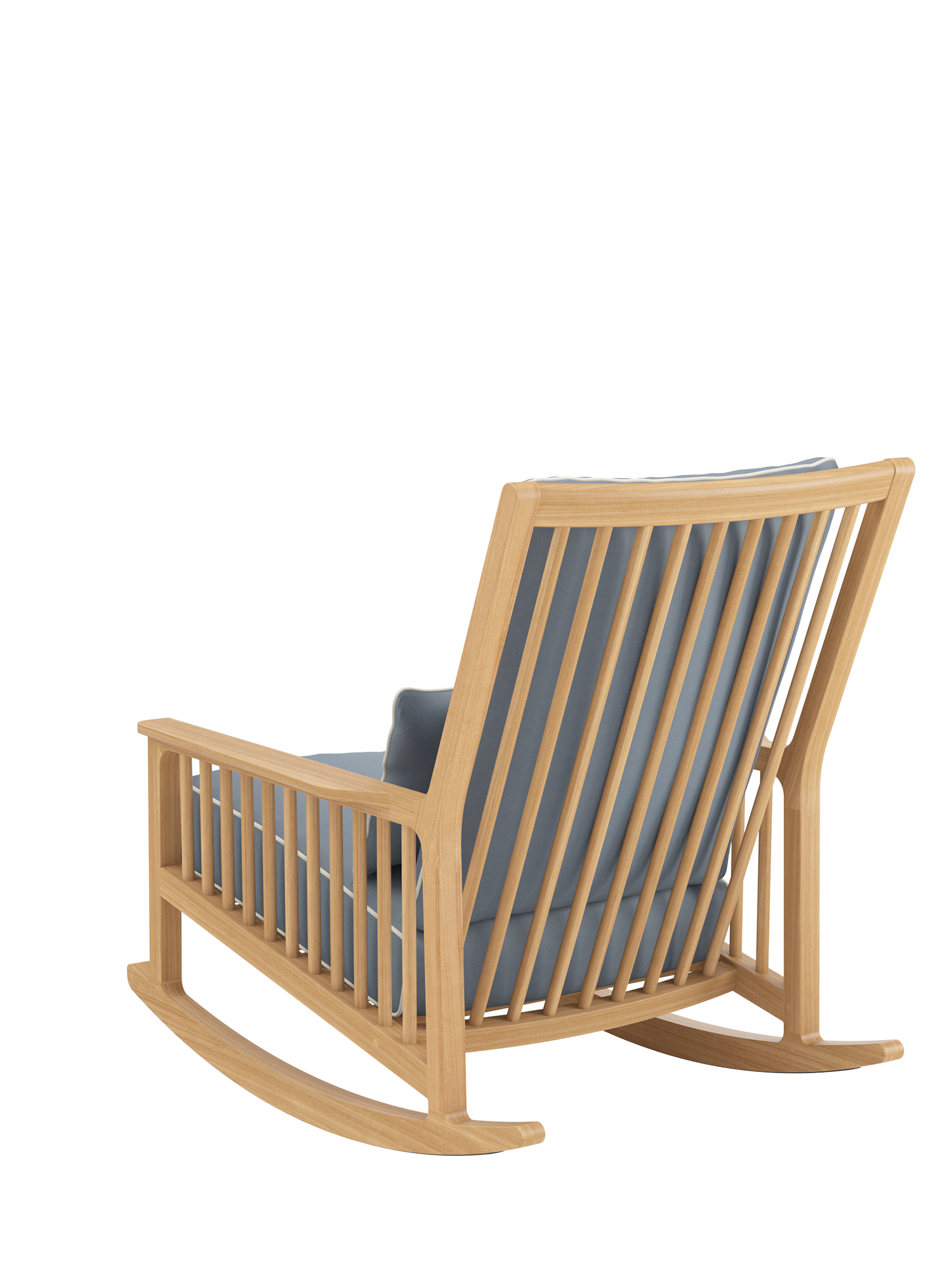 Mit schulterhohem Rücken ist er zum Anlehnen geschaffen, seine bequeme Tiefe ist besonders einladend. Kurz Schwung holen, die Beine anziehen und sich auf eleganten Teakkufen wiegen – in den traumhaft weichen Polstern des Schaukelstuhls versinkt man gern. Eine unter seinen Kufen angebrachte schmale Kunststoffschiene schützt empfindliche Böden.