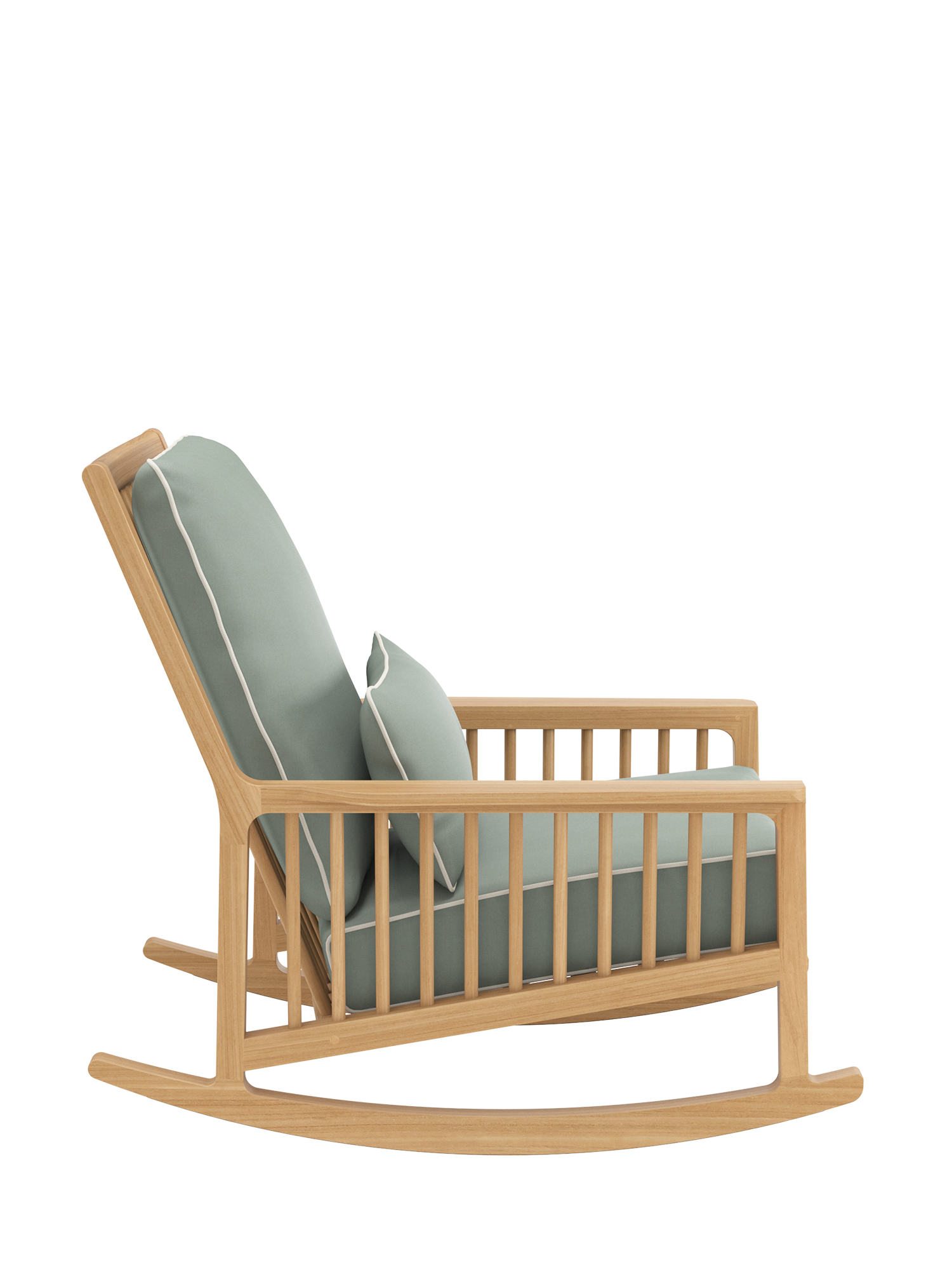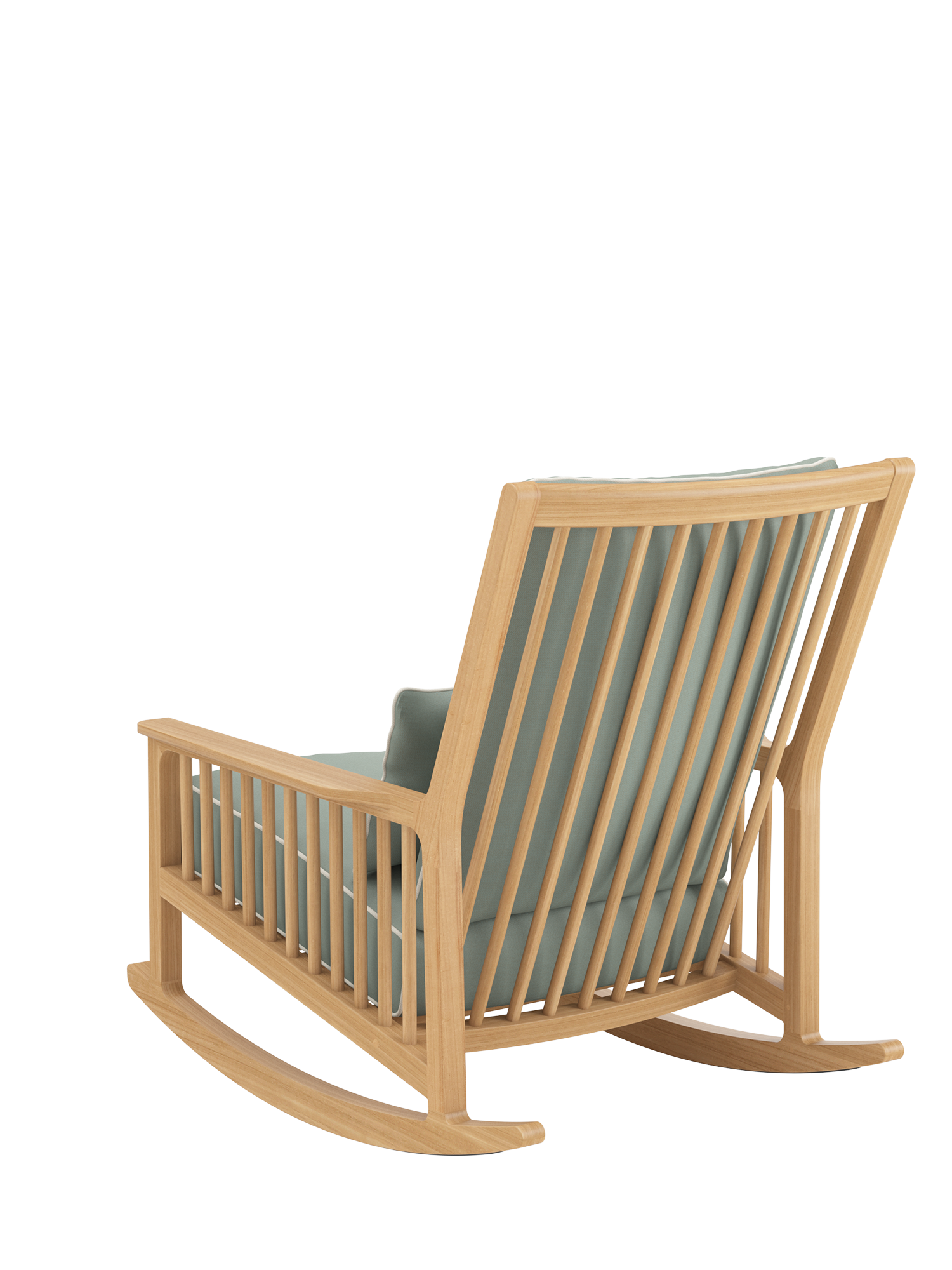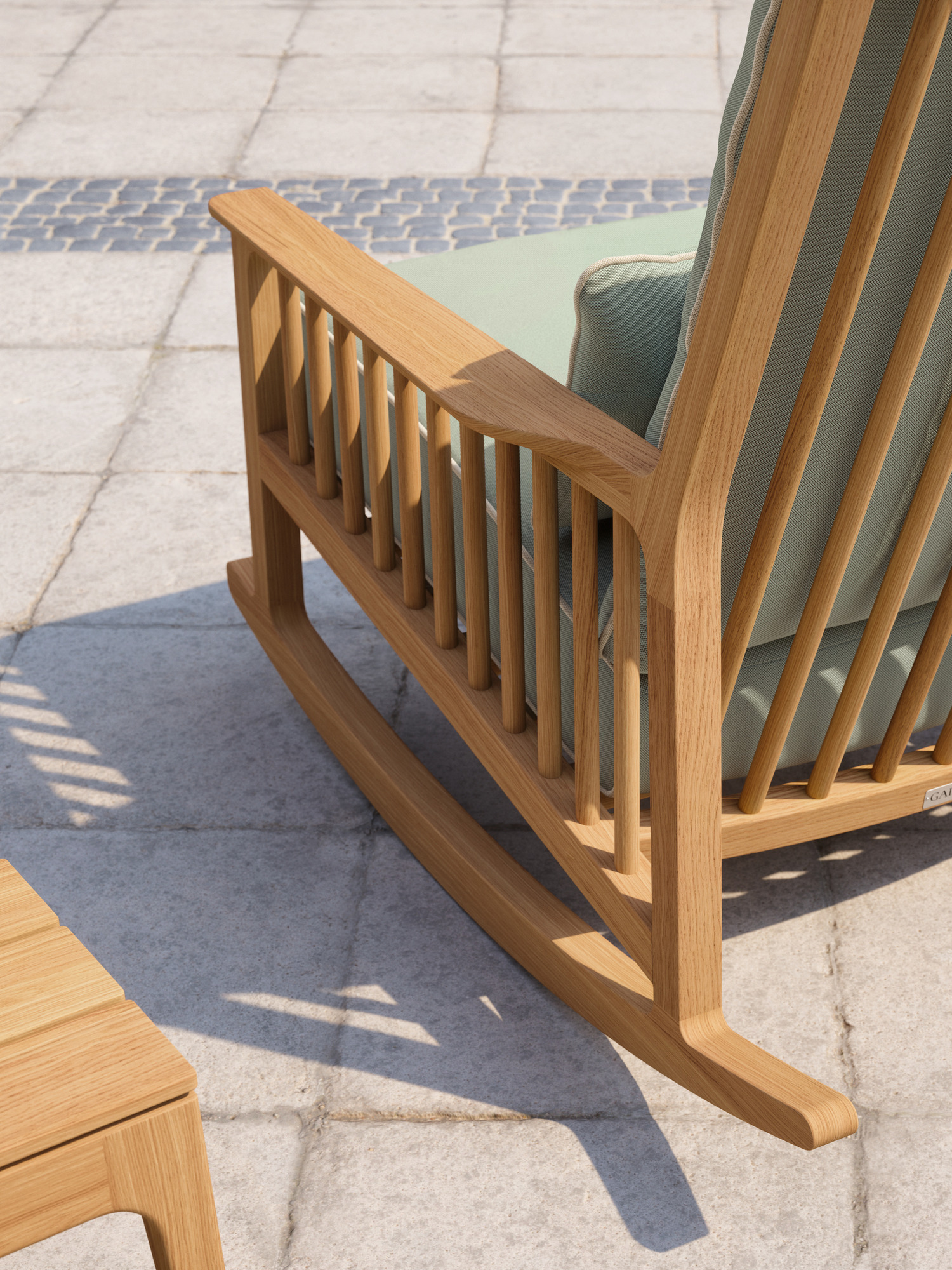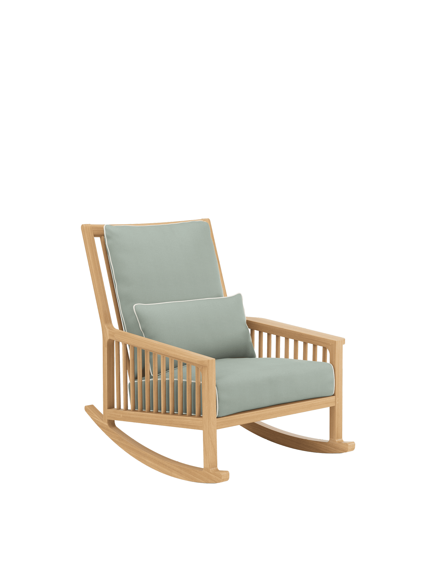 Mit schulterhohem Rücken ist er zum Anlehnen geschaffen, seine bequeme Tiefe ist besonders einladend. Kurz Schwung holen, die Beine anziehen und sich auf eleganten Teakkufen wiegen – in den traumhaft weichen Polstern des Schaukelstuhls versinkt man gern. Eine unter seinen Kufen angebrachte schmale Kunststoffschiene schützt empfindliche Böden.