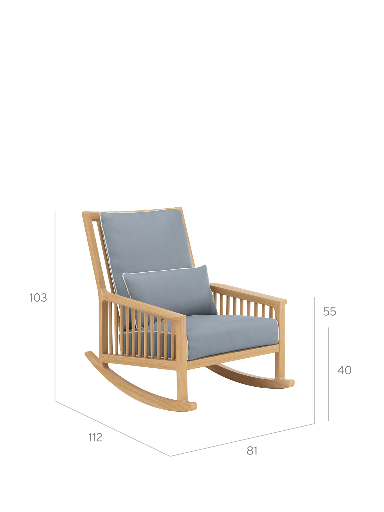 Mit schulterhohem Rücken ist er zum Anlehnen geschaffen. Kurz Schwung holen und sich auf eleganten Teakkufen wiegen – in den traumhaft weichen Polstern des Schaukelstuhls aus hochwertigem Teakholz versinkt man gern. Eine unter seinen Kufen angebrachte schmale Kunststoffschiene schützt empfindliche Böden. Der passende Hocker lädt ein, die Beine hochzulegen.