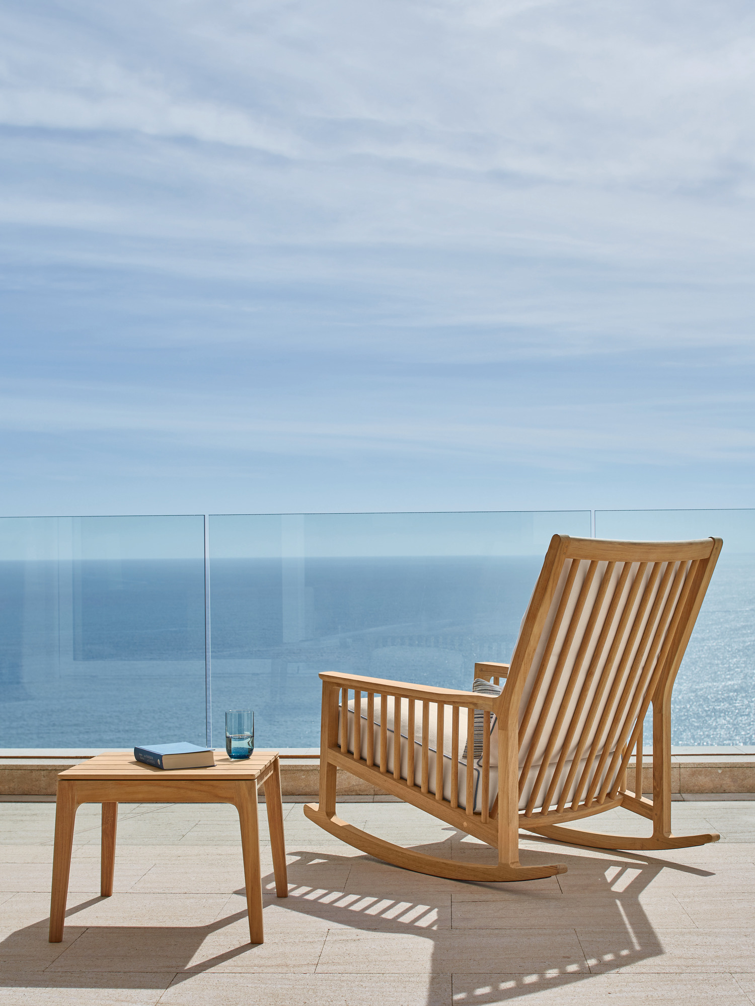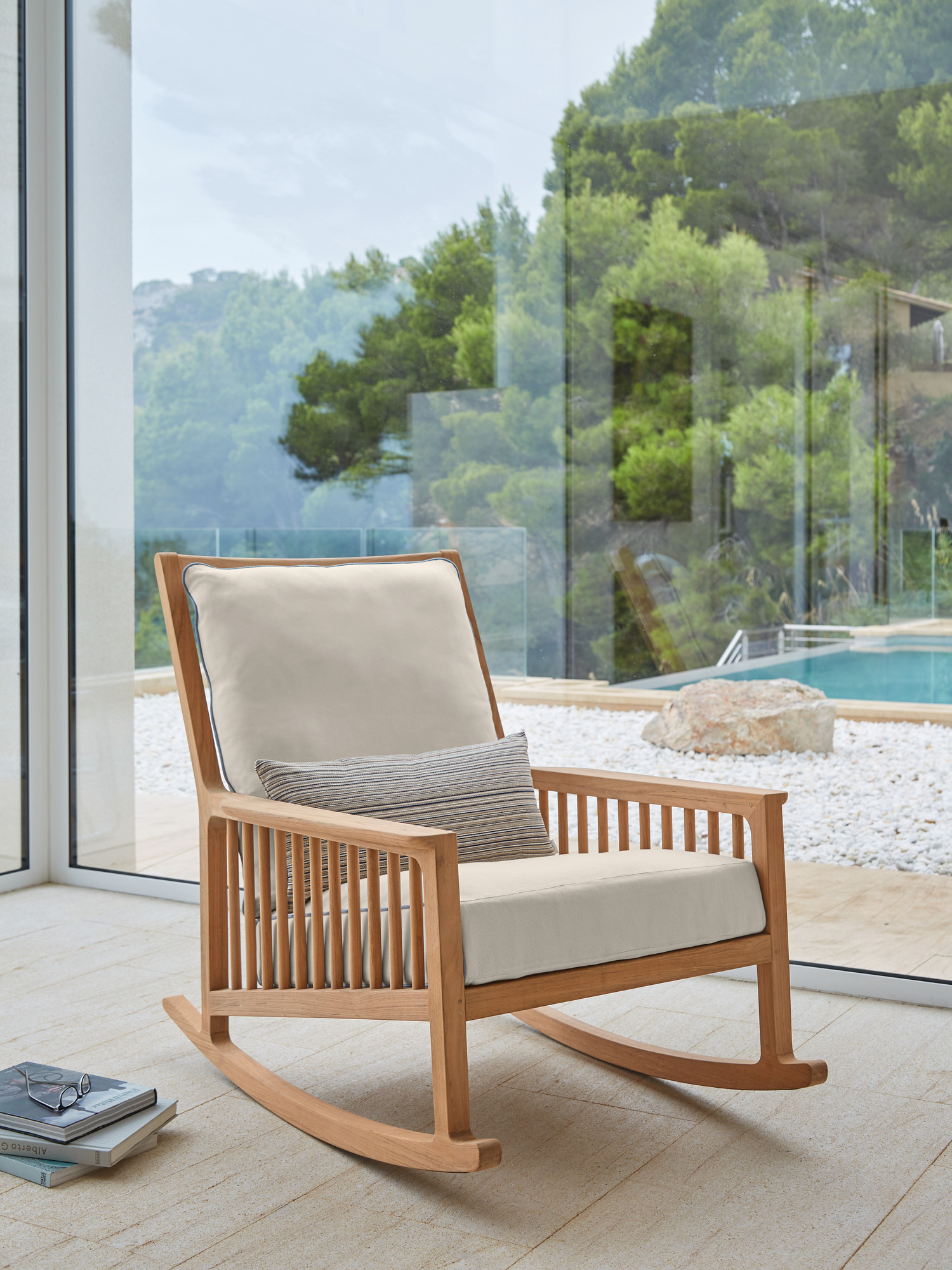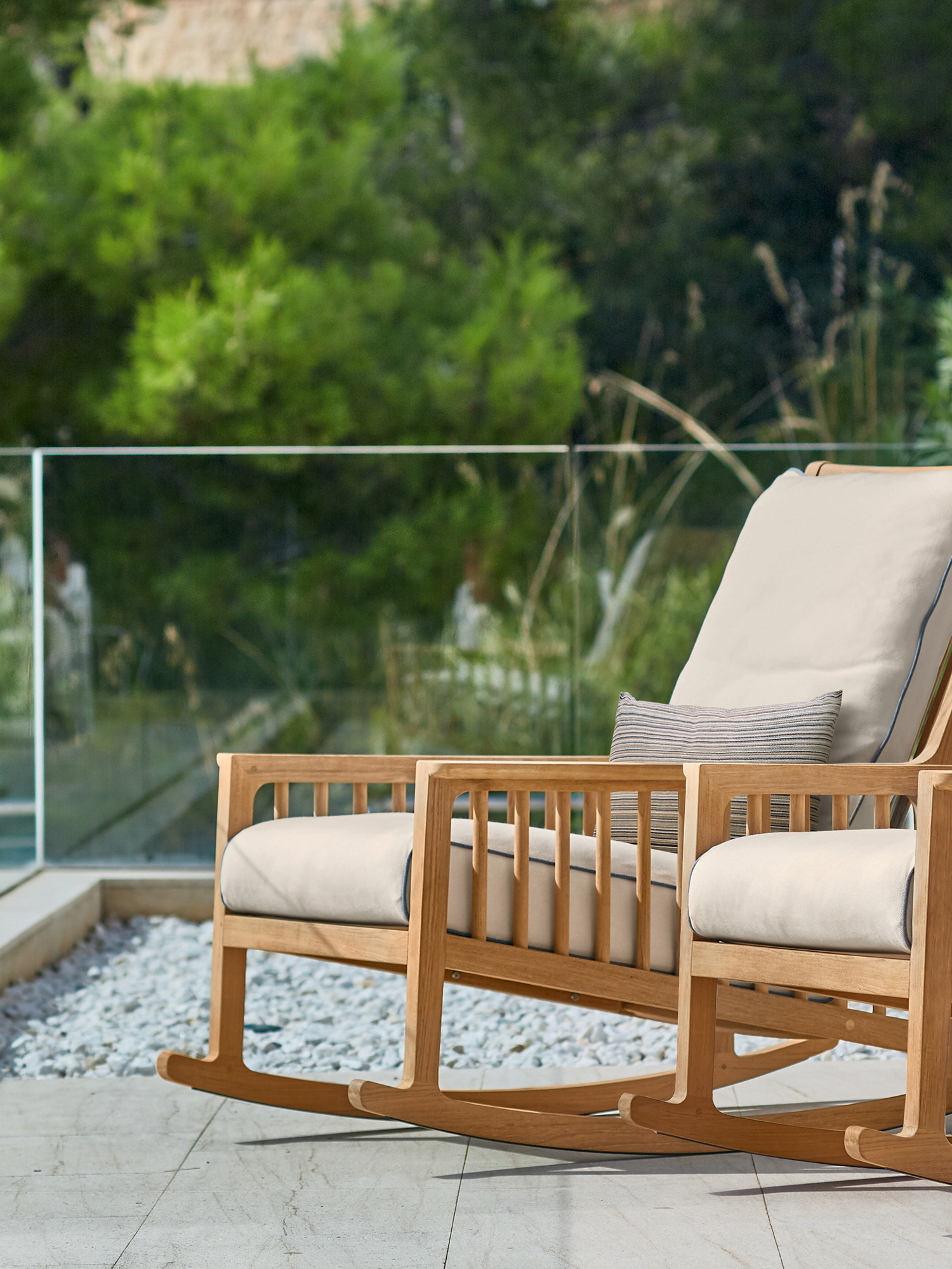 Mit schulterhohem Rücken ist er zum Anlehnen geschaffen. Kurz Schwung holen und sich auf eleganten Teakkufen wiegen – in den traumhaft weichen Polstern des Schaukelstuhls aus hochwertigem Teakholz versinkt man gern. Eine unter seinen Kufen angebrachte schmale Kunststoffschiene schützt empfindliche Böden. Der passende Hocker lädt ein, die Beine hochzulegen.