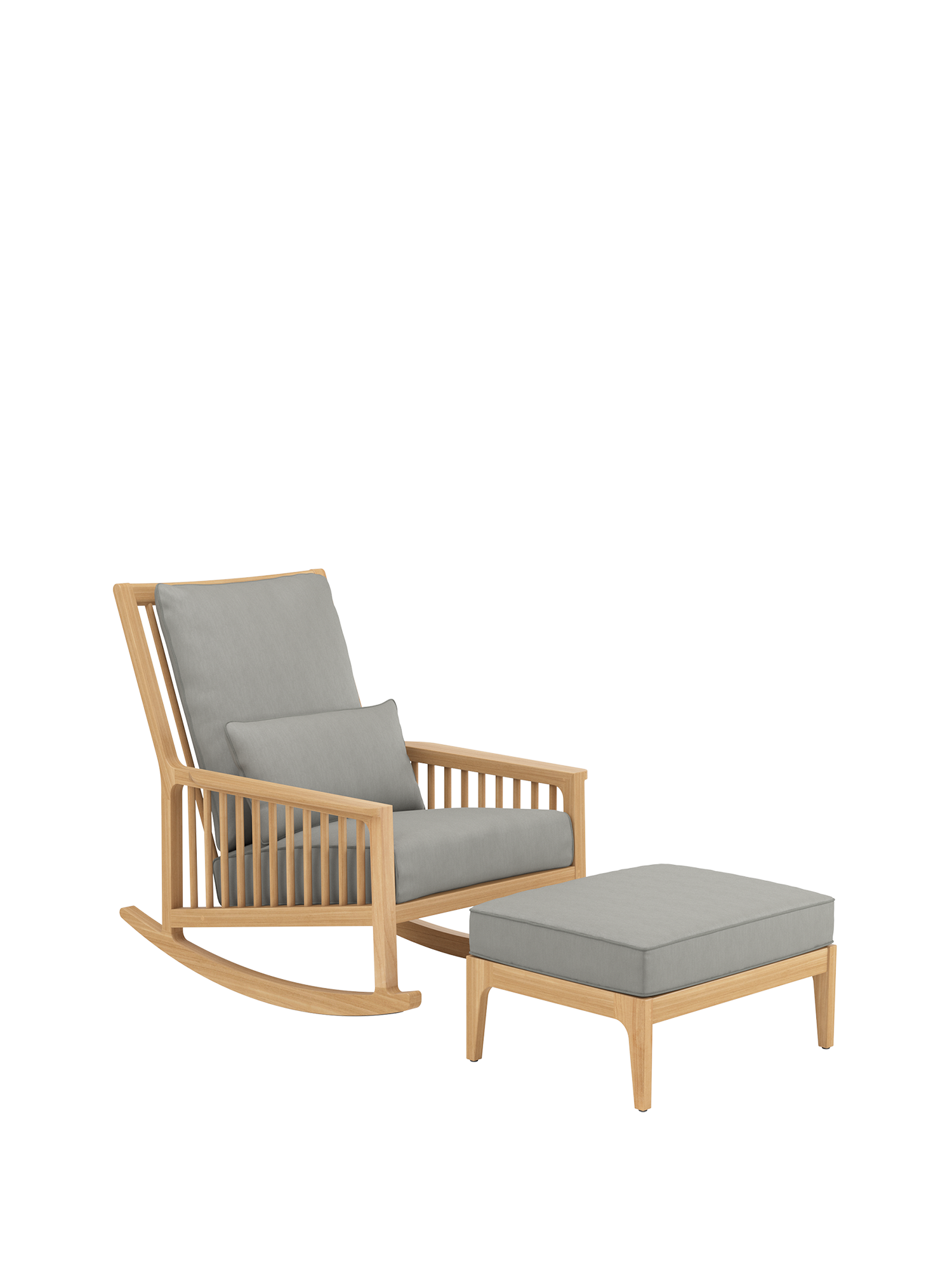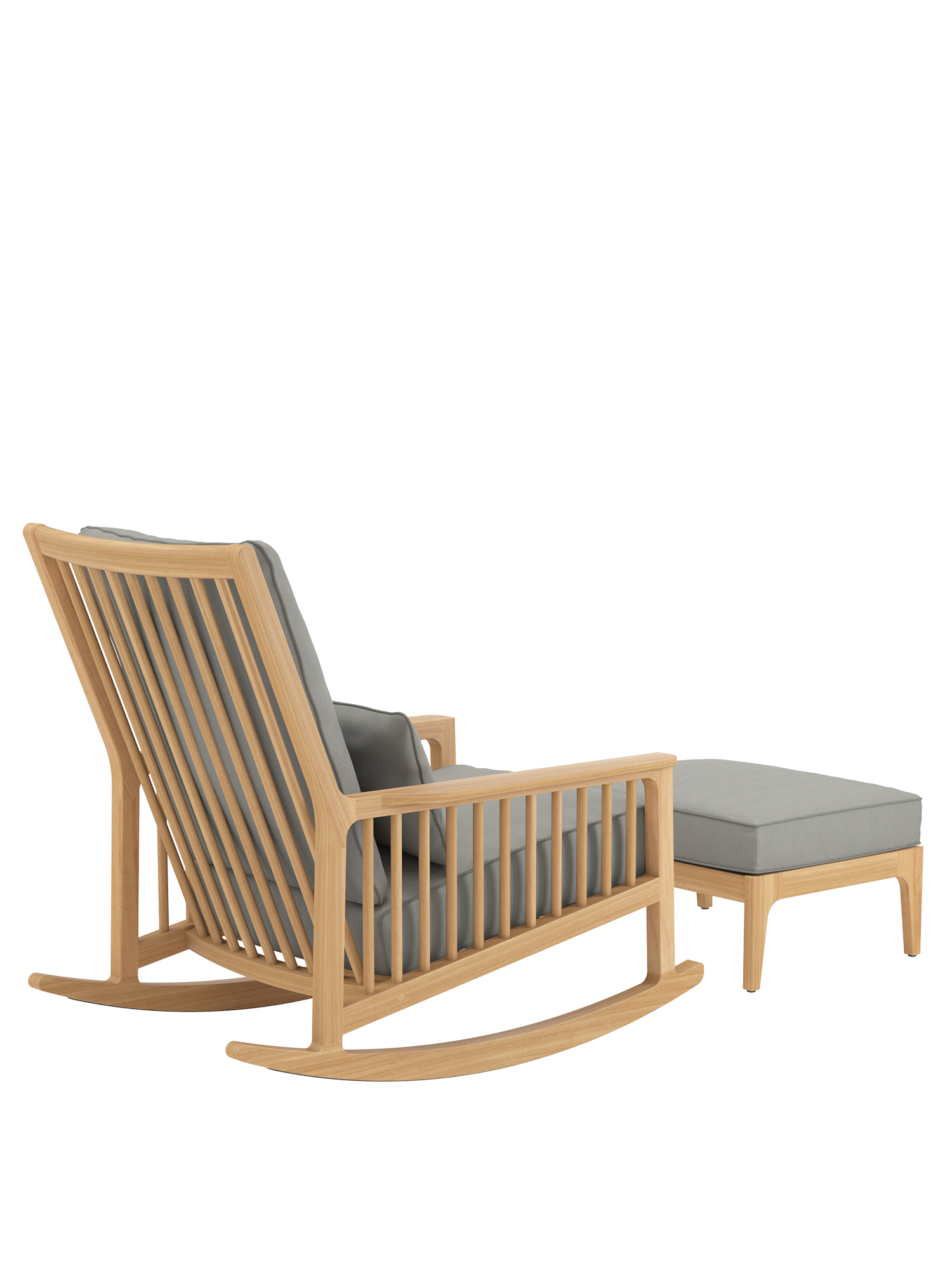 Mit schulterhohem Rücken ist er zum Anlehnen geschaffen. Kurz Schwung holen und sich auf eleganten Teakkufen wiegen – in den traumhaft weichen Polstern des Schaukelstuhls aus hochwertigem Teakholz versinkt man gern. Eine unter seinen Kufen angebrachte schmale Kunststoffschiene schützt empfindliche Böden. Der passende Hocker lädt ein, die Beine hochzulegen.