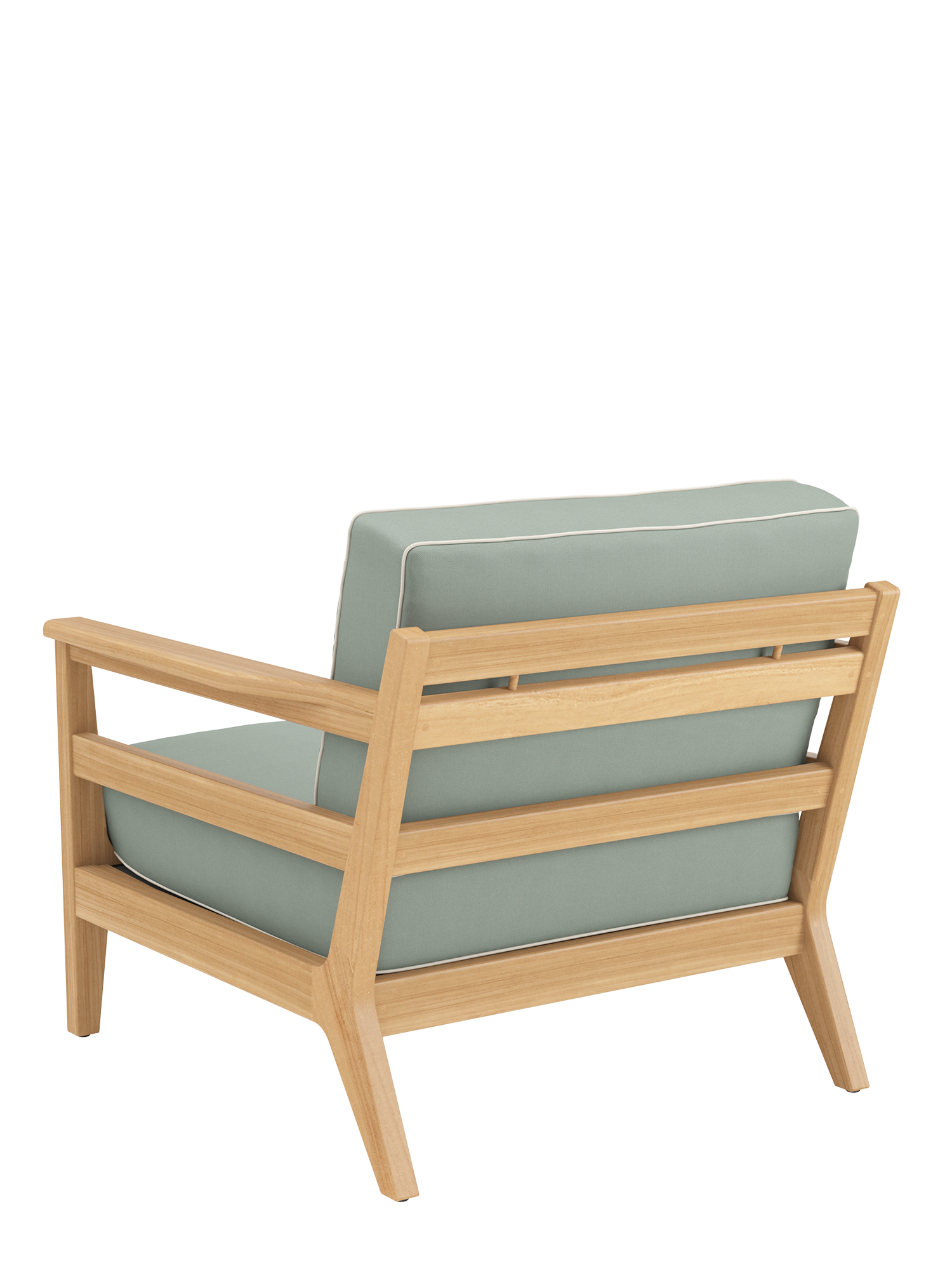 In die grosszügigen Polstermöbel im Loungeformat zieht man sich gerne zurück. Ihre Rahmen sind aus hochwertigem Plantagenteakholz gefertigt, die Sitzflächen mit einem Gewebe bespannt, das die komfortablen Polster sicher trägt. Als markantes Merkmal verleihen aufwendig verarbeitete Keder dem klassischen Refugium seine maritime Anmutung. Alle Kissen sind farbig umrandet.