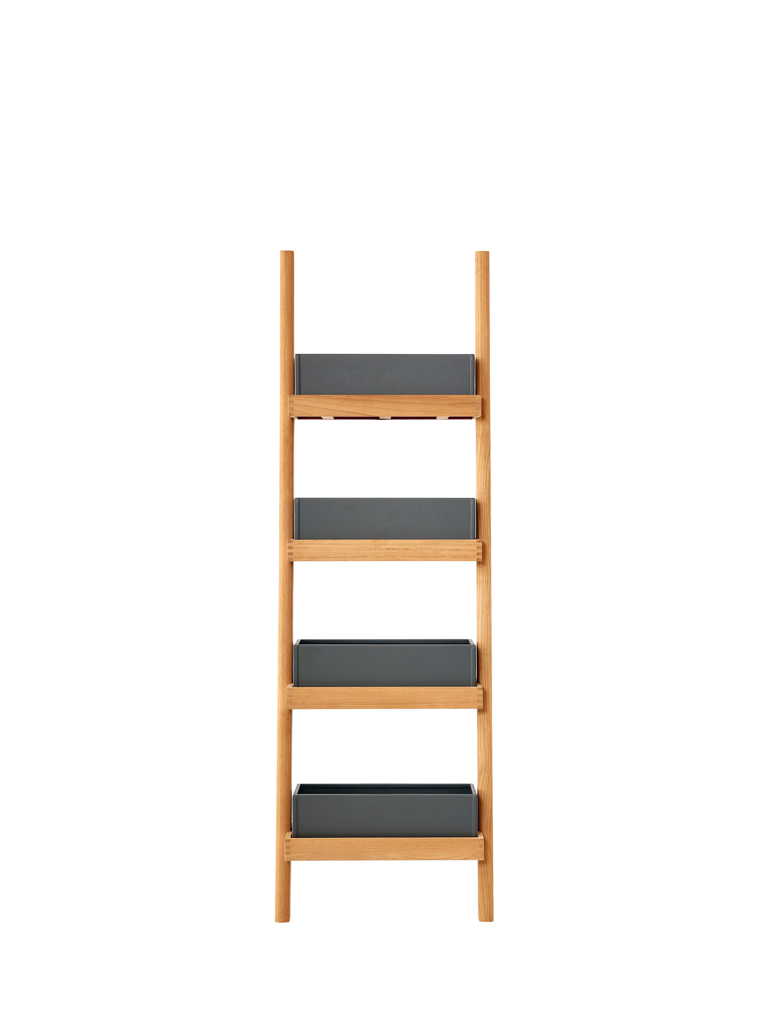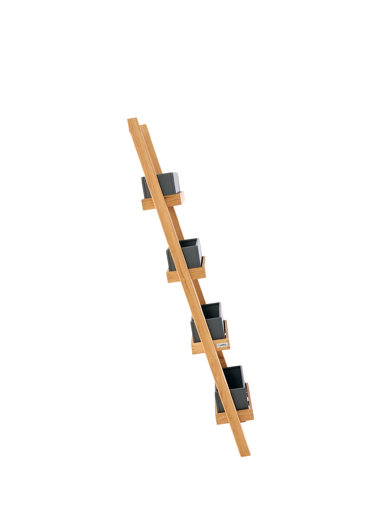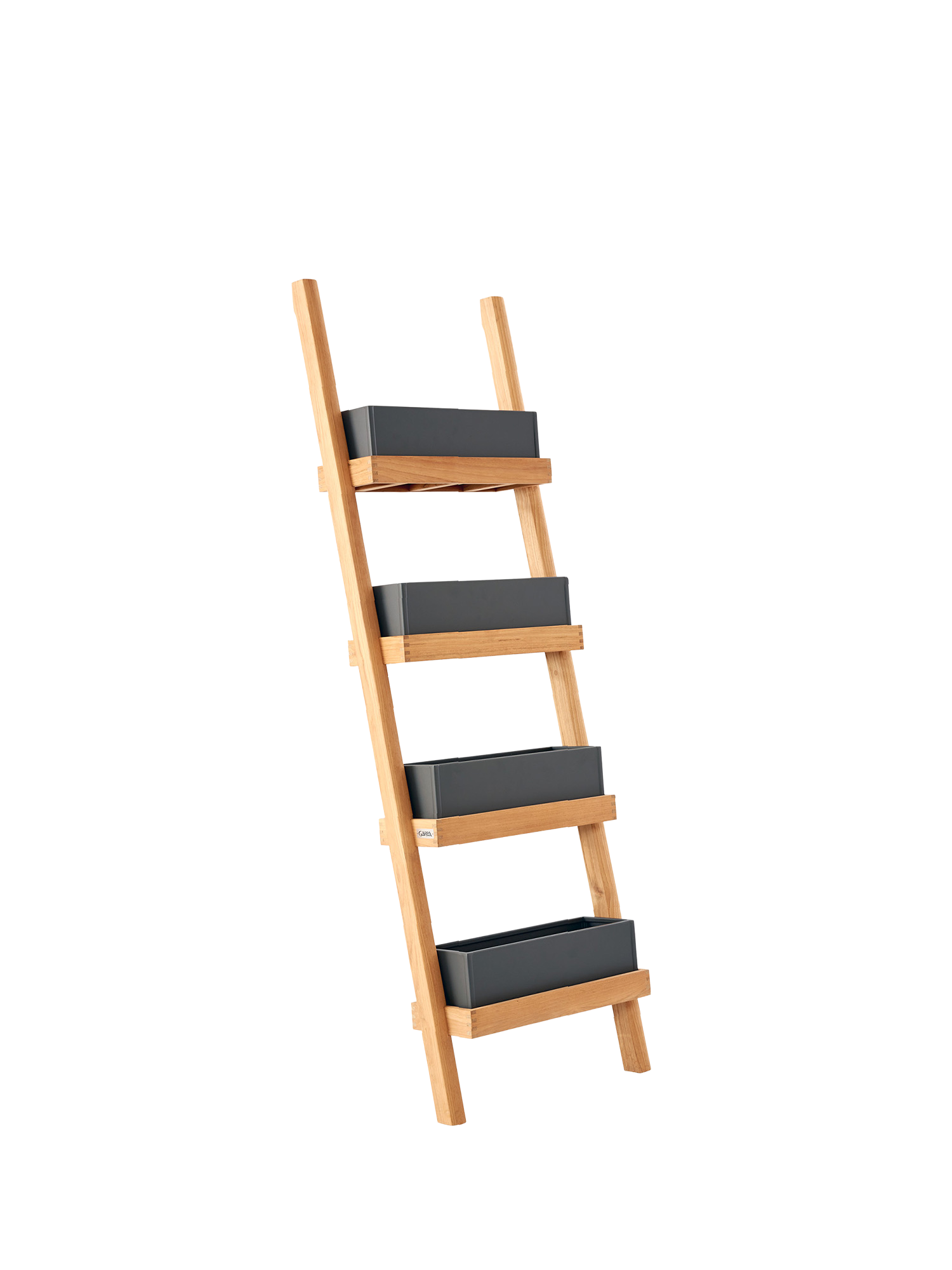 Auf der Pflanzleiter aus Teak, die an die Wand gelehnt oder mit einem zusätzlichen Set frei aufgestellt wird, wächst der Stolz des Stadt- und Balkongärtners geradezu über sich hinaus. In vier Pflanzkästen aus Aluminium, wahlweise in Weiss oder Graphit, lassen sich auf vier Ebenen kleinere Stauden und Blumen ziehen oder Küchenkräuter pflückfrisch ernten. Die Kästen sind mit jeweils vier Löchern versehen, durch die das Wasser nach dem Giessen oder einem Regenschauer ablaufen kann. Passende Verschlüsse für die Abzugslöcher liefern wir mit.