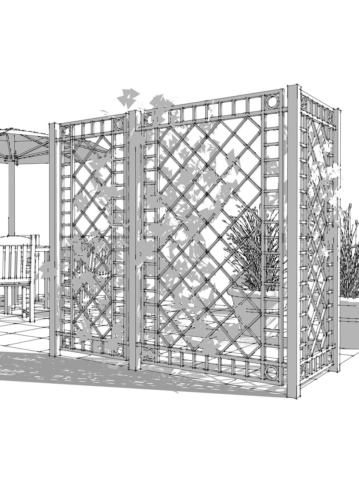 Für diese Lösung werden schmale oder breite Rankelemente durch Pfosten und verschiedene Verbindungsstücke zusammengefügt und fungieren so als Trennwand oder attraktive Abschirmung z.B. von Kompost oder Abfallbehältern.