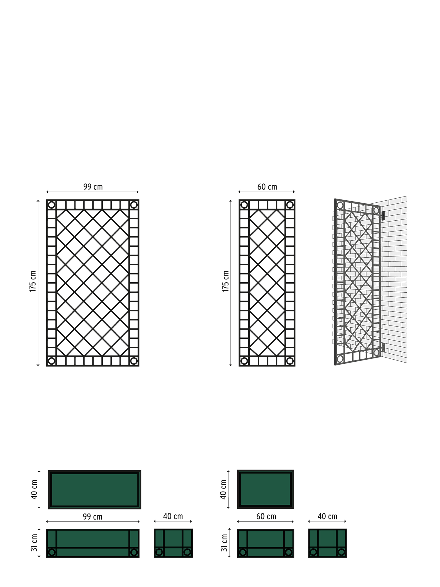 Schmale oder breite Rankelemente können von hinten an die Pflanzkübel geschraubt oder frei schwebend zwischen ihnen befestigt werden. Eine zusätzliche Halterung ermöglicht es, ein einzelnes Element im rechten Winkel mit einer Hauswand zu verbinden, um dem System zusätzlichen Halt zu verleihen. Passendes Zubehör und Verbindungsstücke für diese Version finden Sie unter "Zubehör“.