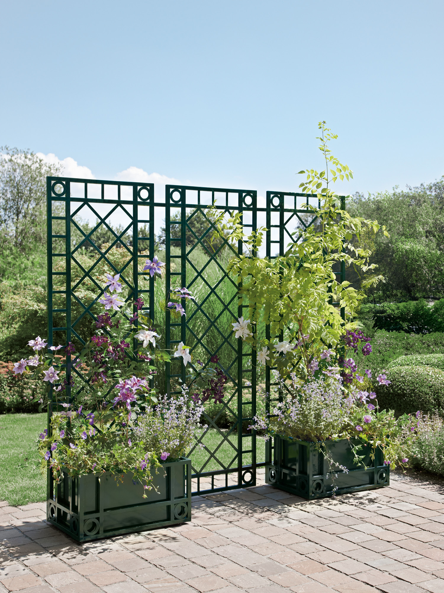 Ein Sichtschutz, der rankt und blüht und mit seinem schönen Rautenmuster auch im Winter eine Augenweide ist: Die Kletterhilfen und Pflanzkübel der Orangerie aus wetterfestem Aluminium mit einer schwarzgrünen Pulverbeschichtung sind in zwei Breiten erhältlich. Für die Aufstellung bieten sich zwei Lösungen an. Gern beraten wir Sie dazu auch am Telefon.