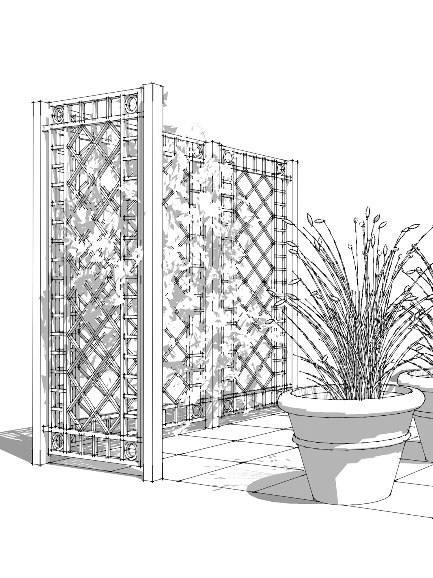 Für diese Lösung werden schmale oder breite Rankelemente durch Pfosten und verschiedene Verbindungsstücke zusammengefügt und fungieren so als Trennwand oder attraktive Abschirmung z.B. von Kompost oder Abfallbehältern.