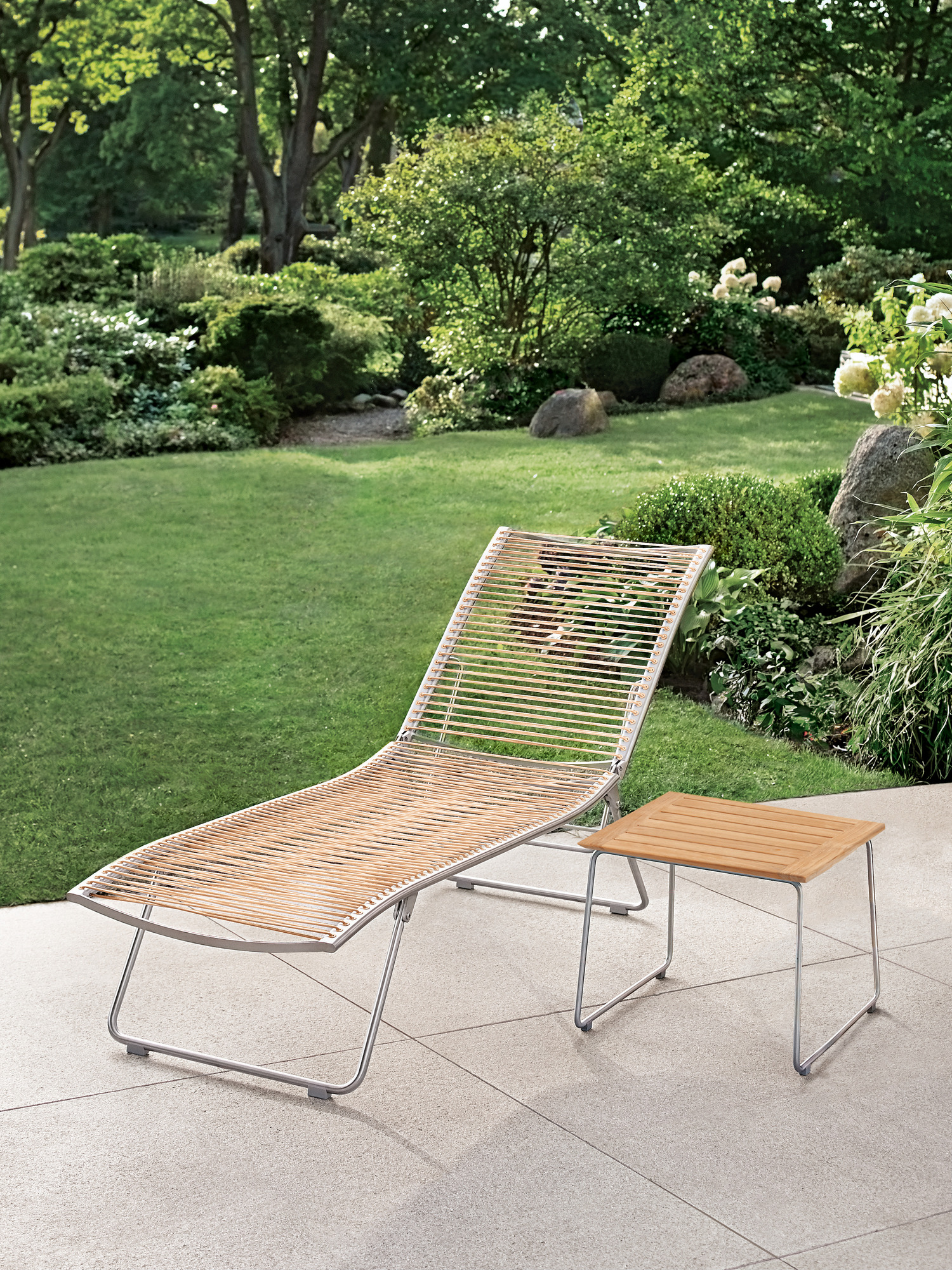 Der moderne Beistelltisch hat ein Gestell aus Edelstahl und eine Tischplatte aus Teakleisten.