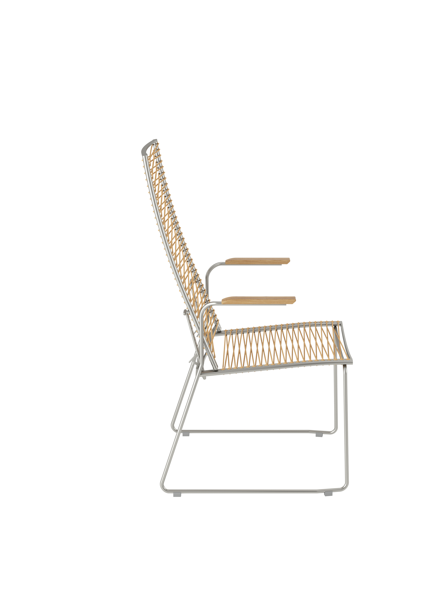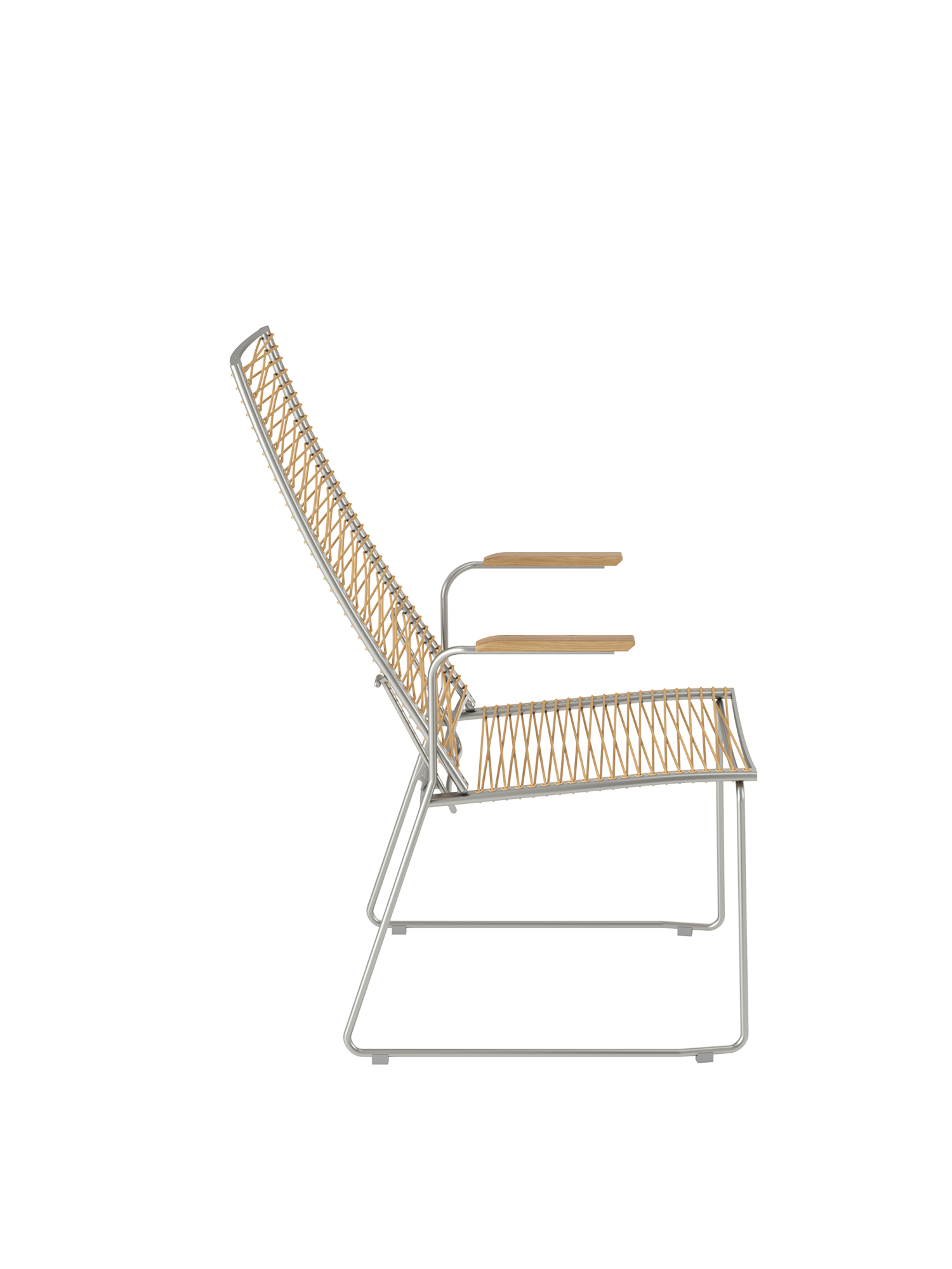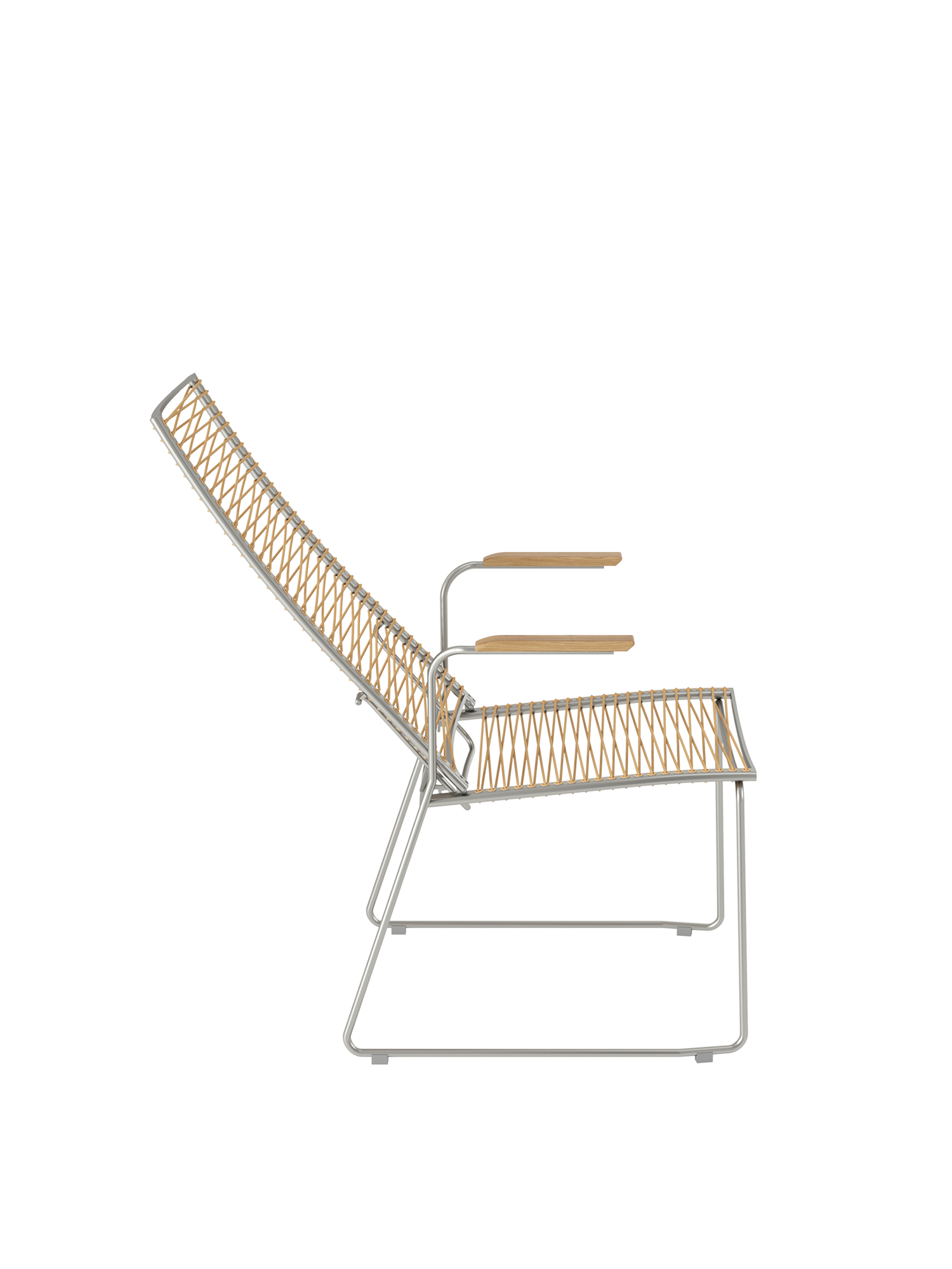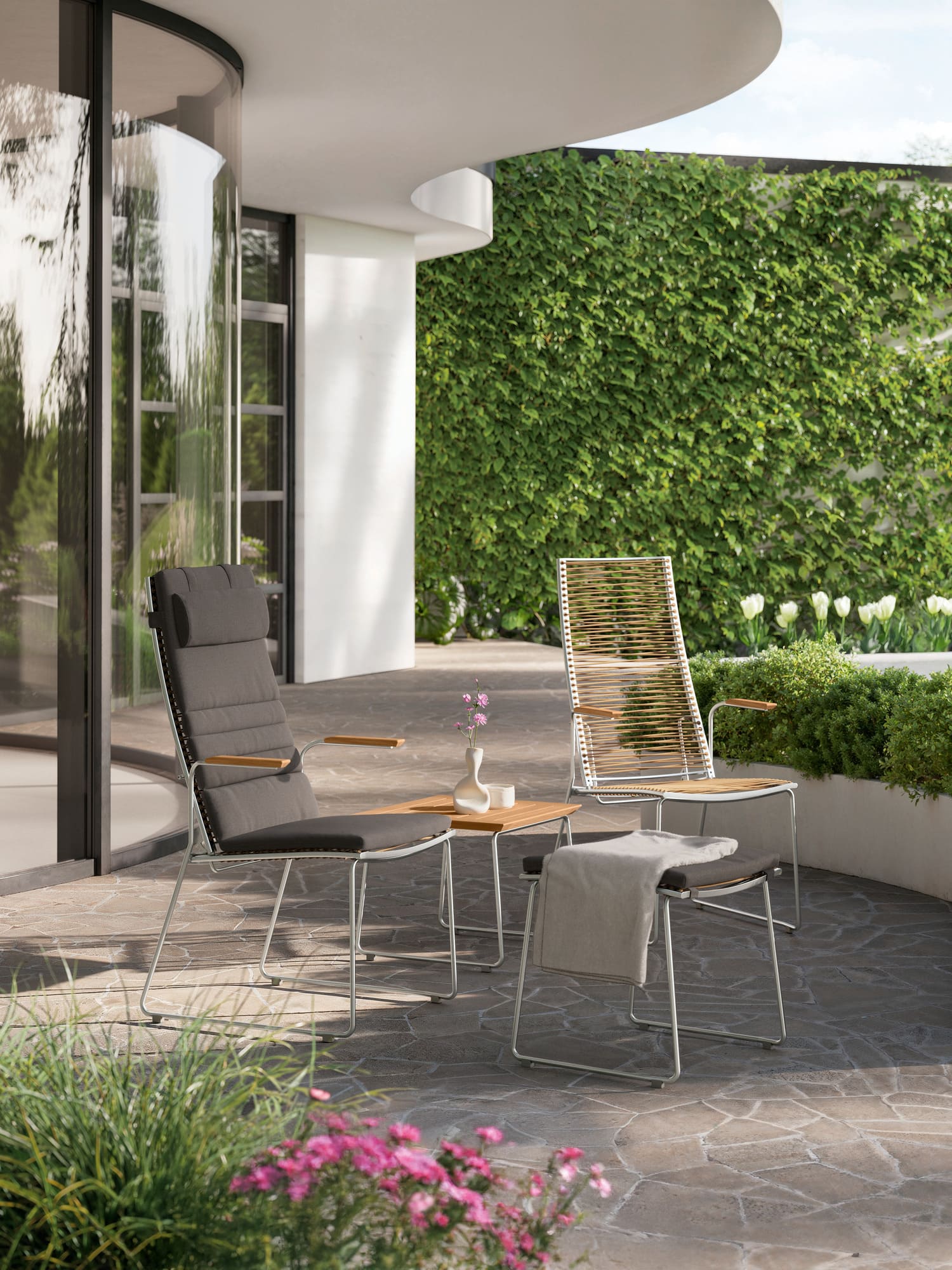 Markantes Merkmal der modernen Sitzmöbel ist ihre Schnürung, die durch dekorative Ösen im Rahmen geführt wird. Die Kunststofffaser ist UV- und frostbeständig und bleibt auch bei Dauergebrauch gut in Form.