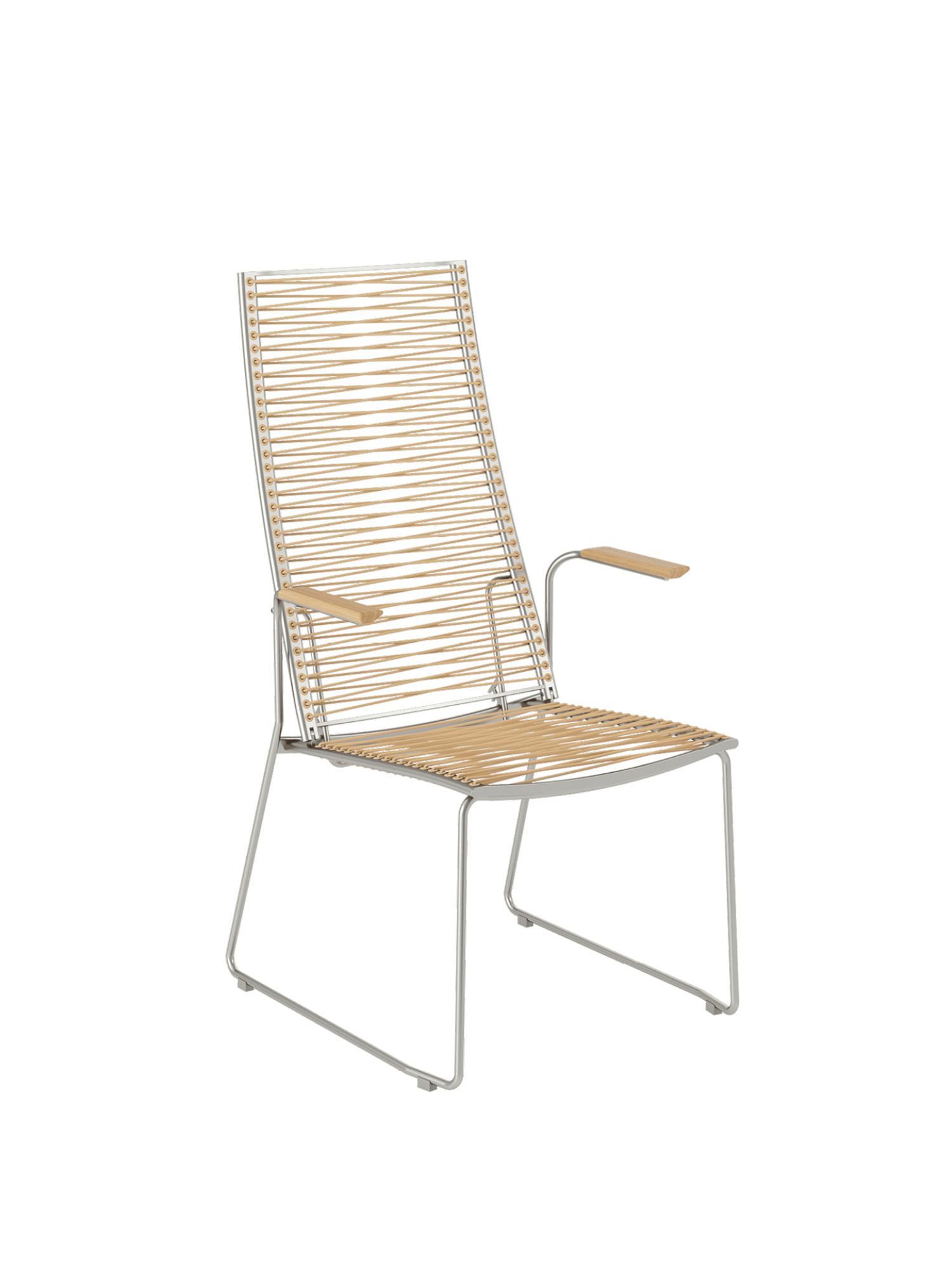 Pan wirkt luftig wie eine leichte Brise. Die eleganten Hochlehner mit einem Edelstahlgestell sind mit einer dauerelastischen Faser bespannt, die sich bequem der Körperkontur anpasst. Die Stühle mit der hohen Rückenlehne lassen sich ideal mit dem passenden Hocker kombinieren.