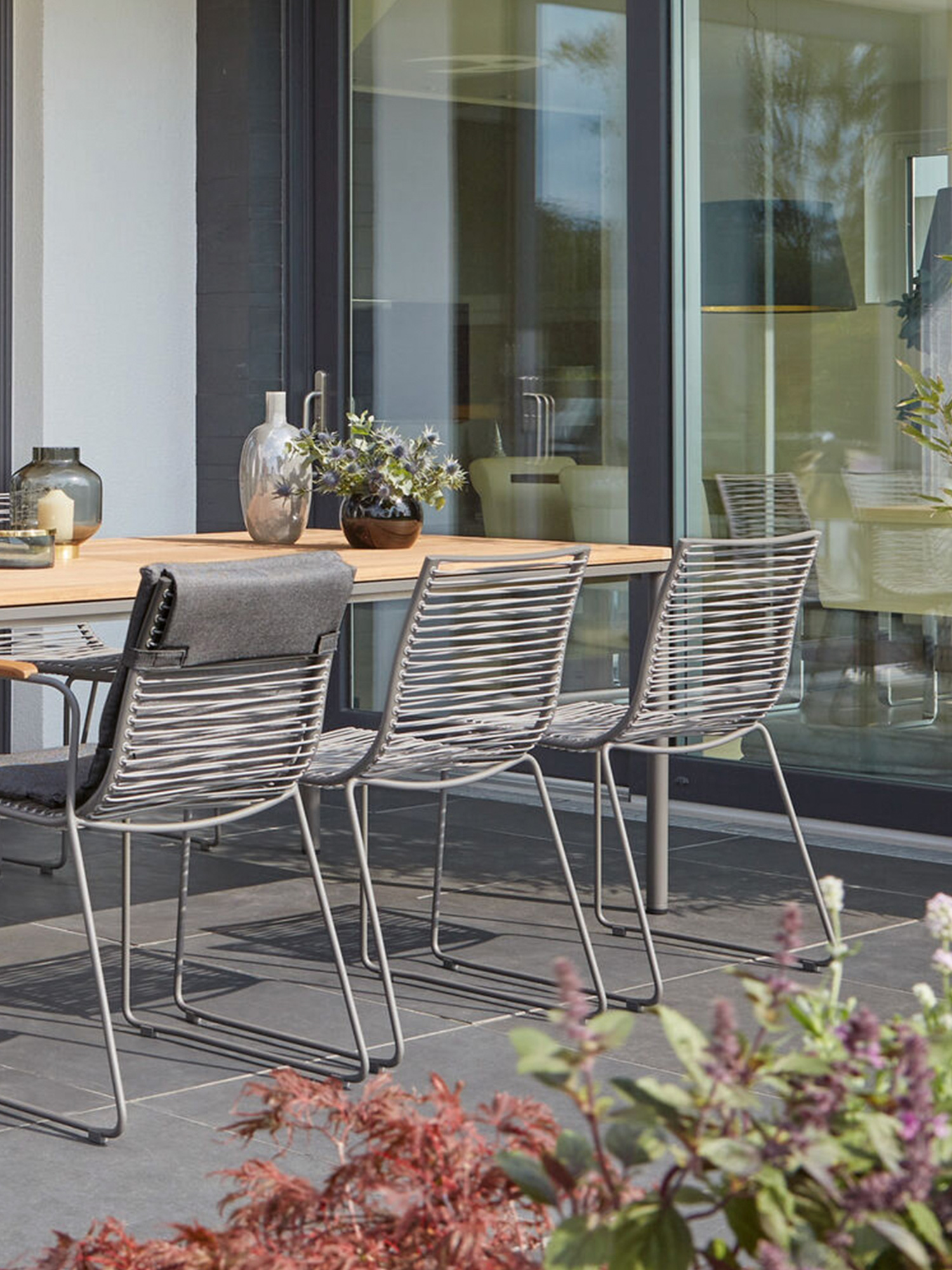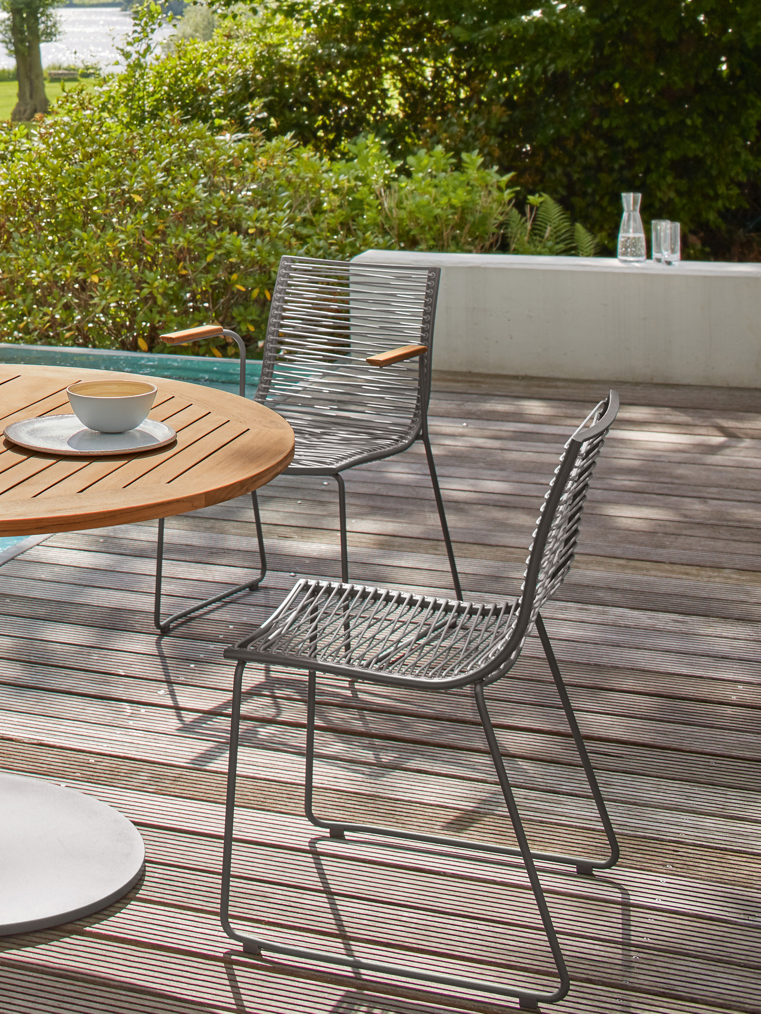 Ausdrucksvoll ist die Schnürung der modernen Sitzmöbel, die durch dekorative Ösen im Rahmen geführt wird. Die Kunststofffaser ist licht- und wetterbeständig und bleibt auch bei Dauergebrauch formschön.
