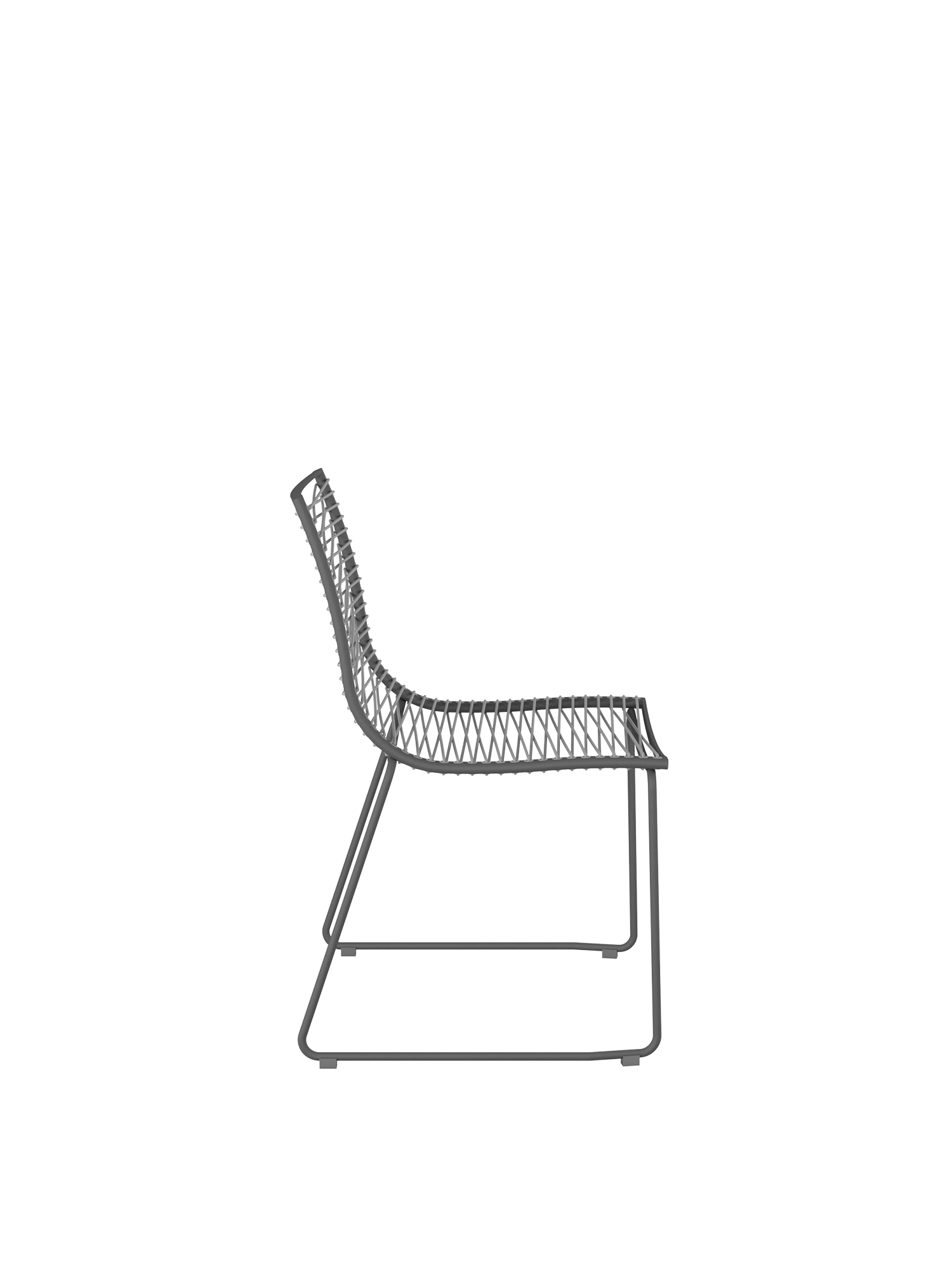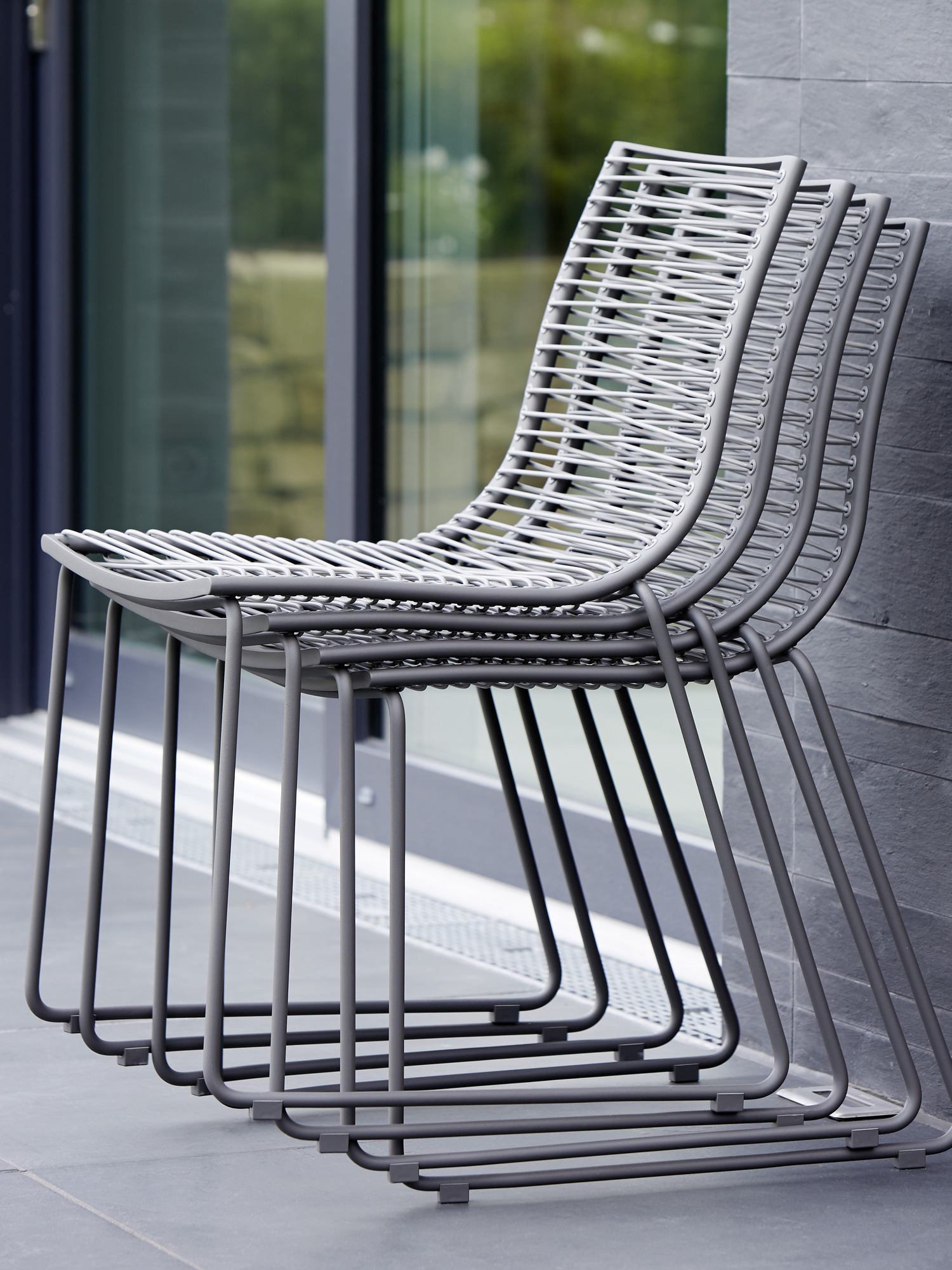 Minimalismus überdauert jede Mode. Die luftig leichten Stühle mit einem pulverbeschichtetem Edelstahlgestell sind mit einer dauerelastischen Faser bespannt, die sich angenehm der Körperlinie anpasst. Die stapelbaren Stühle sind auch mit Armlehnen erhältlich.