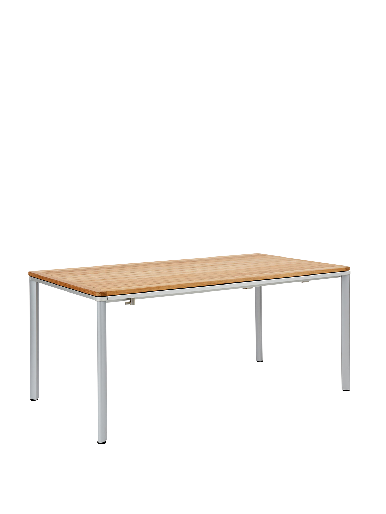 Eine umlaufende Zarge mit sanfter Rundung prägt das Design der vierbeinigen Portland Tische. Dabei lässt sie genügend Raum, um auch Stühle mit Armlehnen unter die Tischplatte zu schieben. Mit einer Tischoberfläche aus Teakleisten und einem Aluminiumgestell sind sie stilsichere Begleiter zu Stühlen der Serie Monterey.