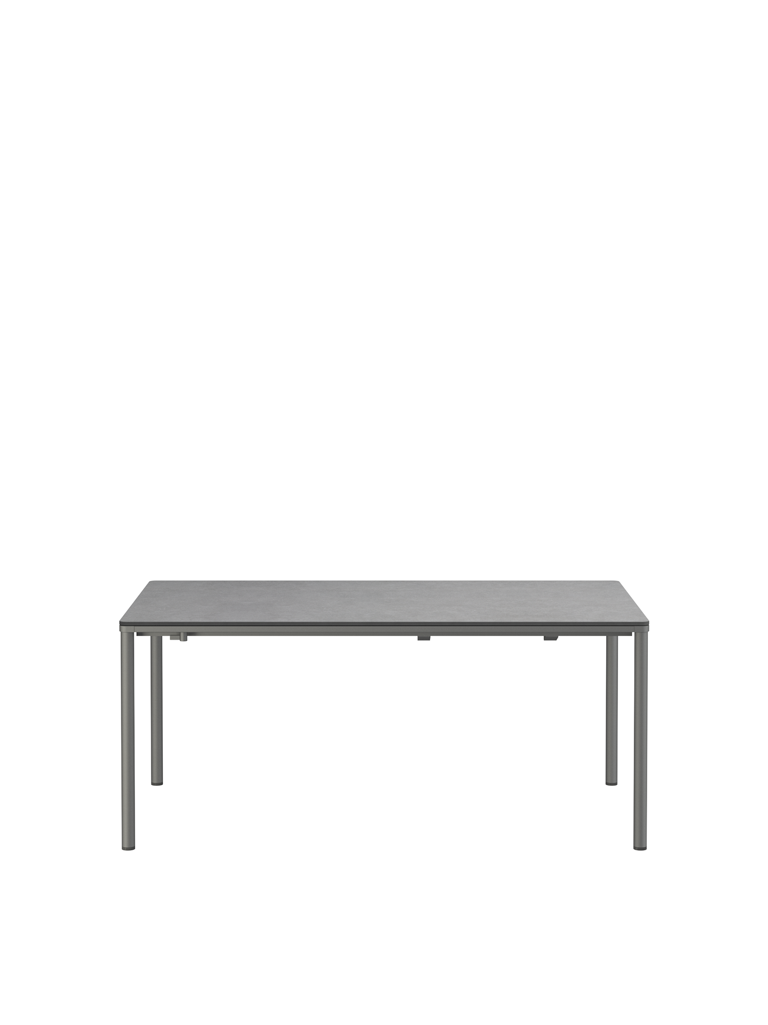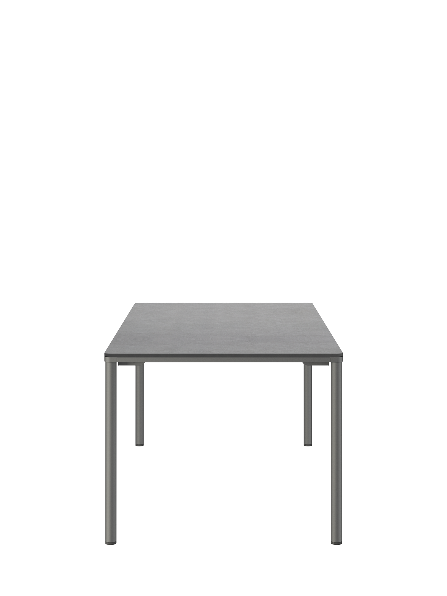 Das graphitgrau pulverbeschichtete Edelstahlgestell der Portland Tische verbindet diese mit allen Stühlen aus gleichem Material. Vier schlanke Beine tragen eine Platte, die mit der Zarge darunter wie aus einem Guss wirkt und in den Ecken der Rundung der Beine folgt. Die Oberfläche besteht aus wetterfestem Kunstharz im Farbton Shade.
