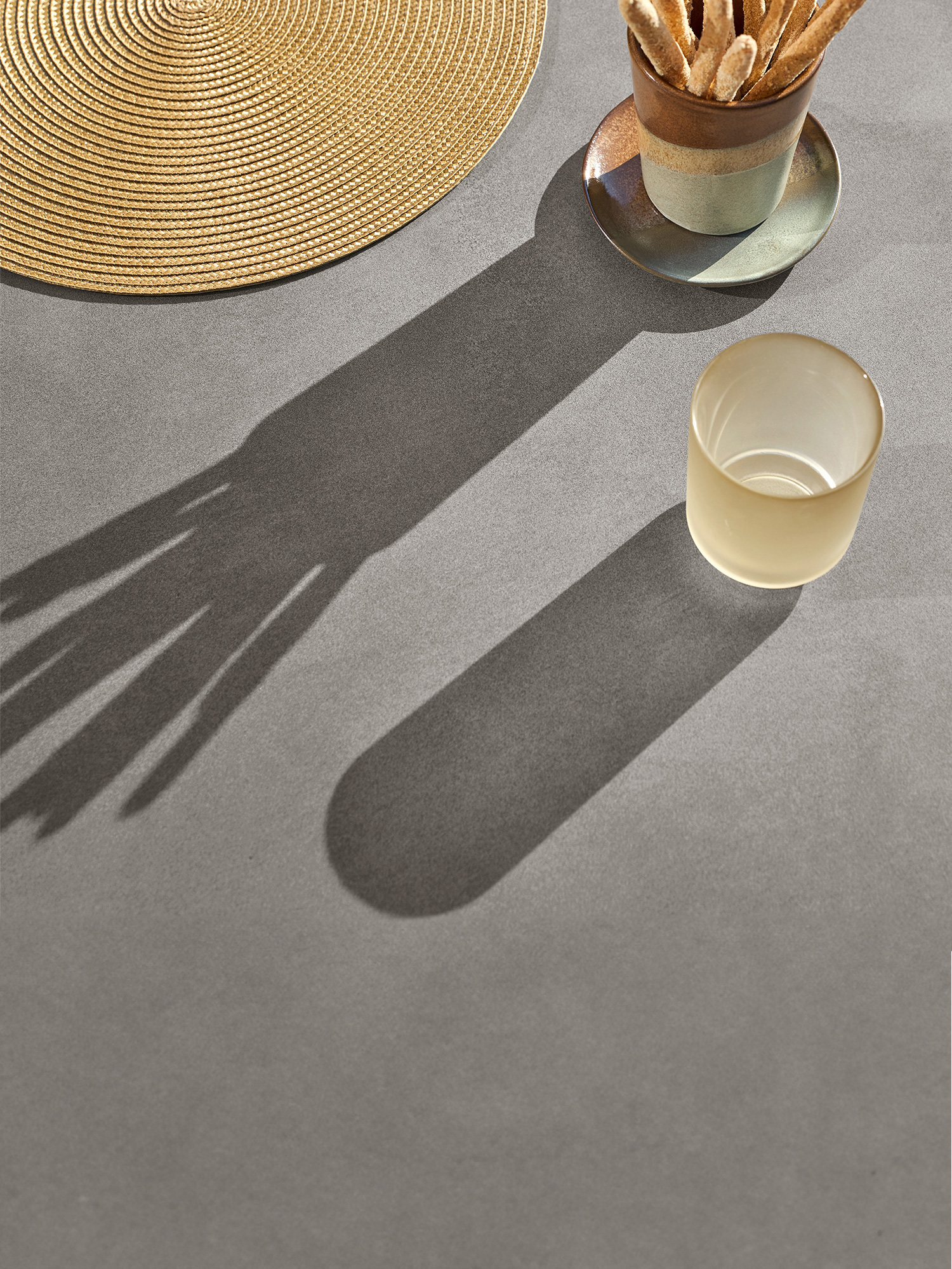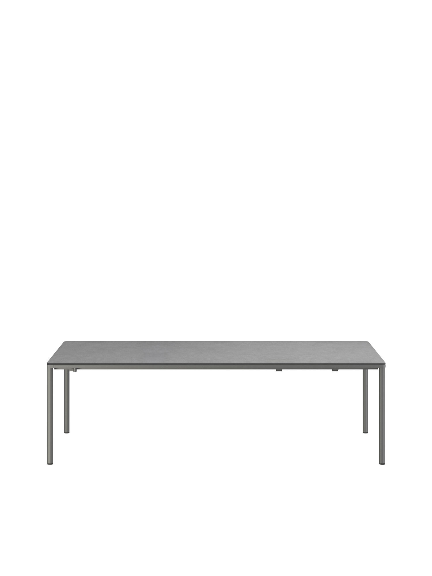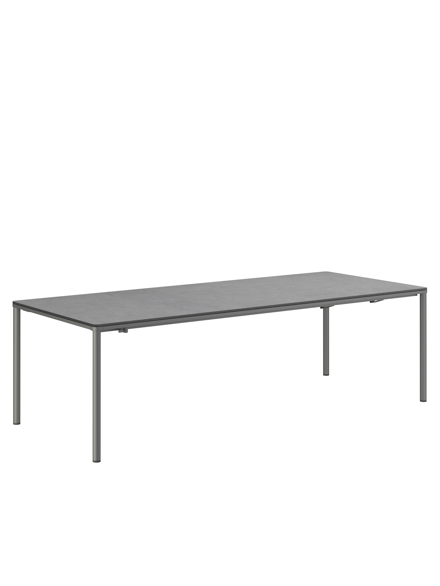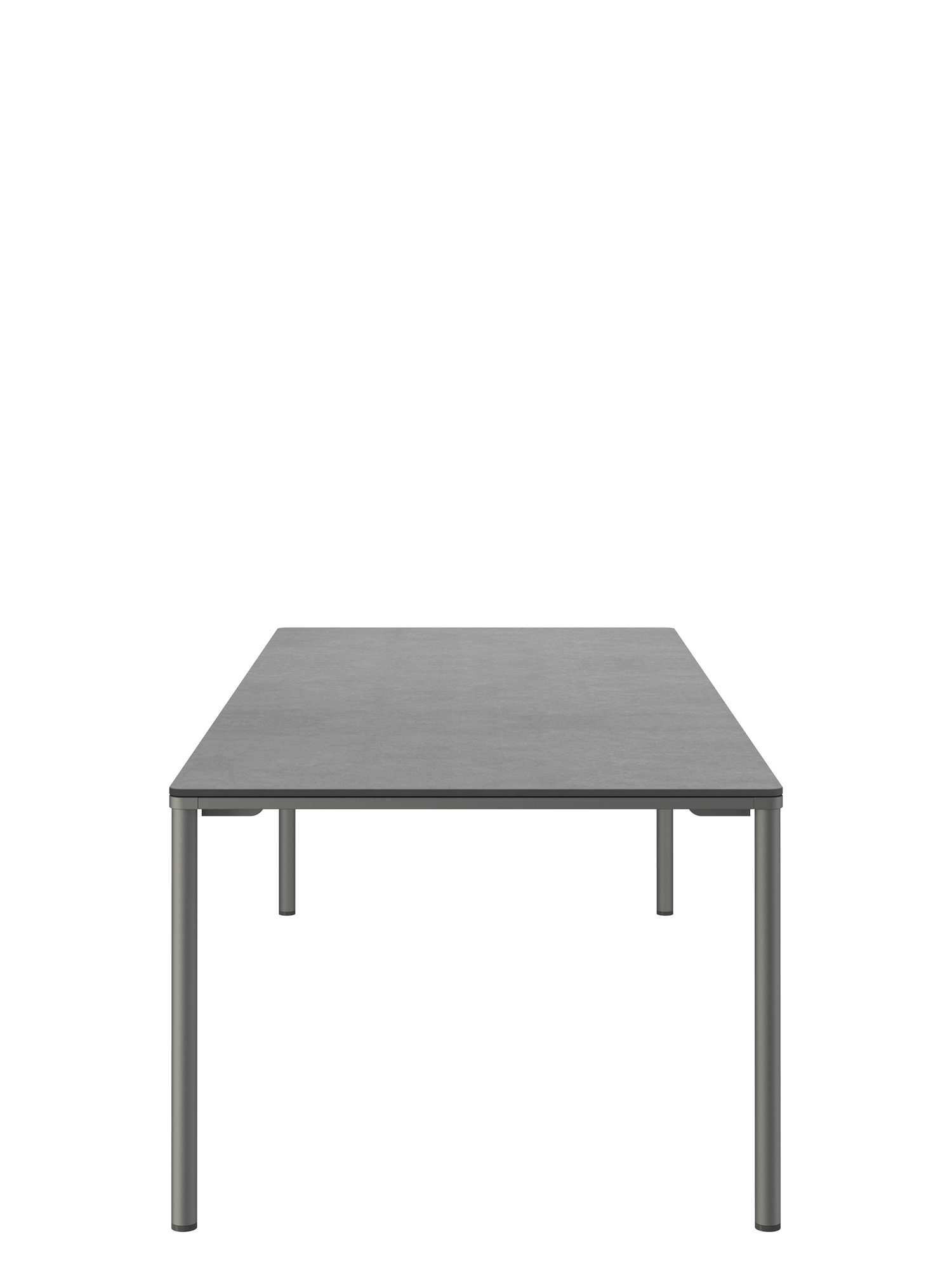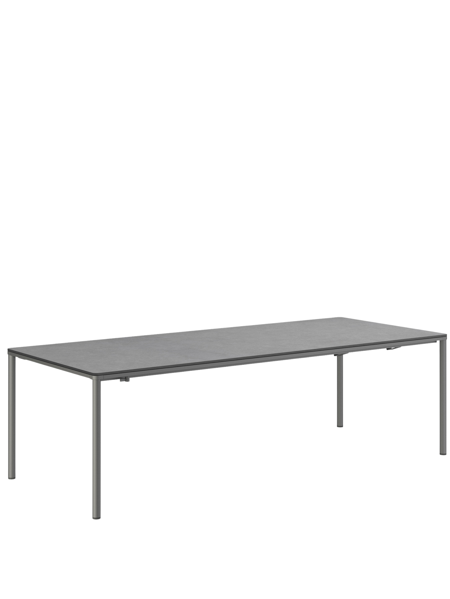 Das graphitgrau pulverbeschichtete Edelstahlgestell der Portland Tische verbindet diese mit allen Stühlen aus gleichem Material. Vier schlanke Beine tragen eine Platte, die mit der Zarge darunter wie aus einem Guss wirkt und in den Ecken der Rundung der Beine folgt. Die Oberfläche besteht aus wetterfestem Kunstharz im Farbton Shade.