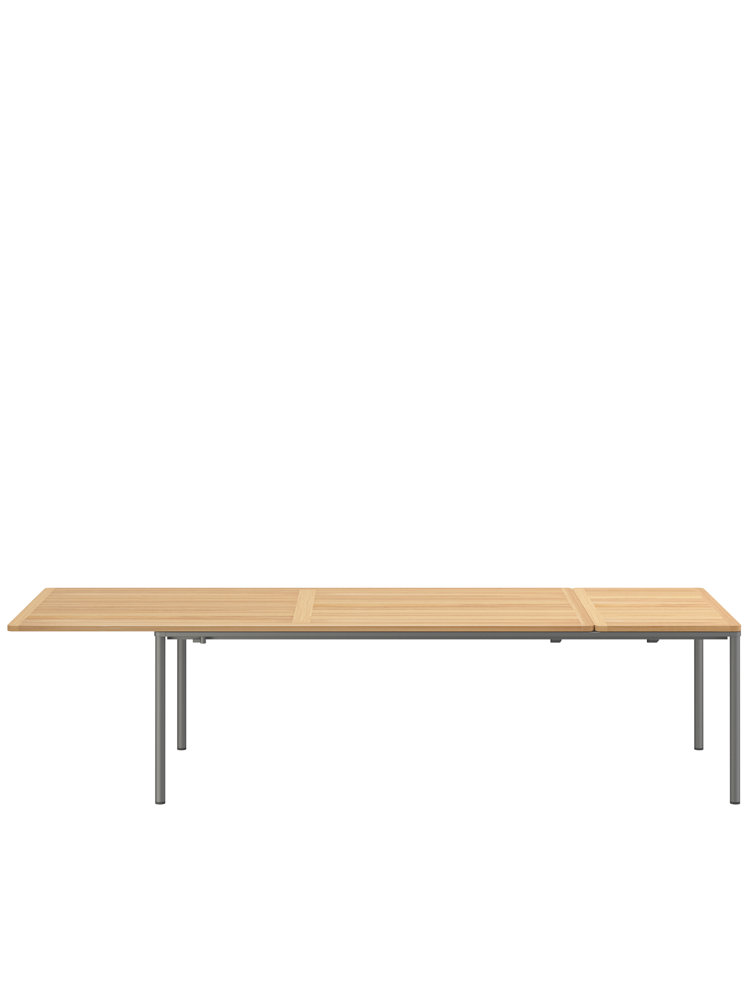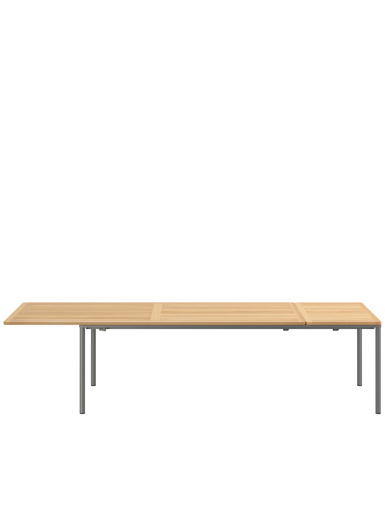 Die innovative und leichtgängige Ausziehmechanik der Portland Tische sorgt für einen fliessenden Übergang vom Tisch zur Tafel. Beim mittleren und grossen Modell der Serie lagert die Einlegeplatte im Tisch, beim kleinen Tisch wird sie in einer separaten Tasche verwahrt. Zur Erweiterung wird die Tischplatte leicht mit wenigen Handgriffen seitlich verschoben. Beim grossen und mittleren Modell wird die Einlegeplatte so positioniert, dass die Tischplatte einen gleichen Überstand zu beiden Seiten hat oder aber auf einer Seite vollständig übersteht. In dieser Variante können alle Gäste längsseits sitzen und Beinfreiheit geniessen. Beim kleinen Tisch ist die Platte immer mittig ausgerichtet.