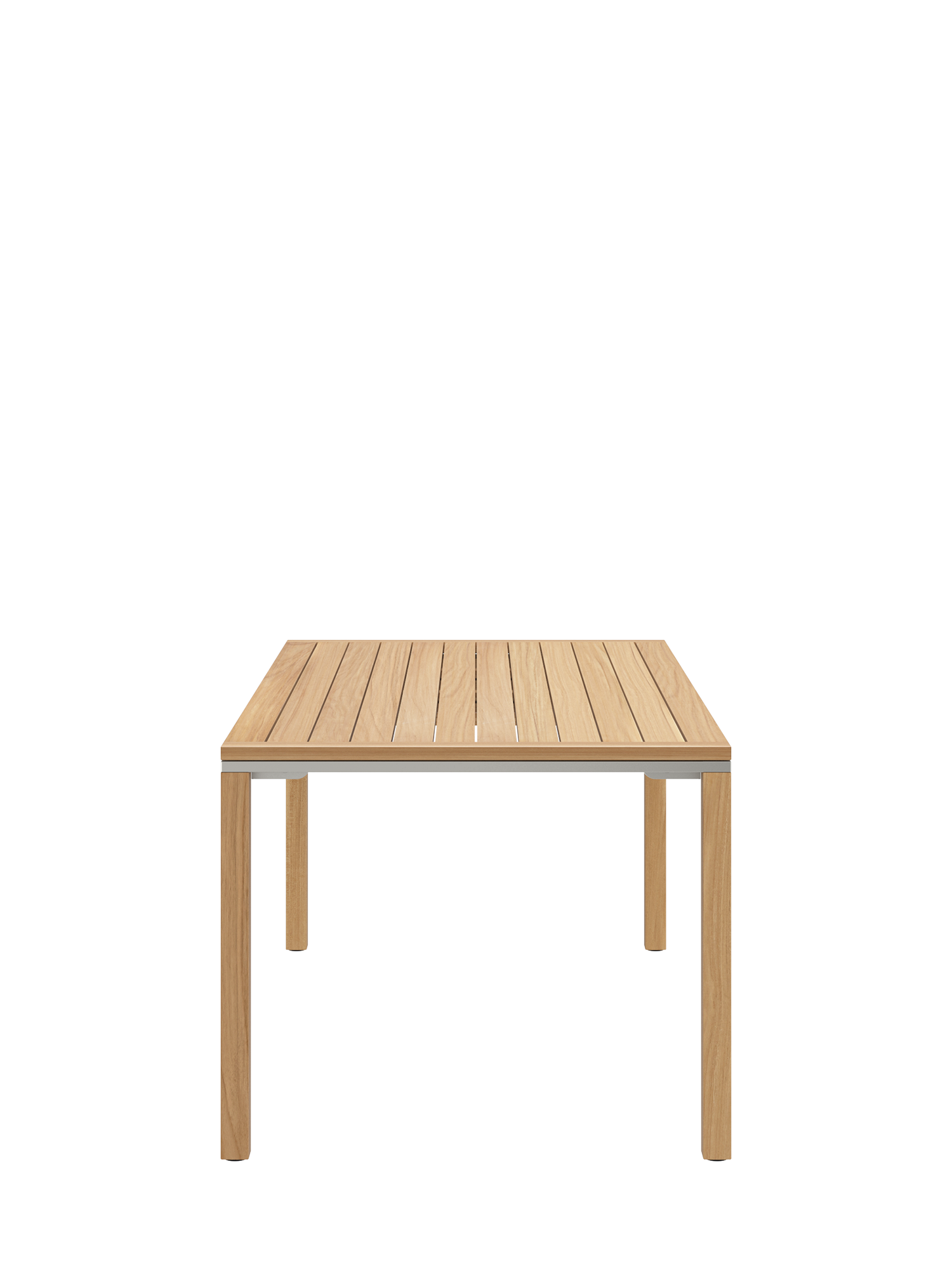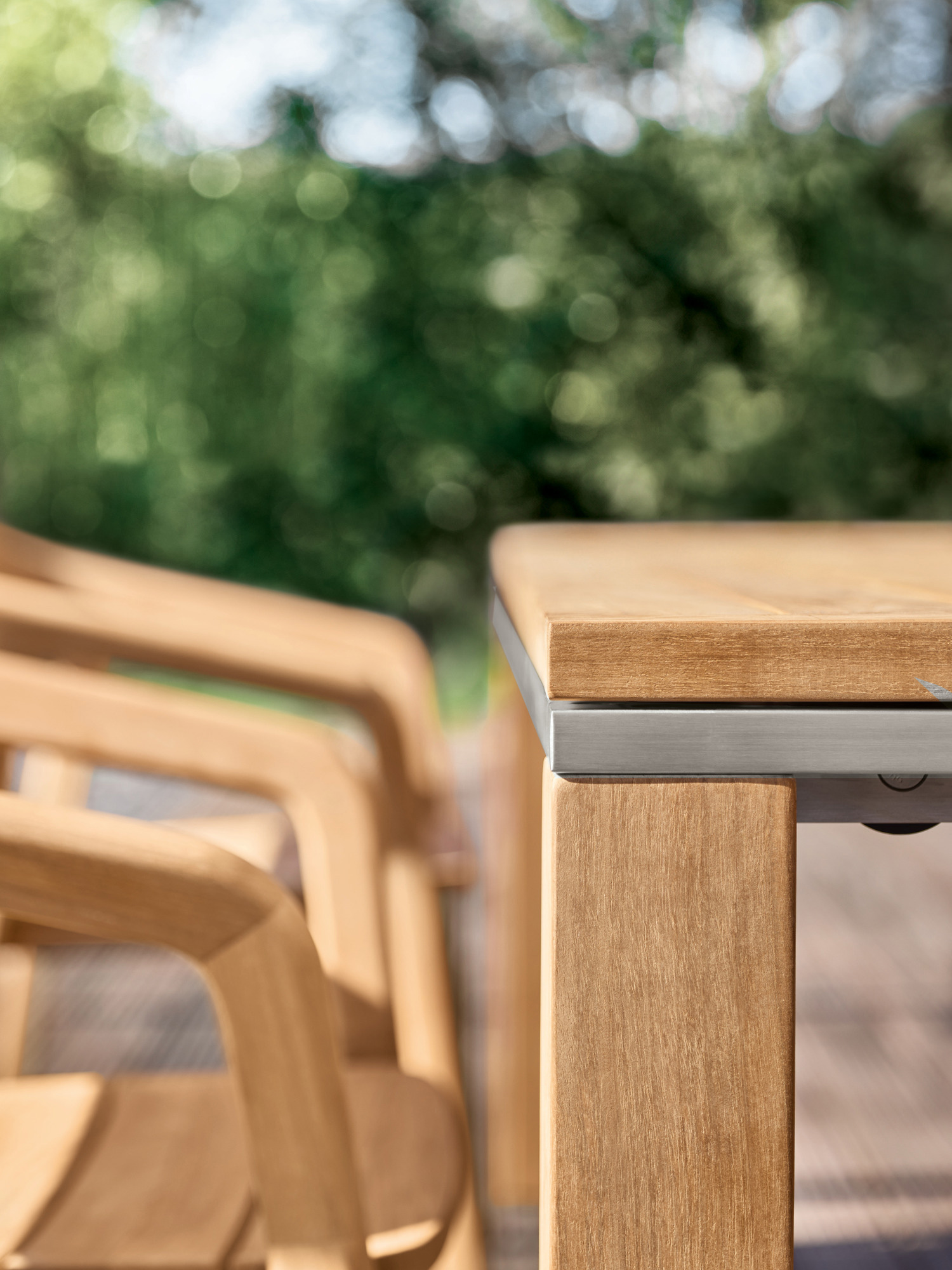 Die geradlinigen Tische verbinden massive Teakleisten mit einer umlaufenden Zarge aus Edelstahl.