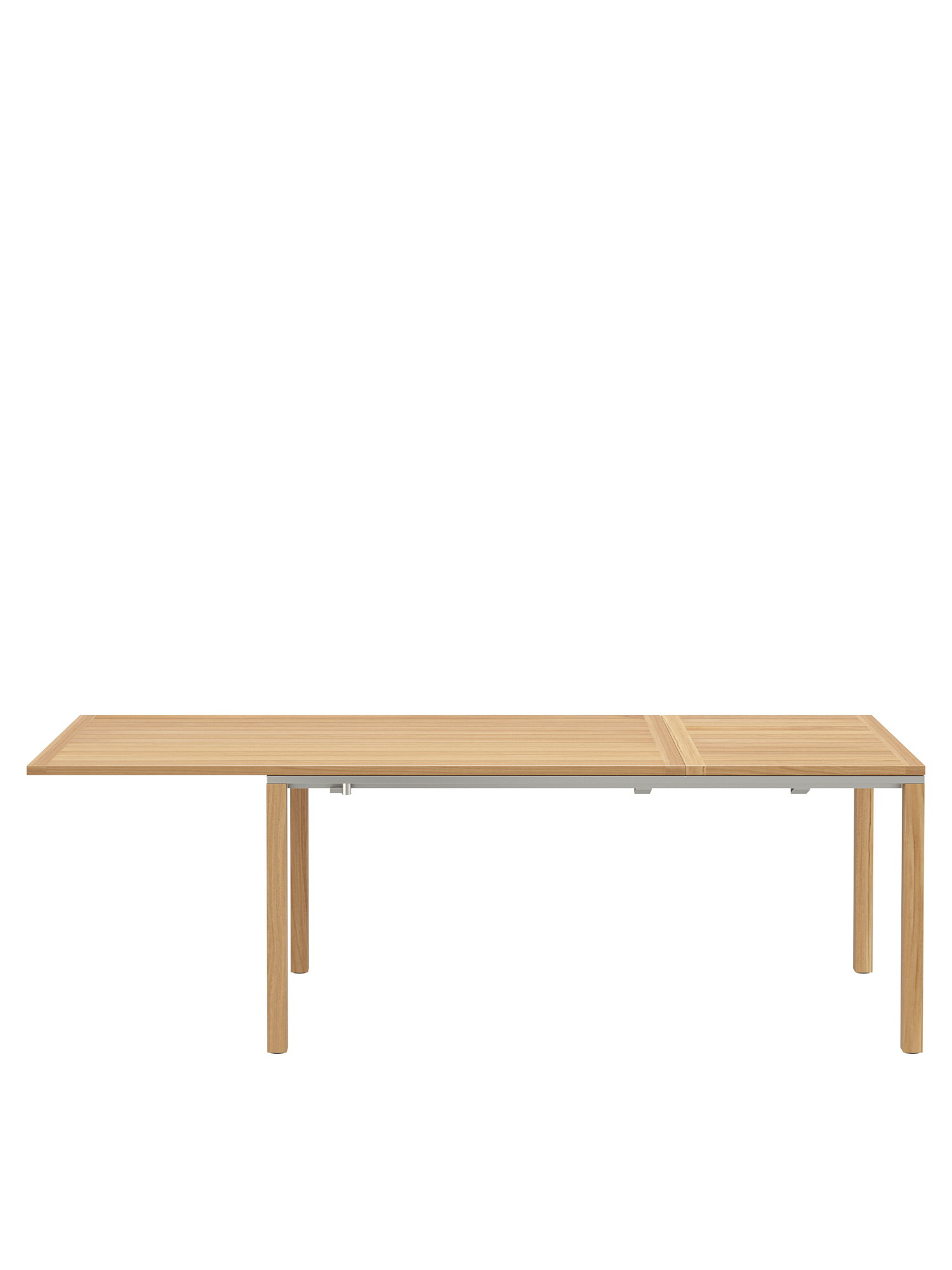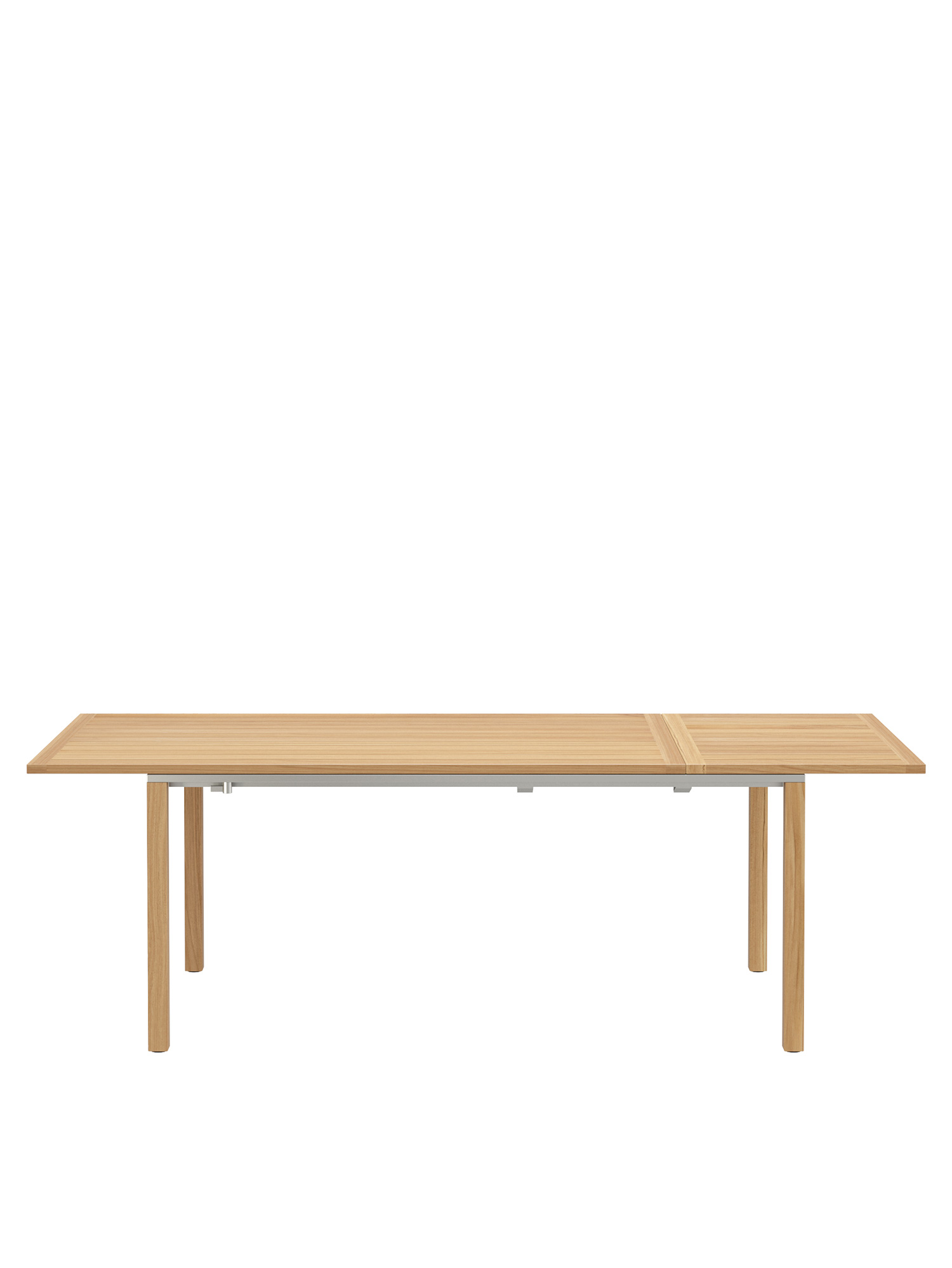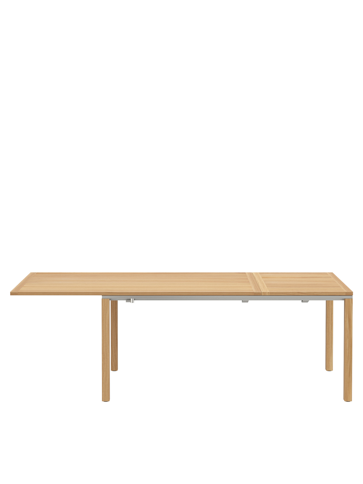 Die innovative und leichtgängige Ausziehmechanik der Portland Tische sorgt für einen fliessenden Übergang vom Tisch zur Tafel. Beim mittleren und grossen Modell der Serie lagert die Einlegeplatte im Tisch, beim kleinen Tisch wird sie in einer separaten Tasche verwahrt. Zur Erweiterung wird die Tischplatte leicht mit wenigen Handgriffen seitlich verschoben. Beim grossen und mittleren Modell wird die Einlegeplatte so positioniert, dass die Tischplatte einen gleichen Überstand zu beiden Seiten hat oder aber auf einer Seite vollständig übersteht. In dieser Variante können alle Gäste längsseits sitzen und Beinfreiheit geniessen. Beim kleinen Tisch ist die Platte immer mittig ausgerichtet.