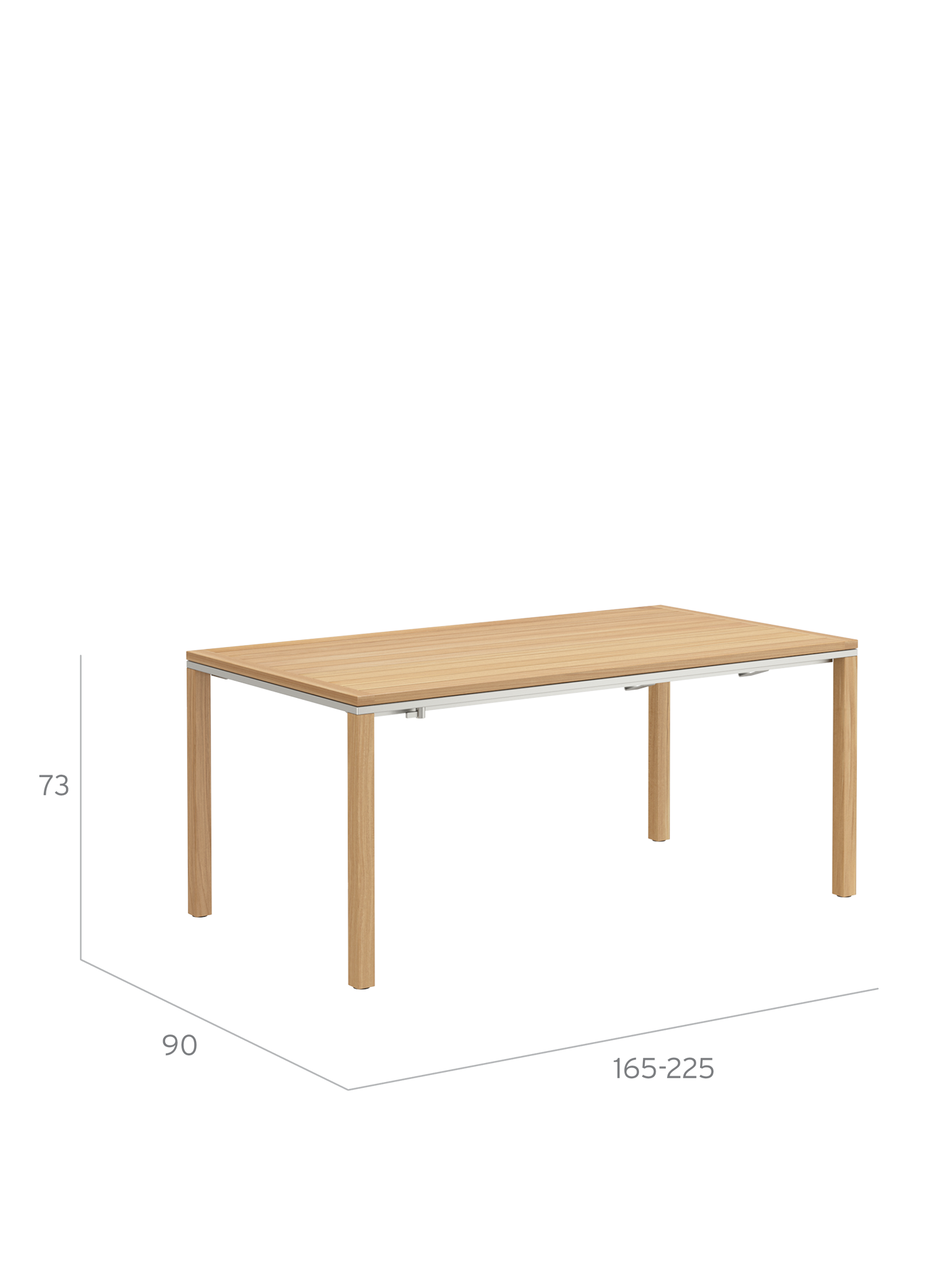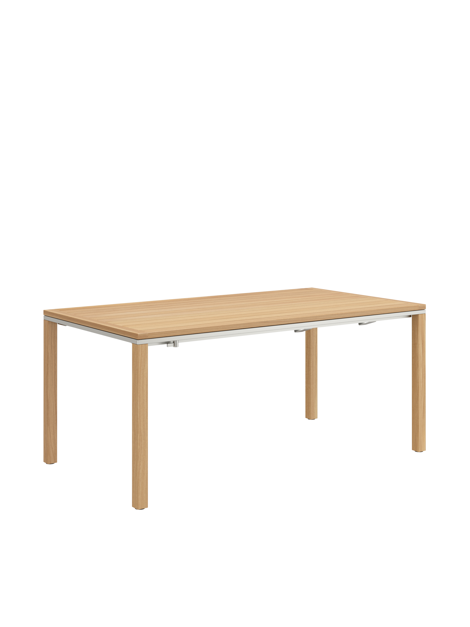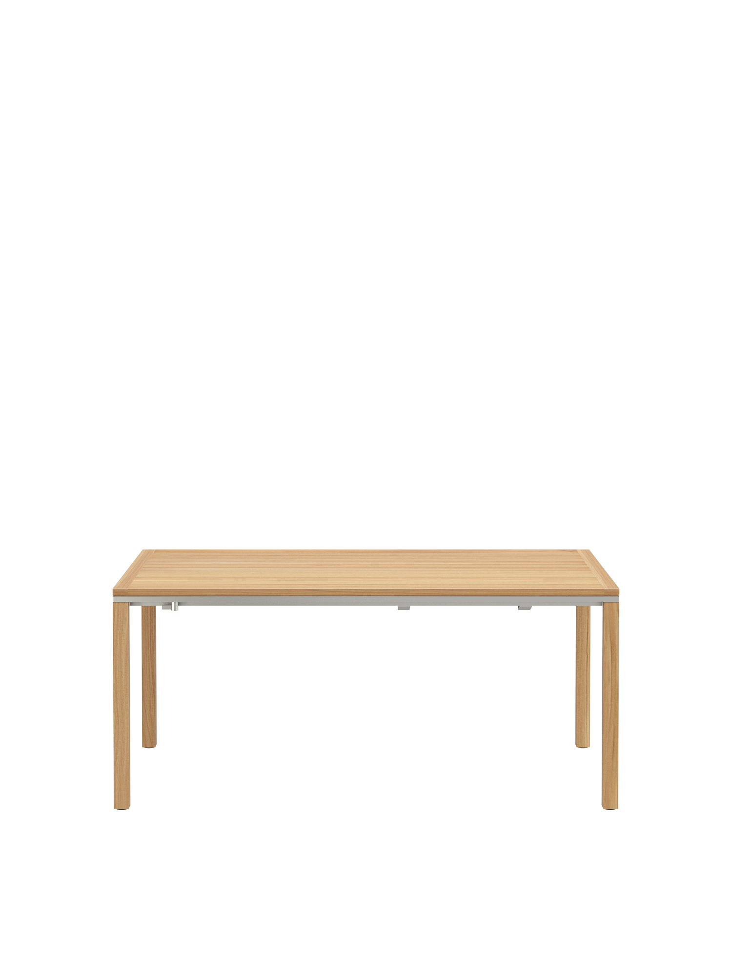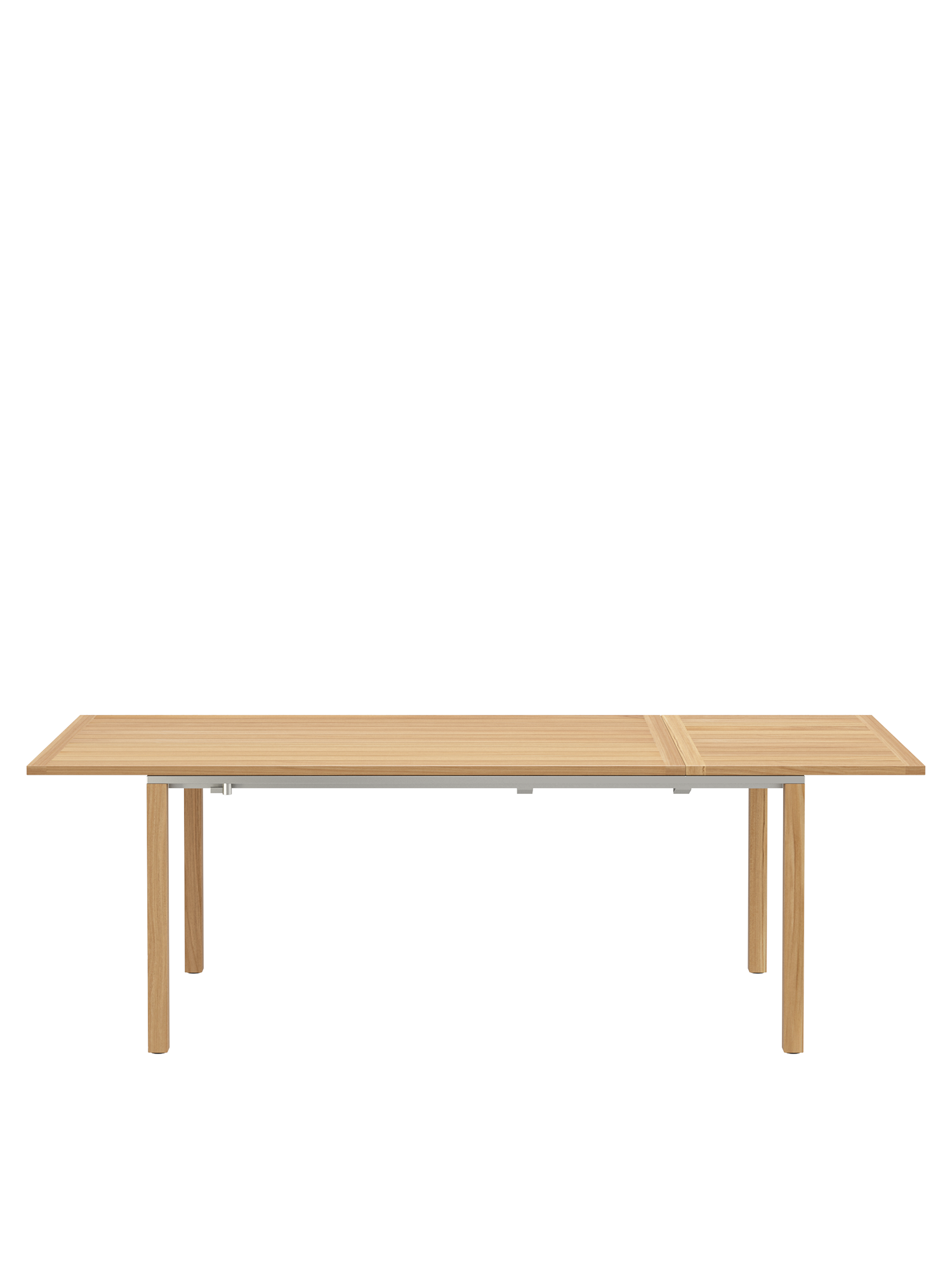 Die innovative und leichtgängige Ausziehmechanik der Portland Tische sorgt für einen fliessenden Übergang vom Tisch zur Tafel. Beim mittleren und grossen Modell der Serie lagert die Einlegeplatte im Tisch, beim kleinen Tisch wird sie in einer separaten Tasche verwahrt. Zur Erweiterung wird die Tischplatte leicht mit wenigen Handgriffen seitlich verschoben. Beim grossen und mittleren Modell wird die Einlegeplatte so positioniert, dass die Tischplatte einen gleichen Überstand zu beiden Seiten hat oder aber auf einer Seite vollständig übersteht. In dieser Variante können alle Gäste längsseits sitzen und Beinfreiheit geniessen. Beim kleinen Tisch ist die Platte immer mittig ausgerichtet.
