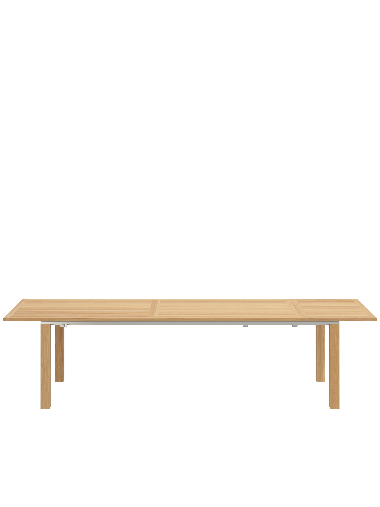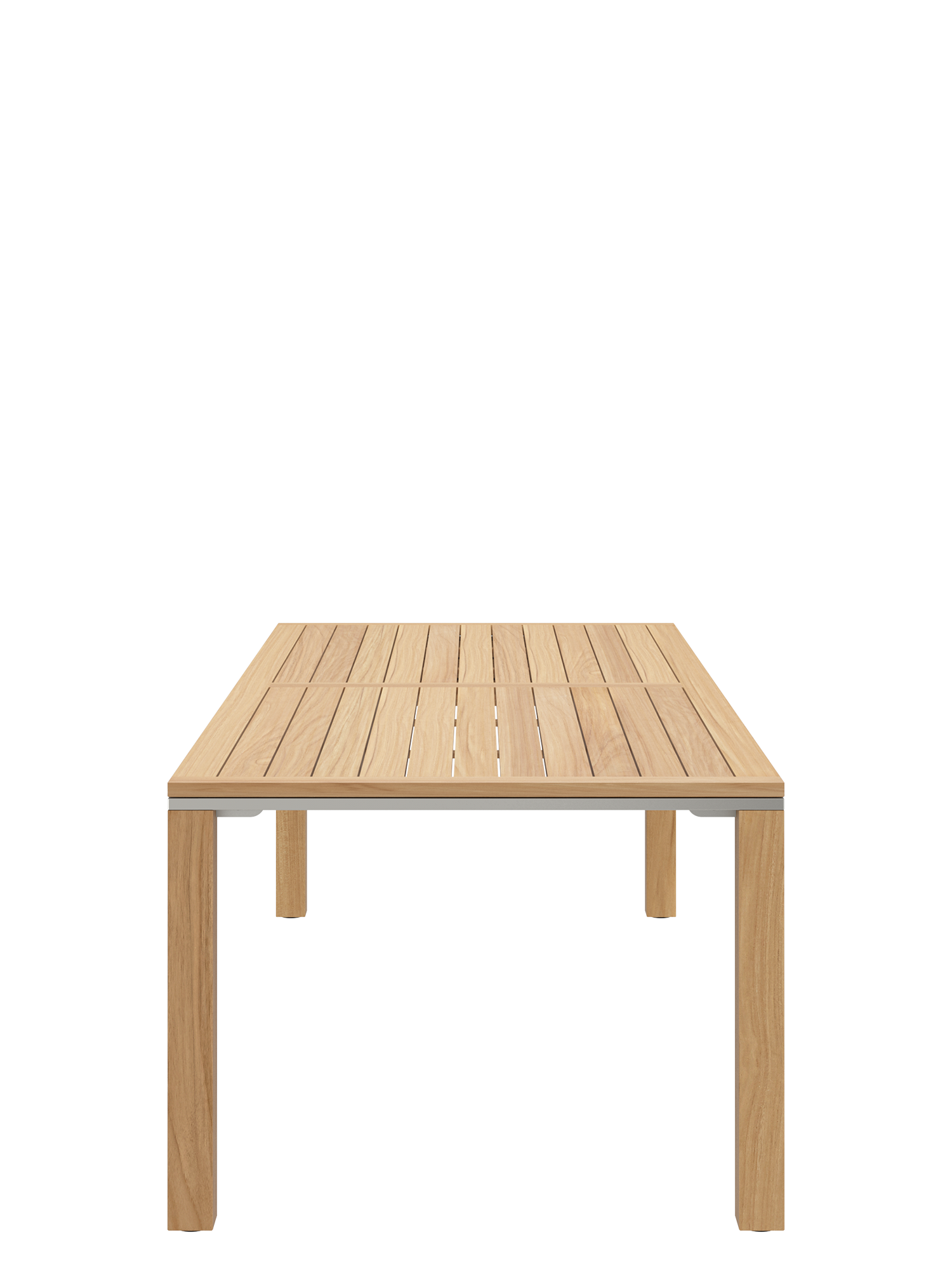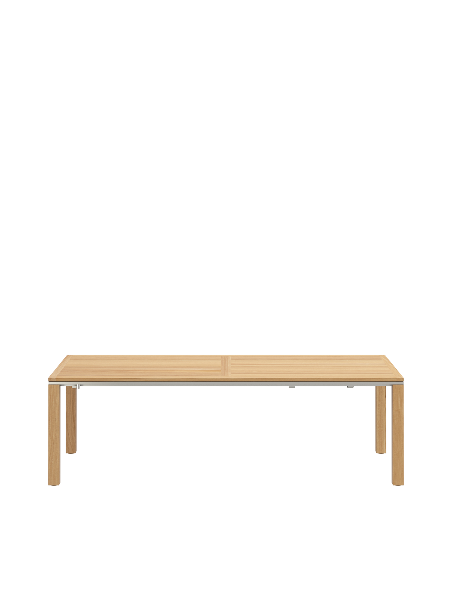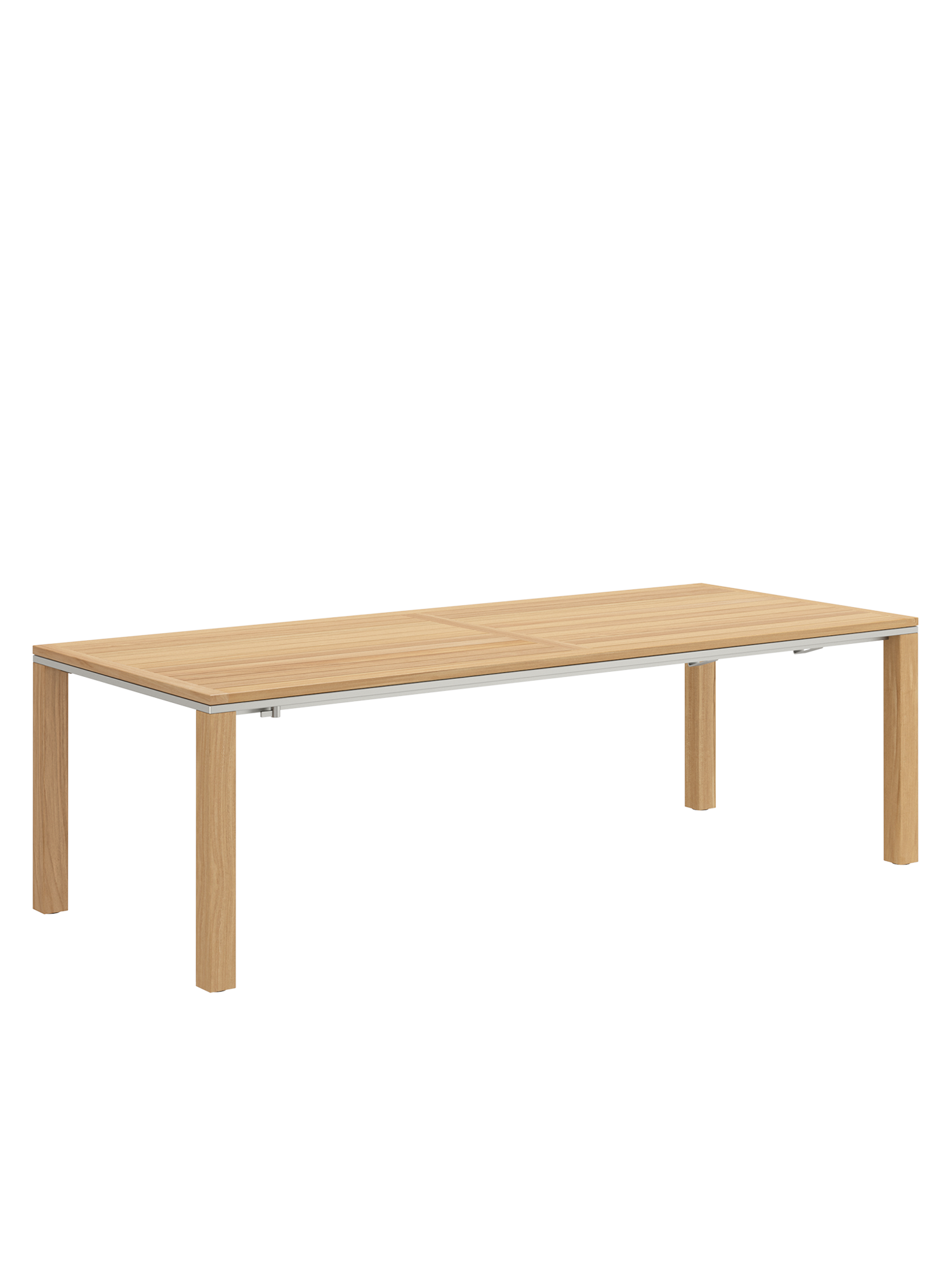Die geradlinigen Tische verbinden massive Teakleisten mit einer umlaufenden Zarge aus Edelstahl.