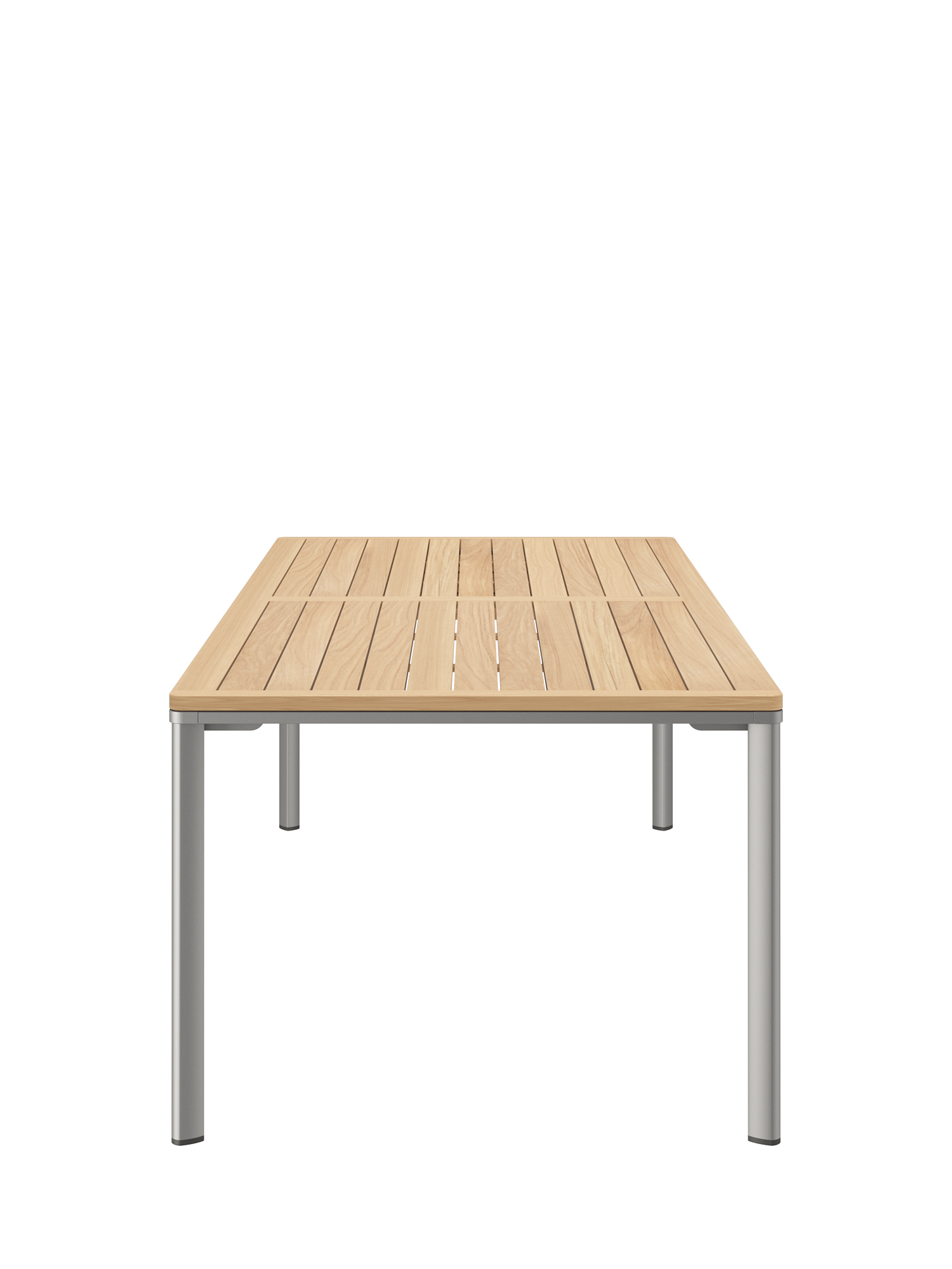 Ein eloxiertes Aluminiumgestell und eine umlaufende Zarge mit sanfter Rundung tragen die Oberfläche aus hochwertigem Teakholz. Die wetterfeste Materialkombination verbindet den Portland Tisch mit ausgewählten Möbeln der Monterey Kollektion. Um den Tisch, der Platz für bis zu zehn Personen verspricht, können sich beispielsweise eine Bank, vier Armlehnstühle und vier Recliner gruppieren.