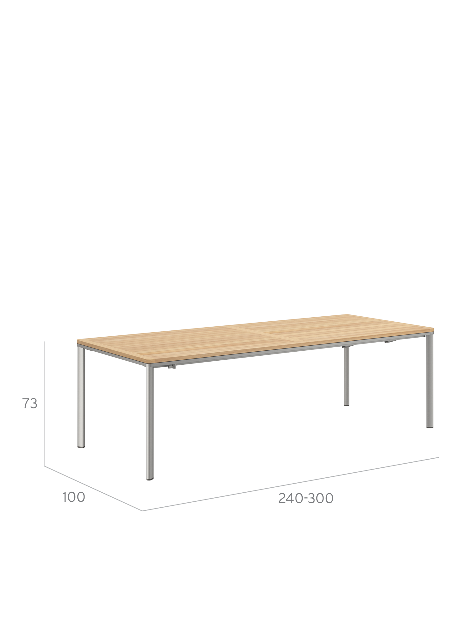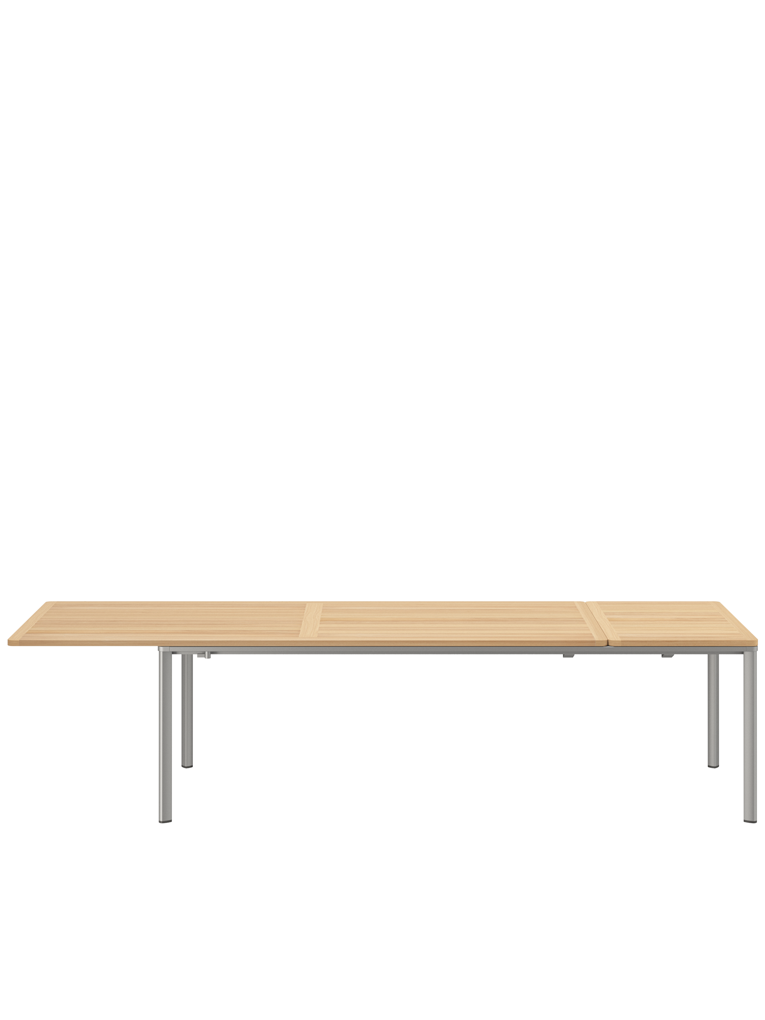 Die innovative und leichtgängige Ausziehmechanik des Portland Tisches sorgt für einen fliessenden Übergang vom Tisch zur Tafel. Die Einlegeplatte lagert im Tisch. Zur Erweiterung wird die Tischplatte leicht mit wenigen Handgriffen seitlich verschoben. Die Einlegeplatte wird so positioniert, dass die Tischplatte einen gleichen Überstand zu beiden Seiten hat oder aber auf einer Seite vollständig übersteht. In dieser Variante können alle Gäste längsseits sitzen und Beinfreiheit geniessen.