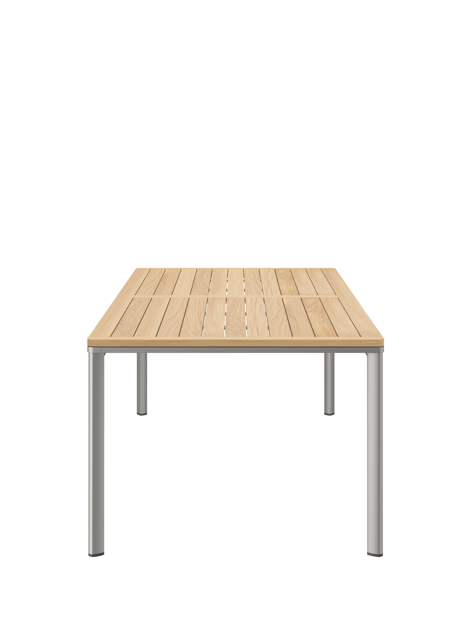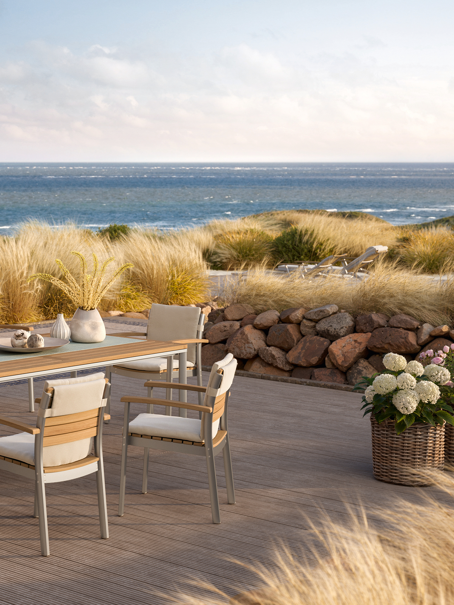 Ein eloxiertes Aluminiumgestell und eine umlaufende Zarge mit sanfter Rundung tragen die Oberfläche aus hochwertigem Teakholz. Die wetterfeste Materialkombination verbindet den Portland Tisch mit ausgewählten Möbeln der Monterey Kollektion. Um den Tisch, der Platz für bis zu acht Personen verspricht, können sich beispielsweise eine Bank, vier Armlehnstühle und zwei Recliner gruppieren.