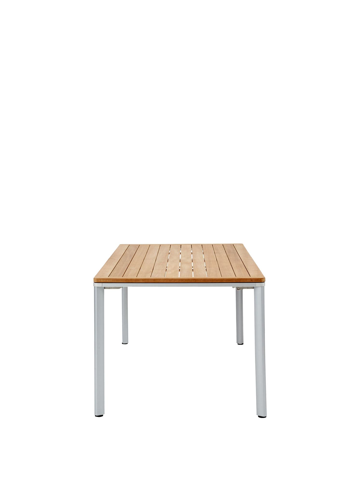 Eine umlaufende Zarge mit sanfter Rundung prägt das Design der vierbeinigen Portland Tische. Dabei lässt sie genügend Raum, um auch Stühle mit Armlehnen unter die Tischplatte zu schieben. Mit einer Tischoberfläche aus Teakleisten und einem Aluminiumgestell sind sie stilsichere Begleiter zu Stühlen der Serie Monterey.