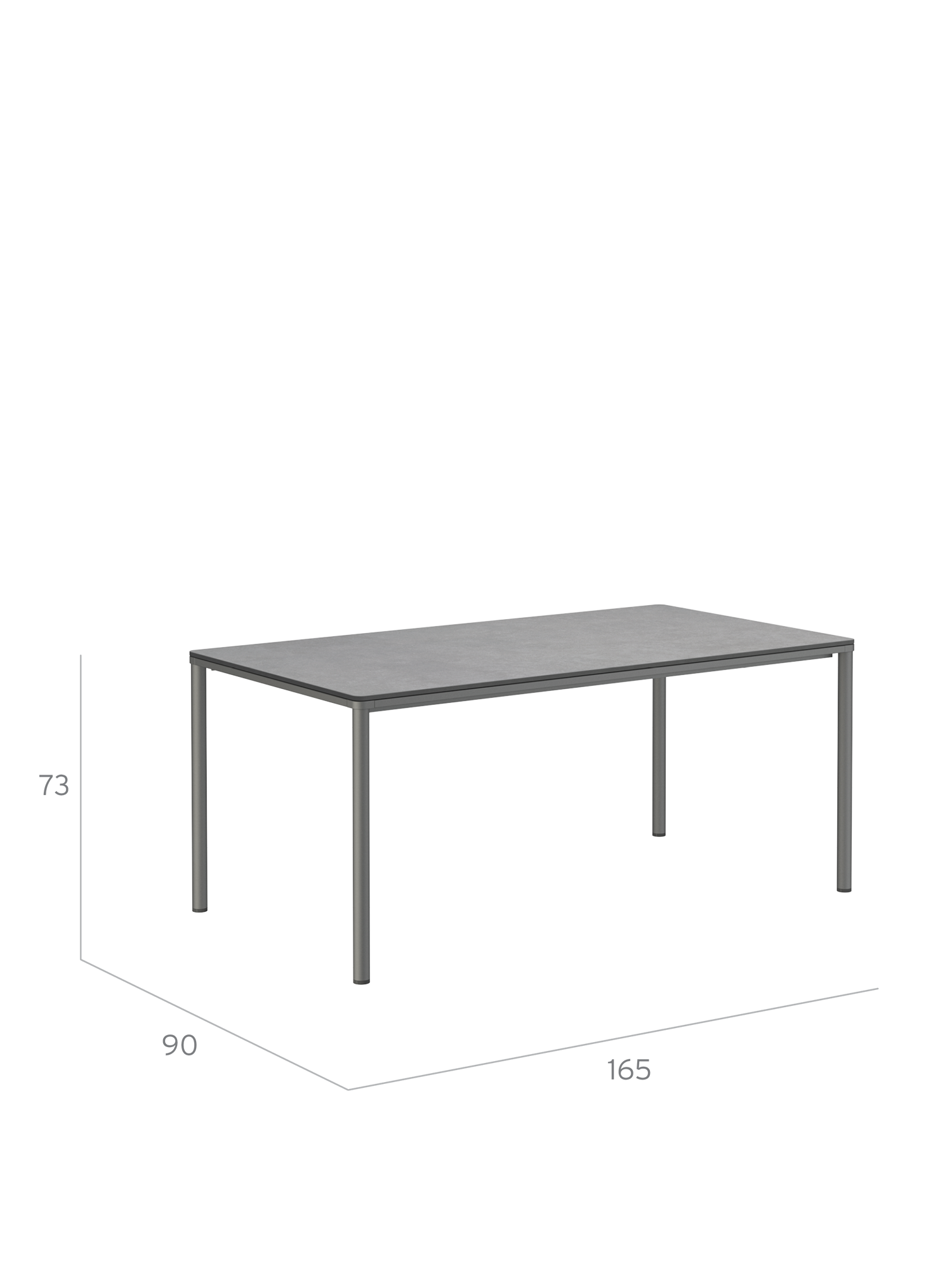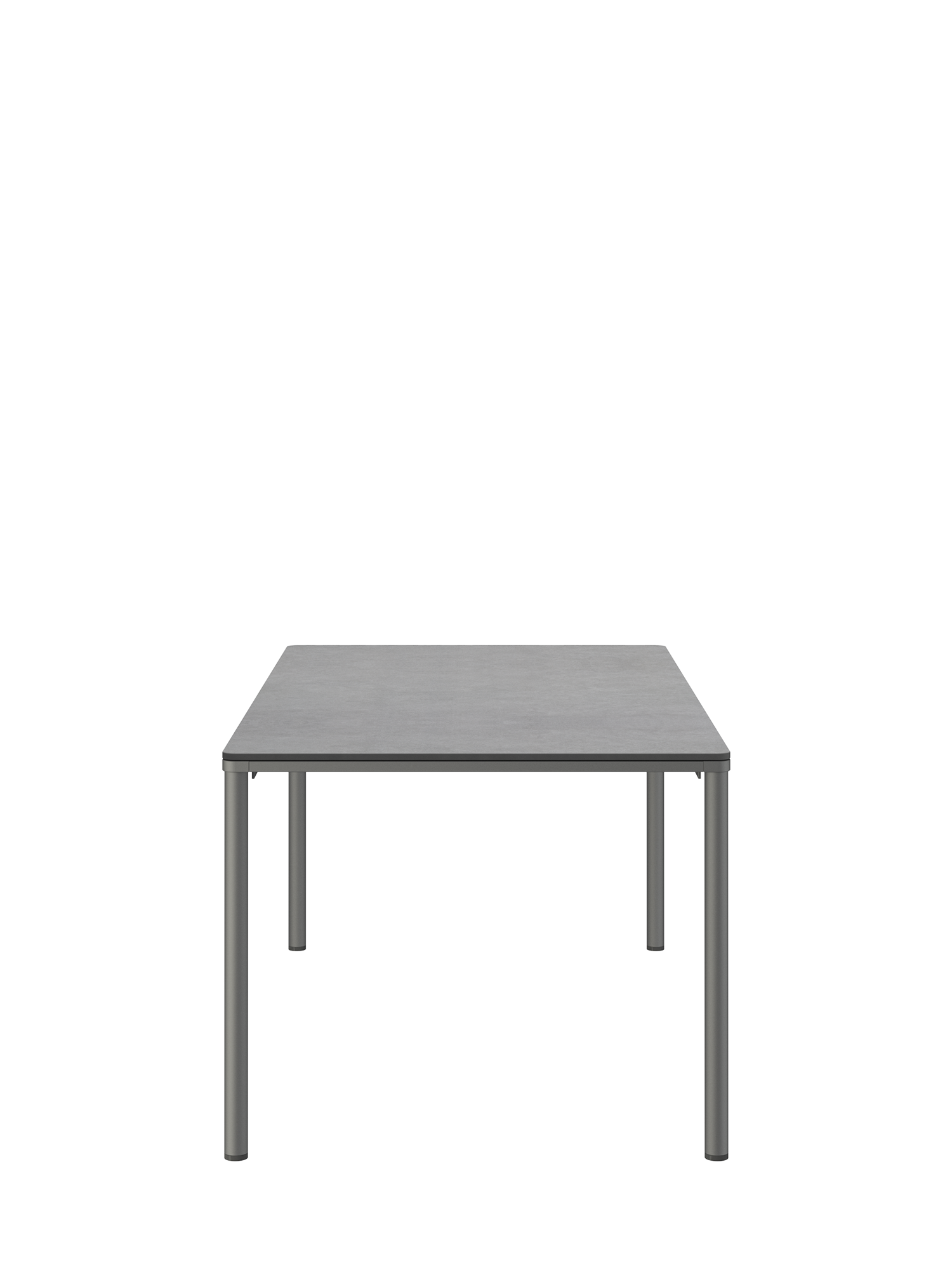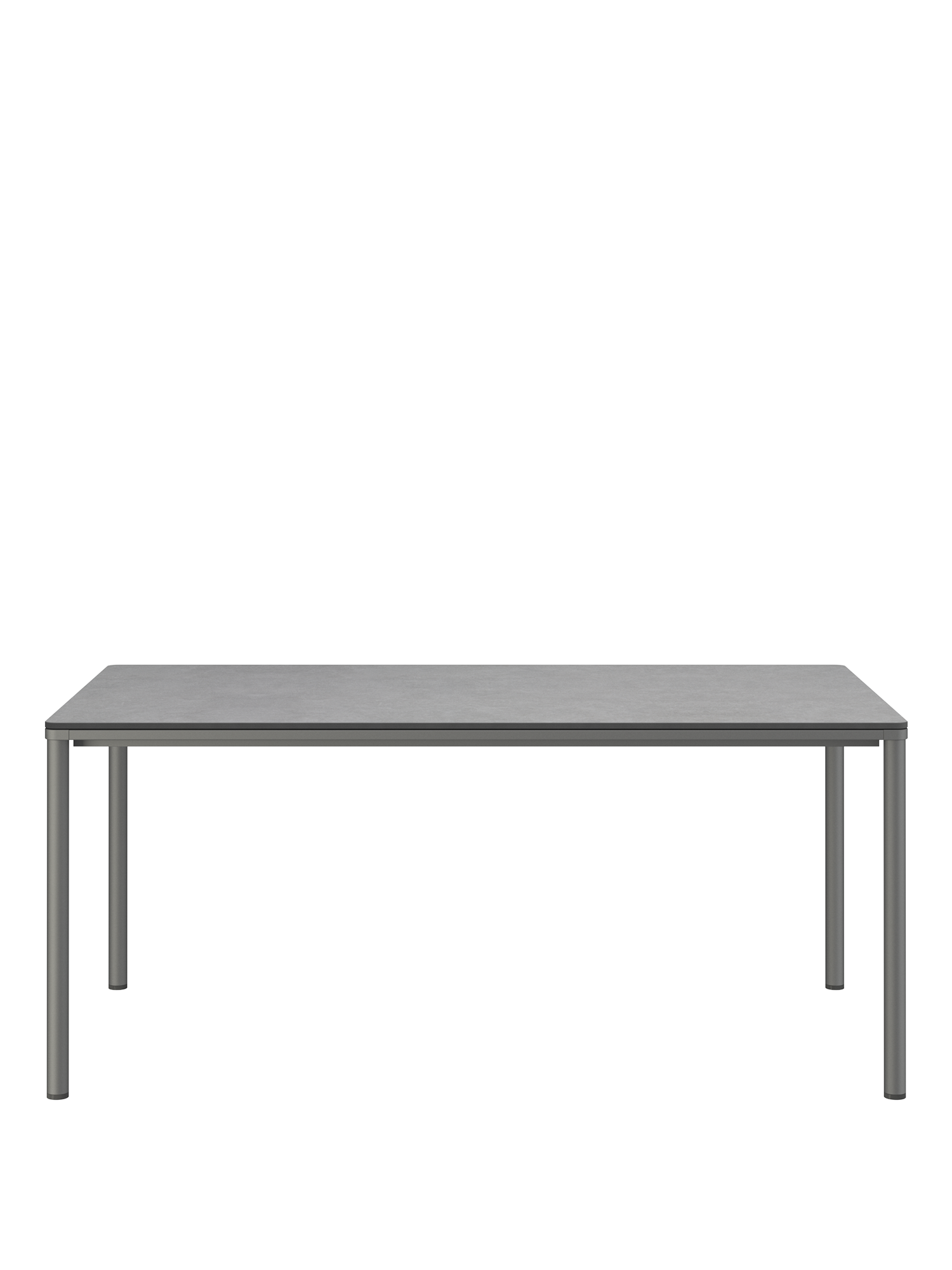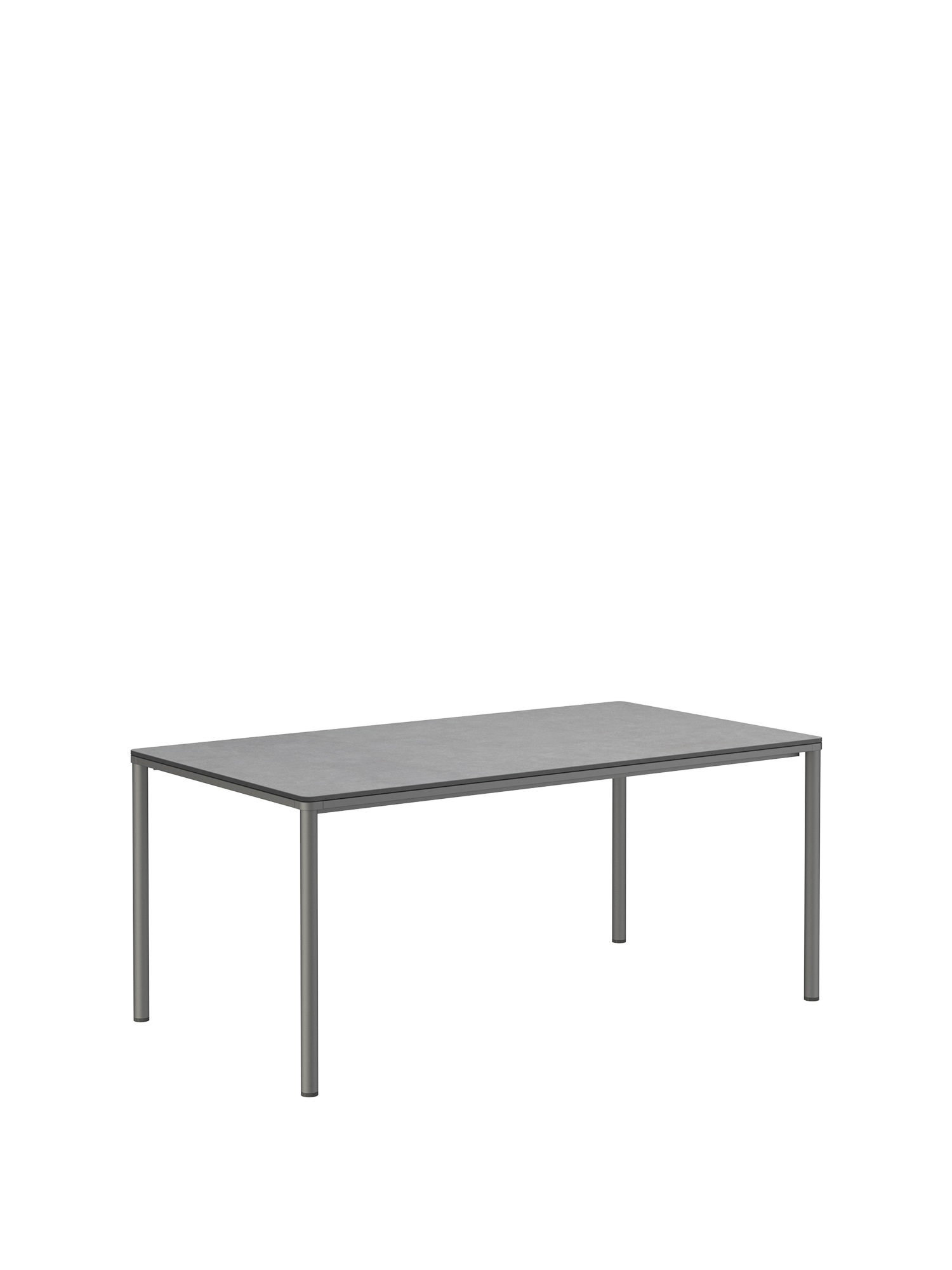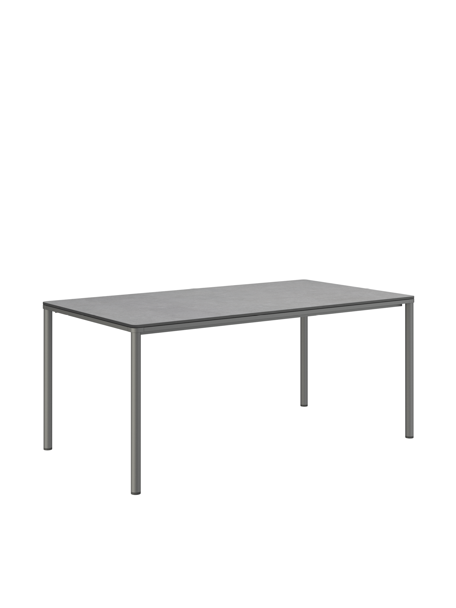 Das graphitgrau pulverbeschichtete Edelstahlgestell der Portland Tische verbindet diese mit allen Stühlen aus gleichem Material. Vier schlanke Beine tragen eine Platte, die mit der Zarge darunter wie aus einem Guss wirkt und in den Ecken der Rundung der Beine folgt. Die Oberfläche besteht aus hochwertigem Kunstharz.