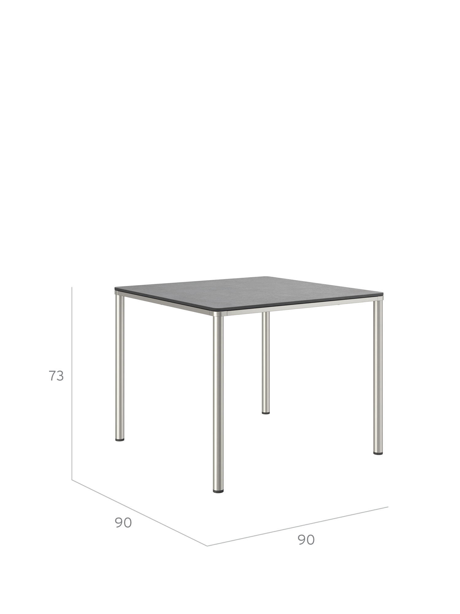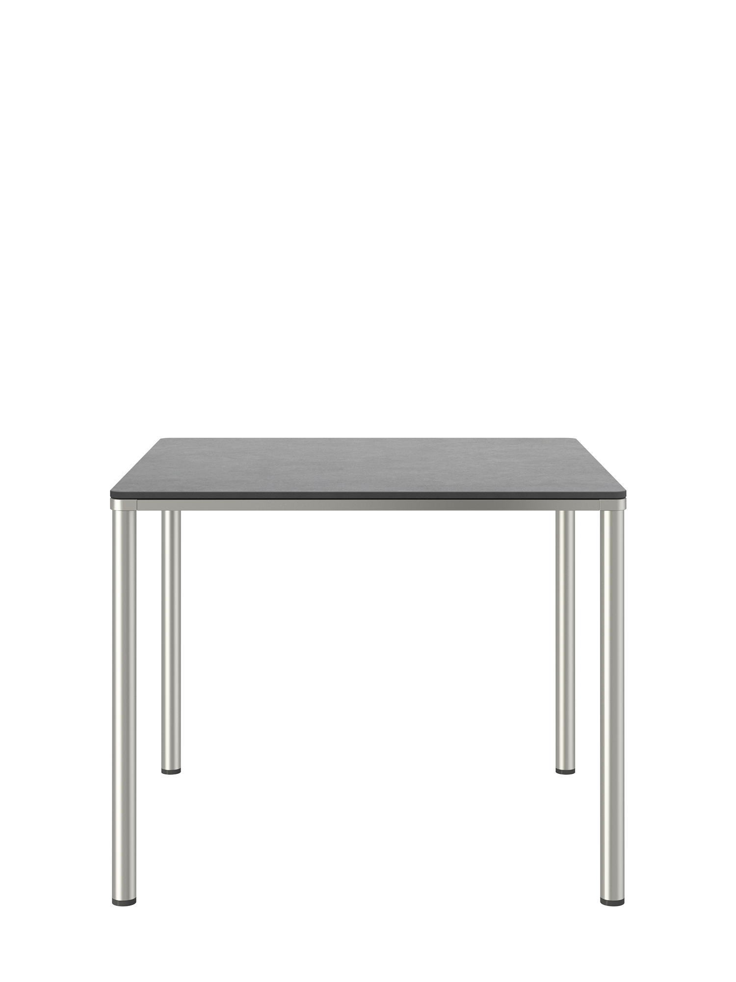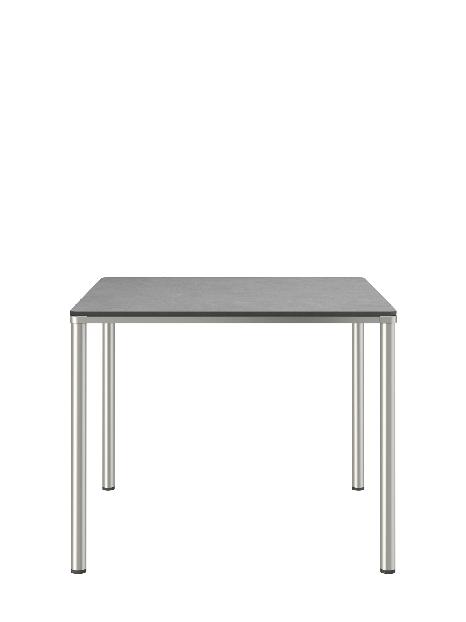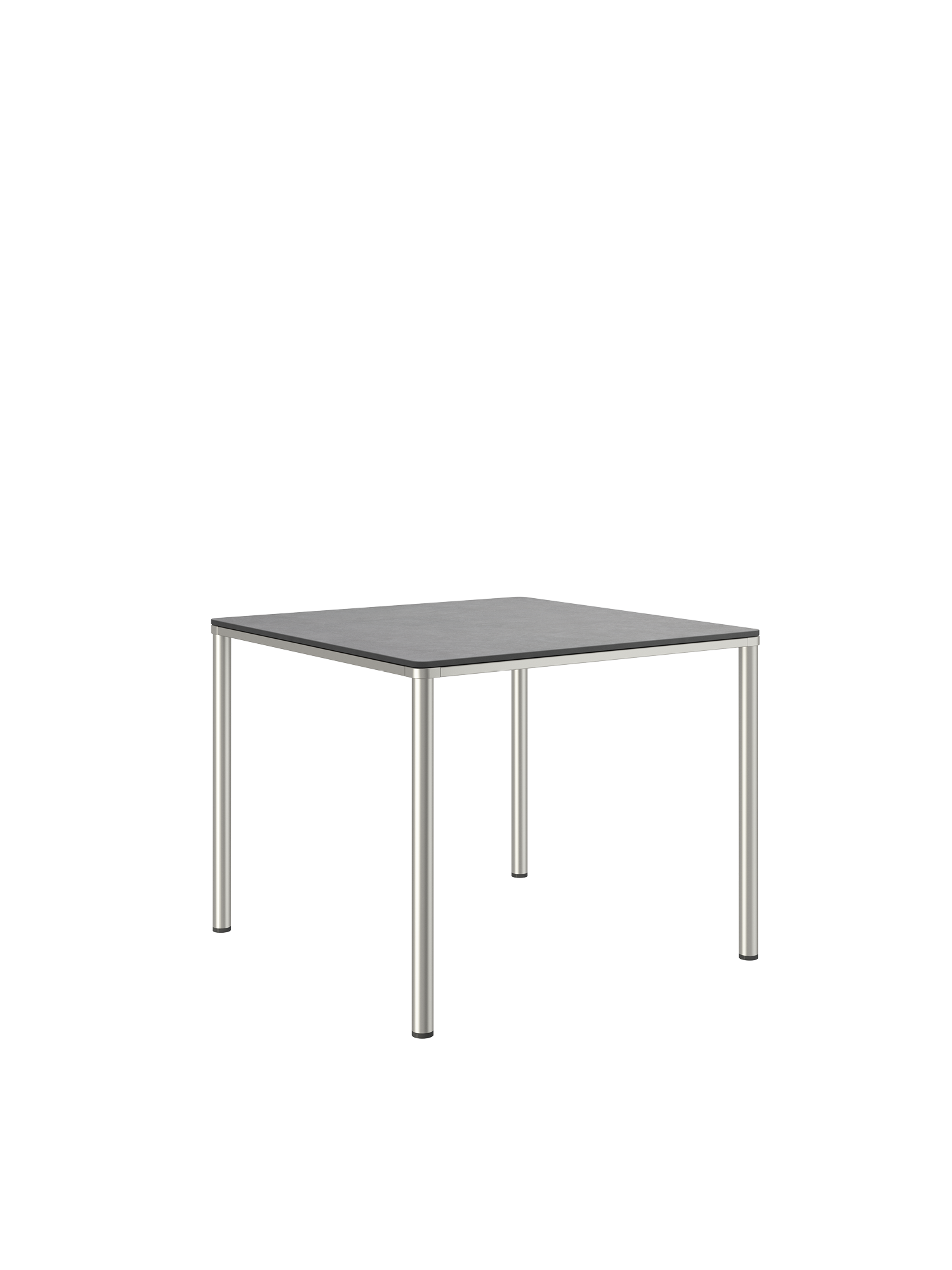 Das Edelstahlgestell der Portland Tische verbindet diese mit allen Stühlen aus gleichem Material. Vier schlanke Beine tragen eine Platte, die mit der Zarge darunter wie aus einem Guss wirkt und in den Ecken der Rundung der Beine folgt. Die Oberfläche besteht aus wetterfestem Kunstharz im dunklen Farbton Shade.