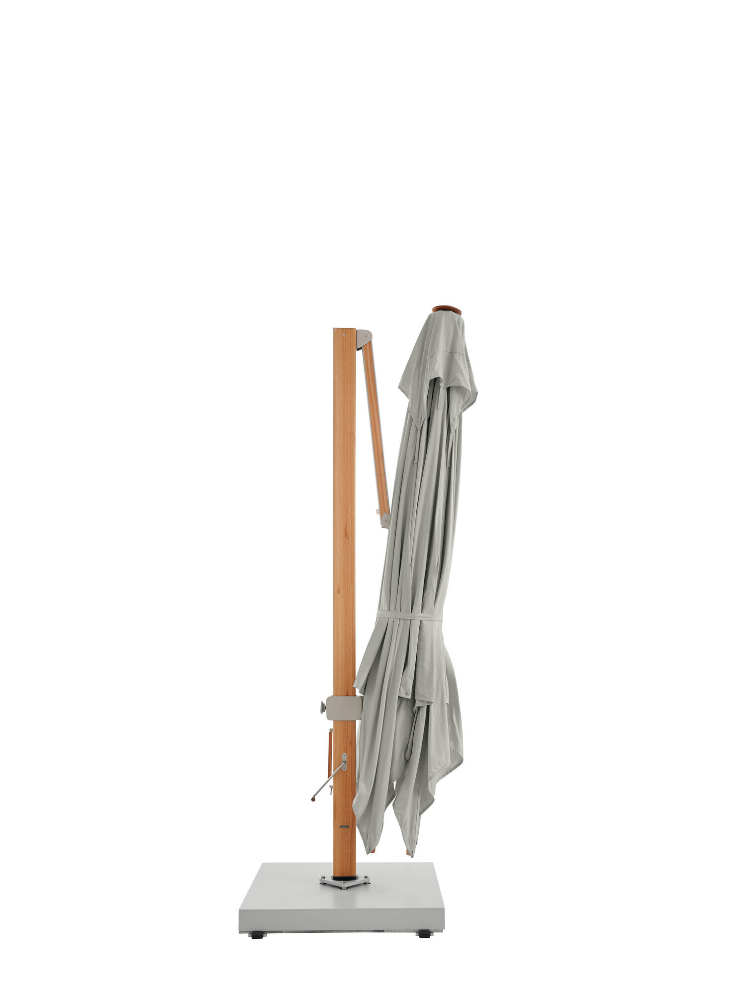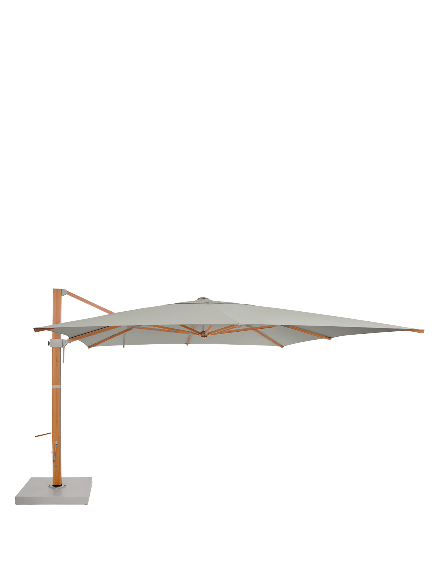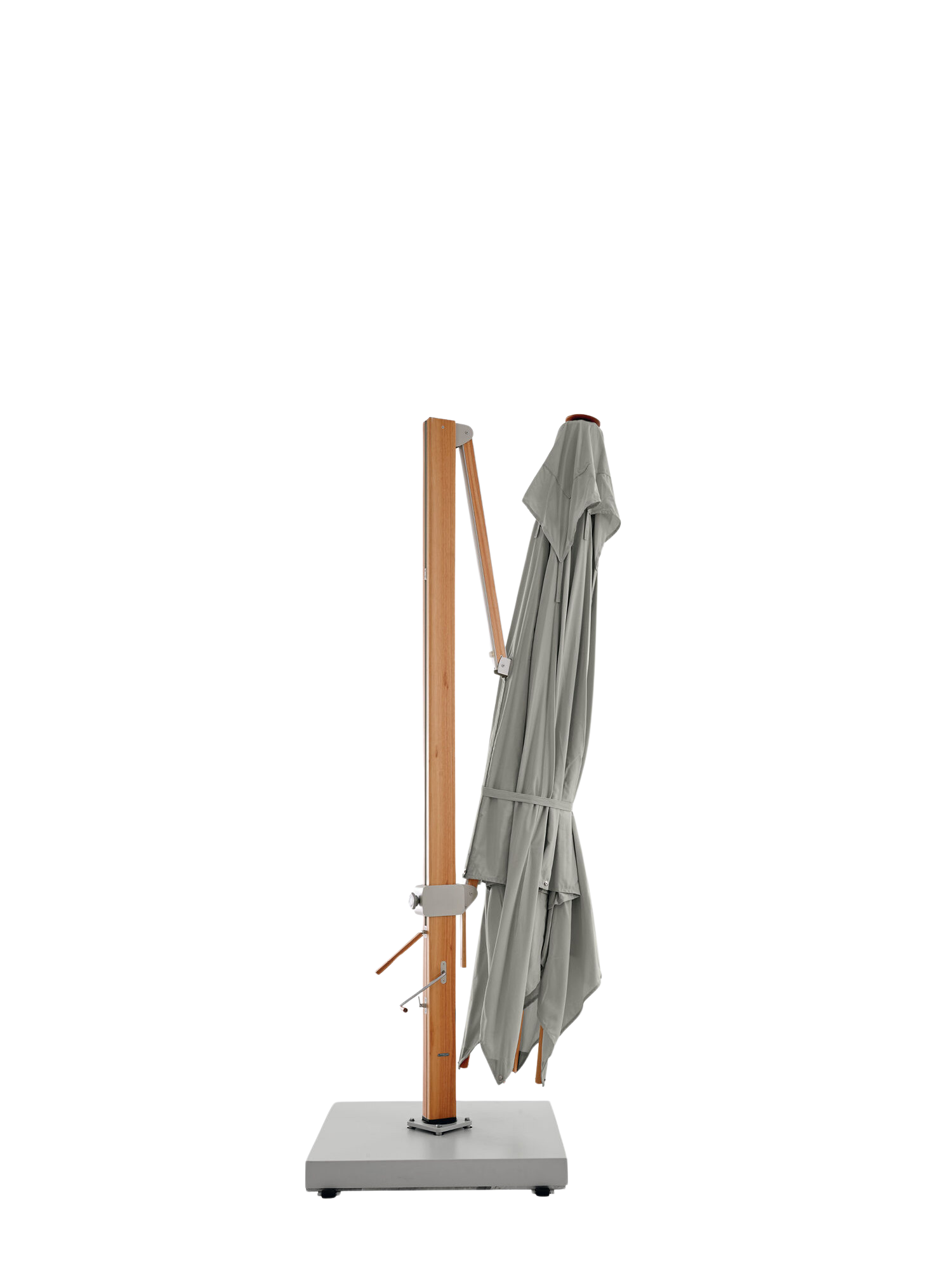 Perspektiven auf den Sommer: Der weit ausladende Schirm mit seitlichem Mast lässt sich aus der Vertikalen neigen, um die eigene Achse drehen und in acht Positionen arretieren. Sein grosszügiges Dach aus imprägniertem Polyacryl im Farbton Silbergrau bietet zuverlässigen Schutz vor der Sonne und hütet am Abend noch lange die Wärme eines Sommertages. Die komfortable Mechanik des hochwertigen Teakmastes wird mit Kurbel und Seilzug bedient. Festen Halt findet der Schirm im passenden Ständer, der eigens für die Positano Kollektion konzipiert wurde.