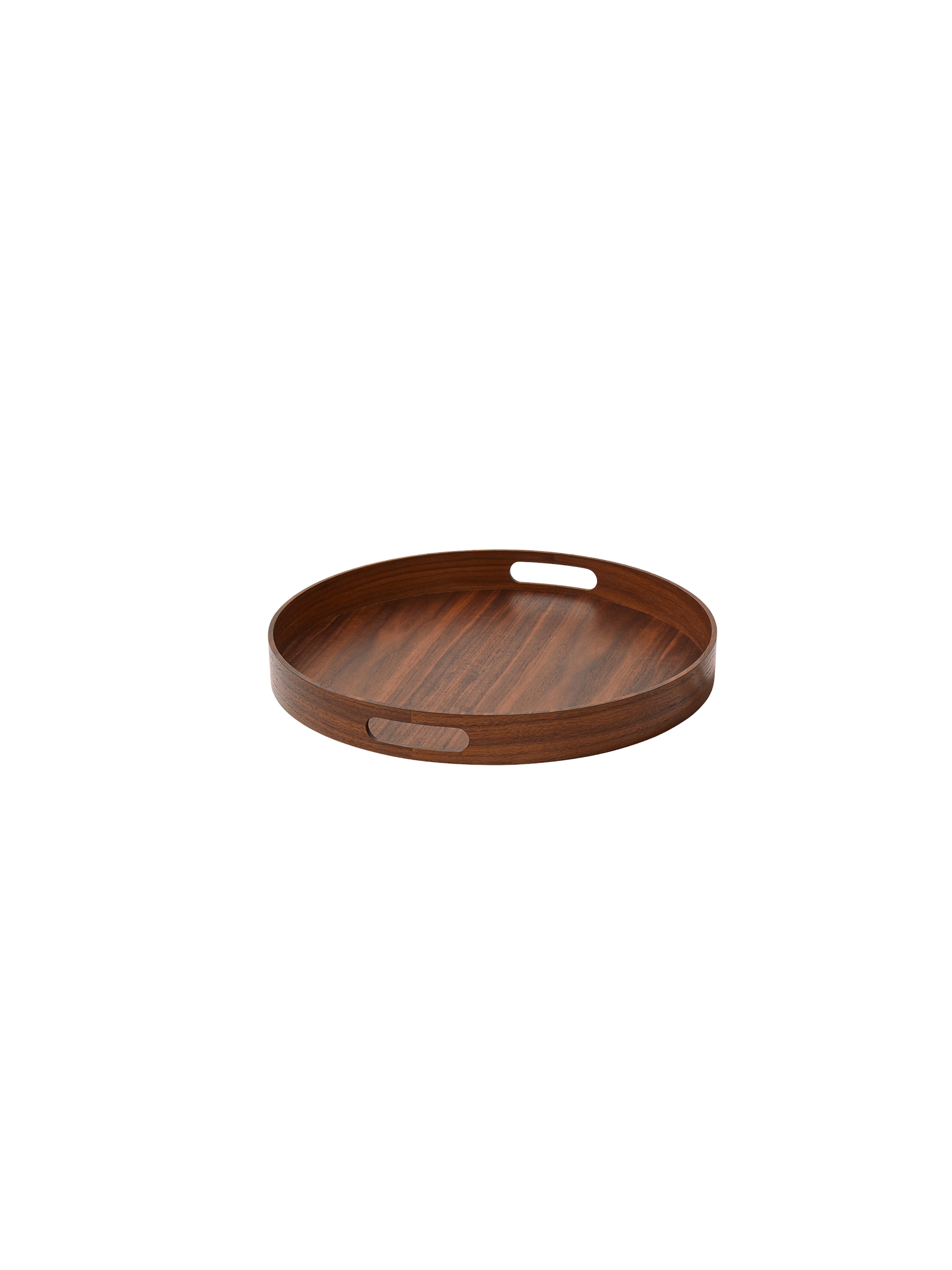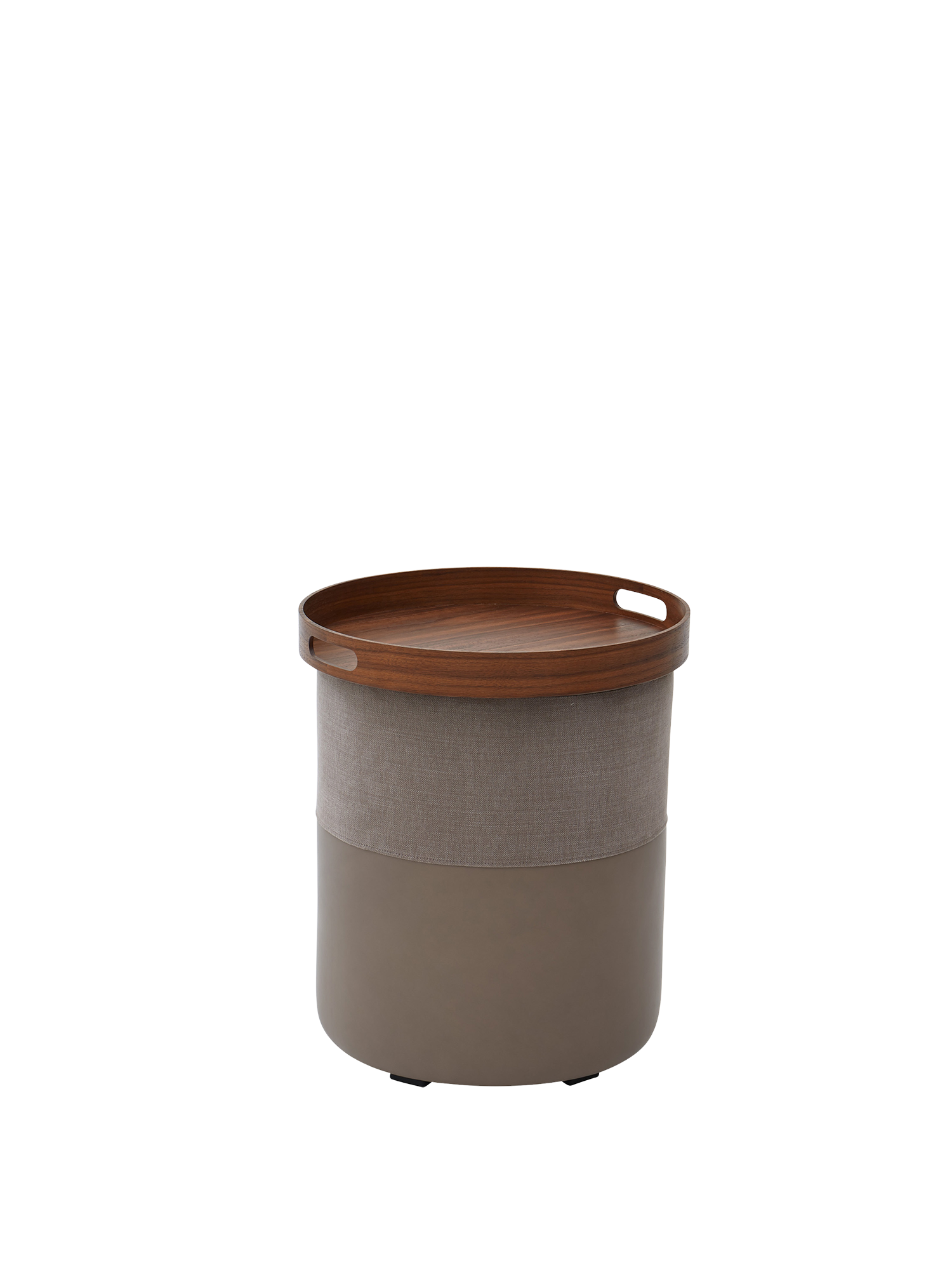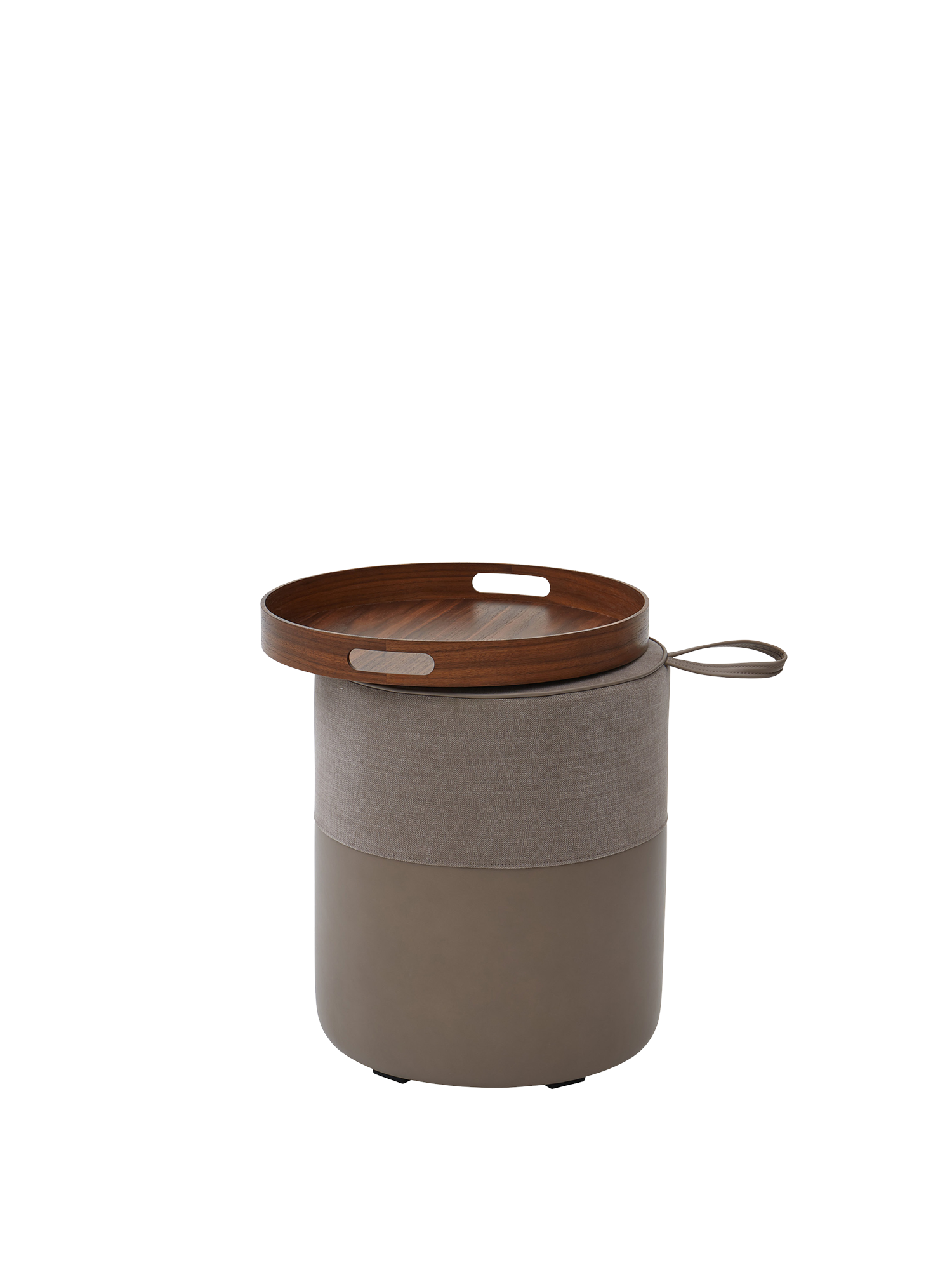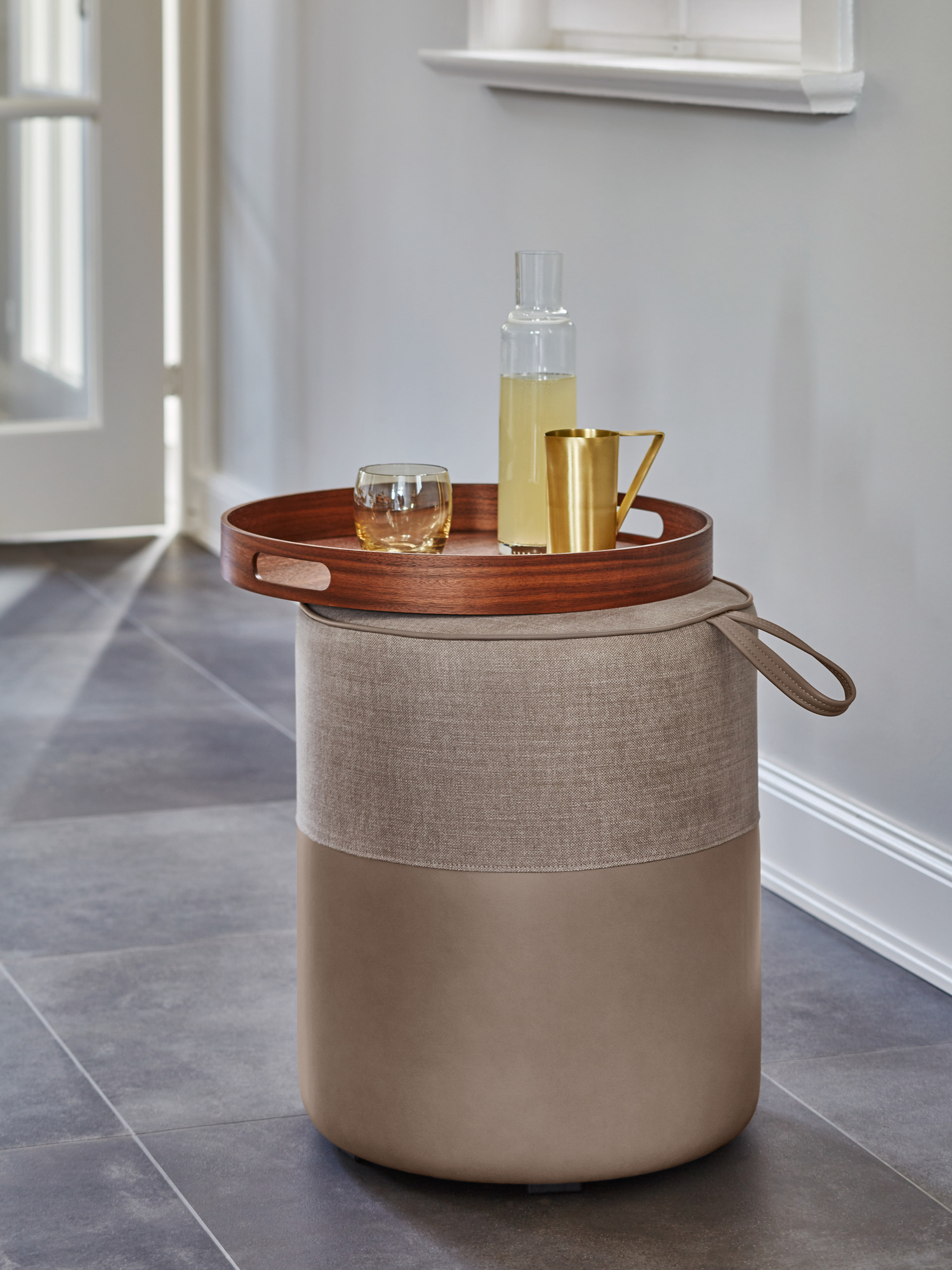 Der Durchmesser des handgefertigten Tabletts aus amerikanischem Nussbaum ist exakt auf den Radius des Poufs abgepasst – im kreisrund gebogenen Rand sind praktische Griffe ausgeschnitten. So wird aus einem Sitzplatz ein flexibler Beistelltisch.