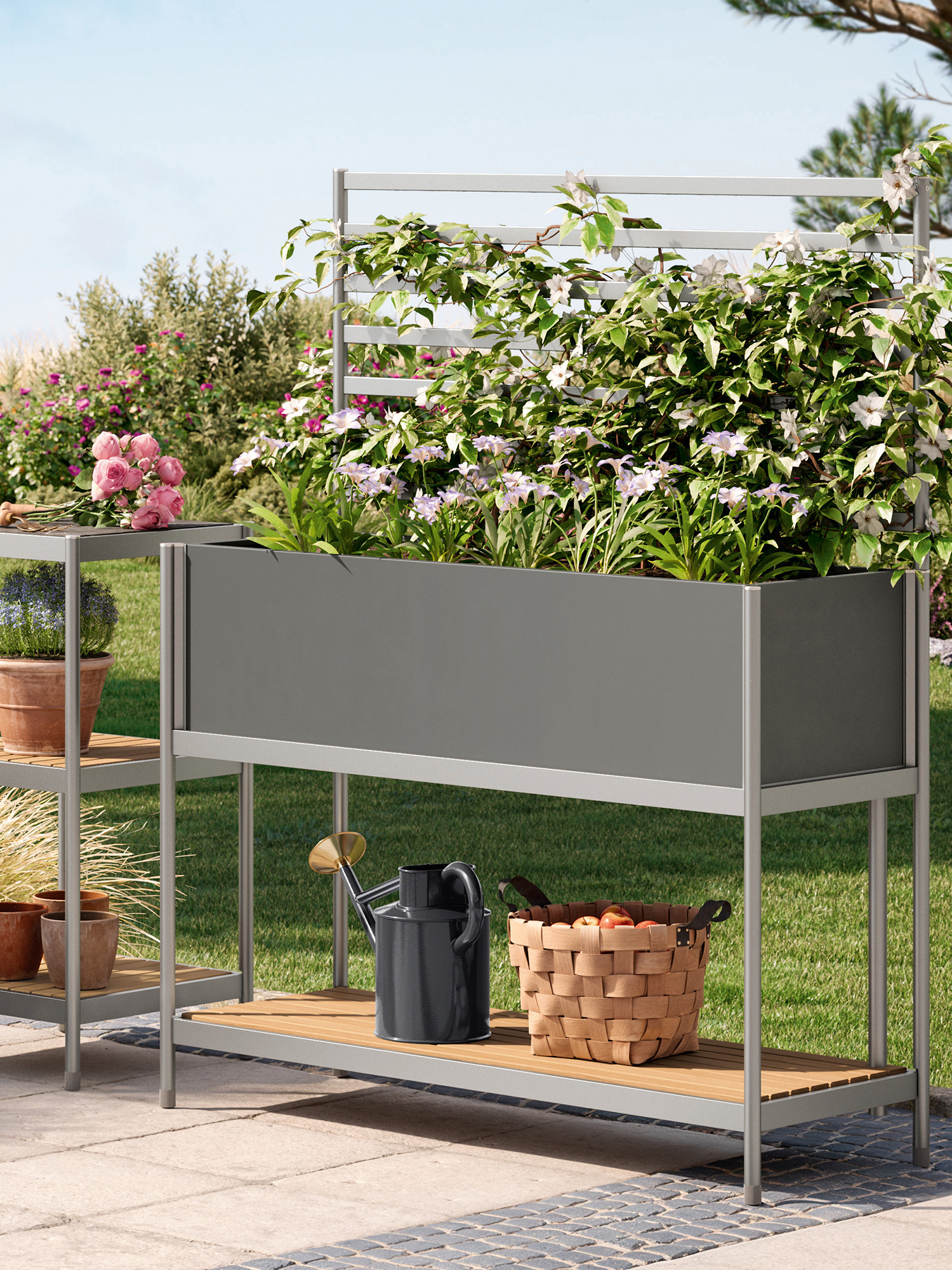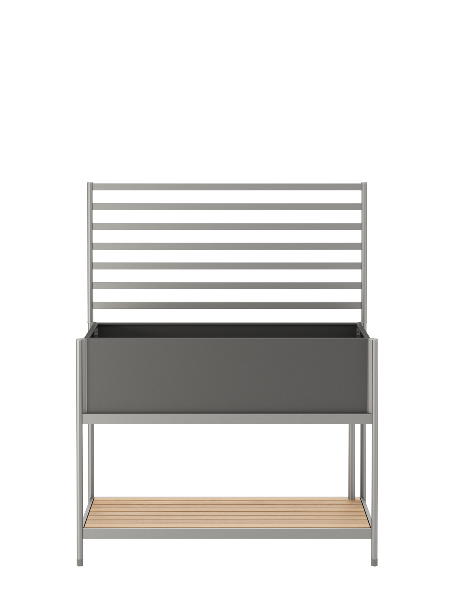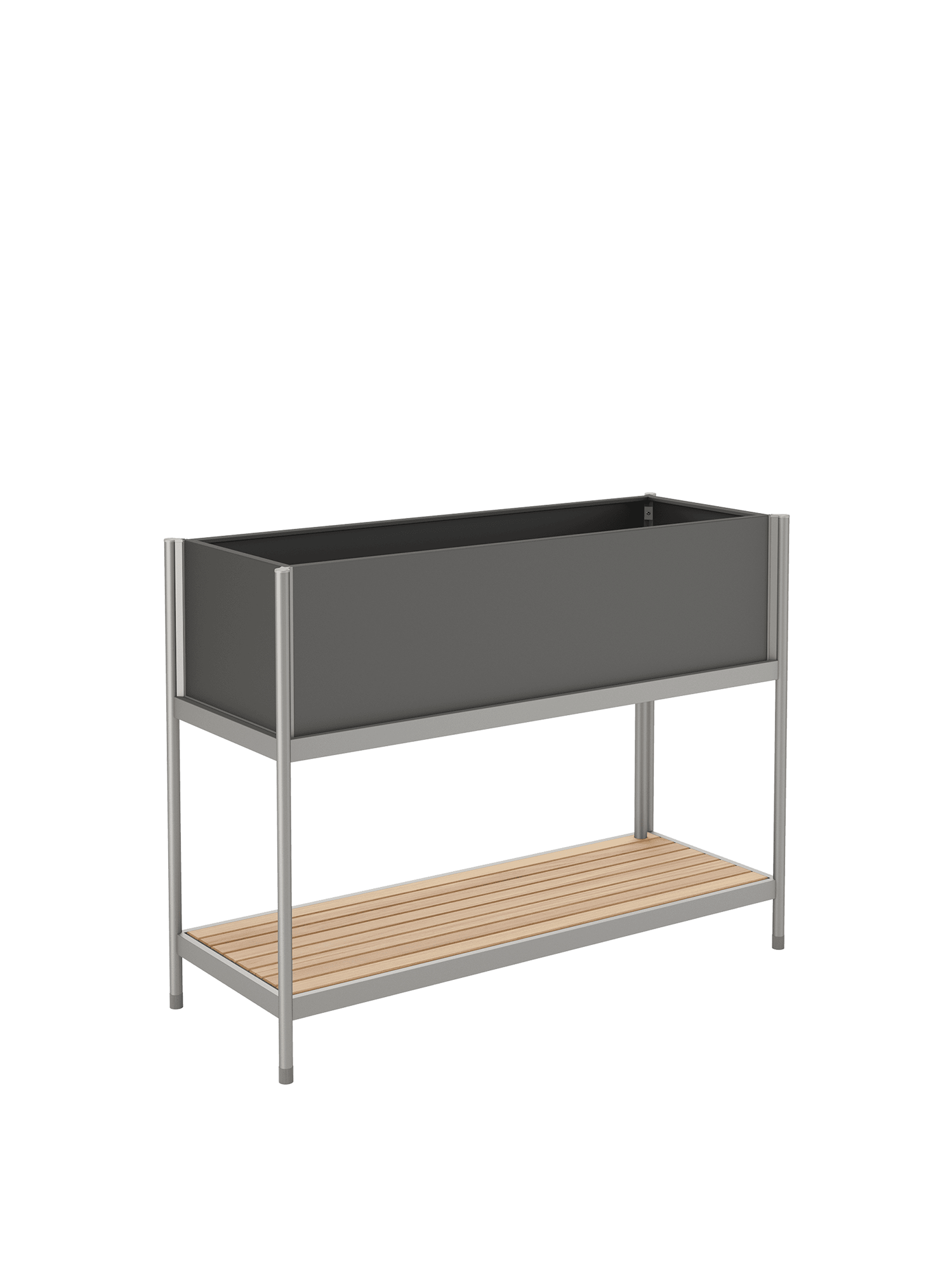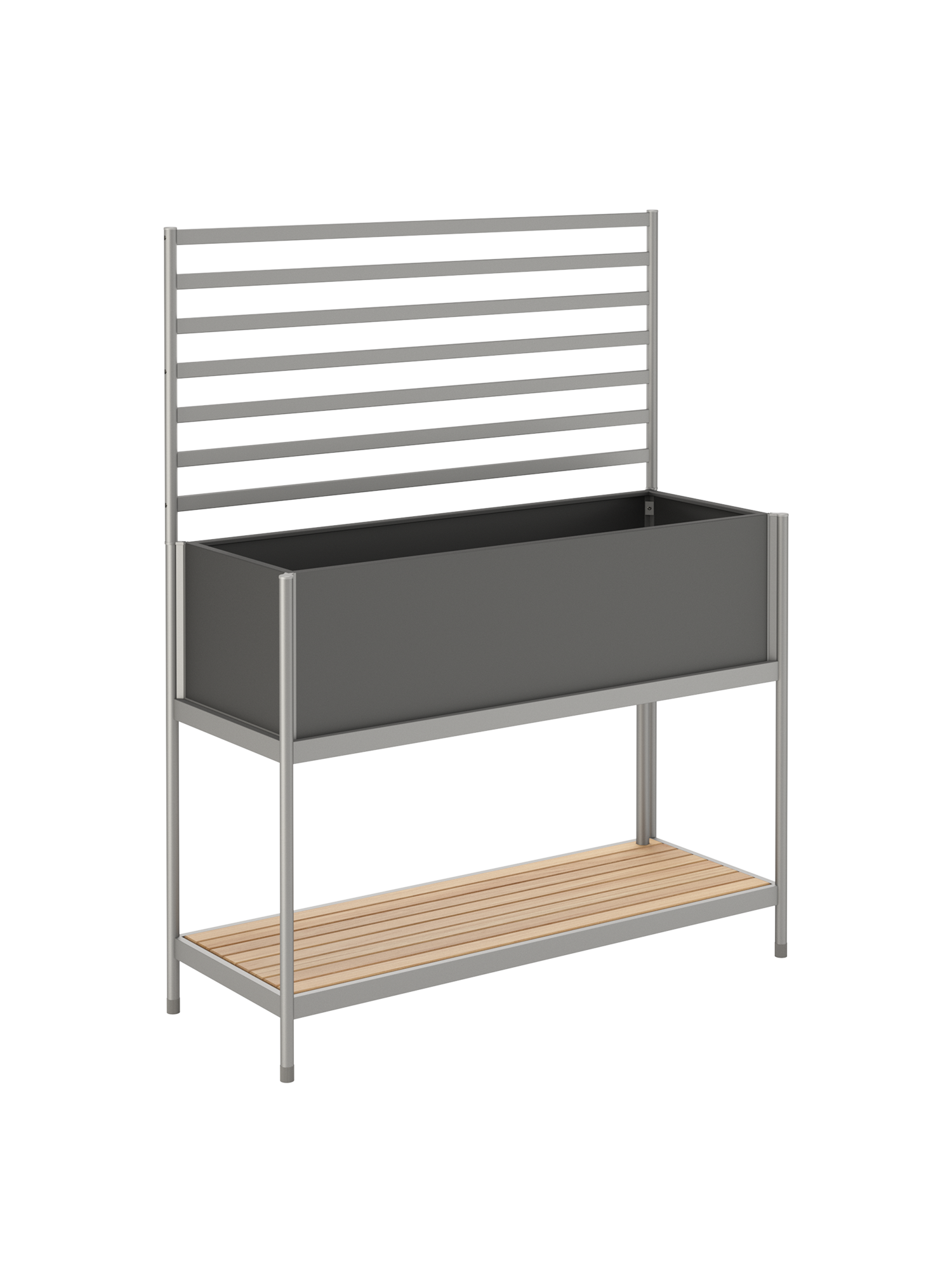 Im Hochbeet aus eloxiertem Aluminium gedeihen frisches Gemüse, Kräuter und Salat auch auf der Terrasse oder dem Balkon. Ein grosser Pflanzkasten aus pulverbeschichtetem Aluminium im Farbton Graphit sorgt für ideale Wachstumsbedingungen. Überschüssiges Wasser leitet ein im Gestell verborgener Auslauf zur Erde. Unter dem Pflanzkübel hält eine praktische Ablage aus Teakleisten Gartenwerkzeuge und Giesskanne griffbereit. Höhenversteller an den Beinen gleichen Unebenheiten im Boden aus. Ein einzeln zu bestellendes Rankgitter unterstützt den Wuchs von Pflanzen, die höher hinauswollen, und eignet sich auch als filigraner Raumteiler. Es wird einfach in die beiden hinteren Holme des Hochbeets gesteckt.