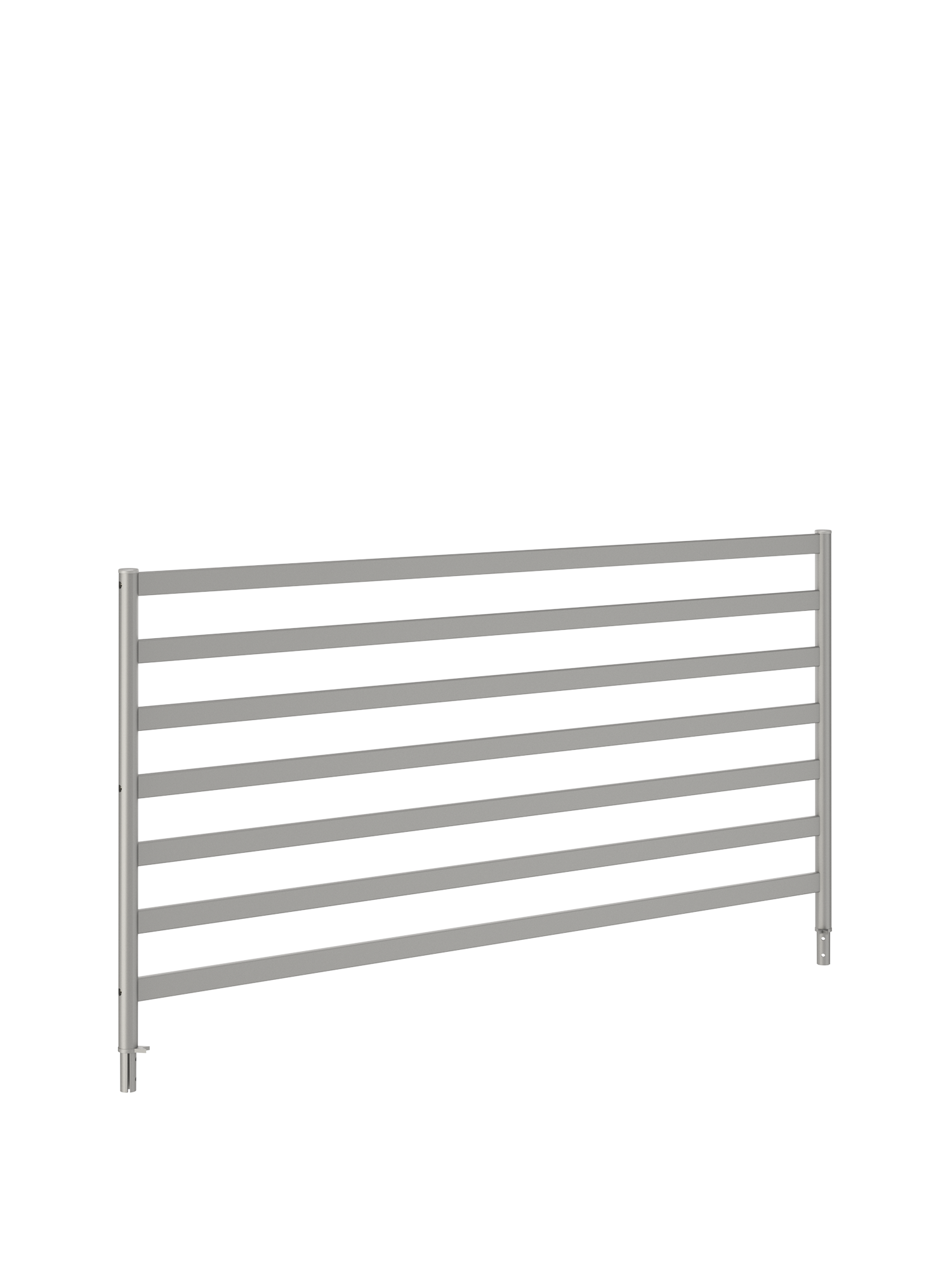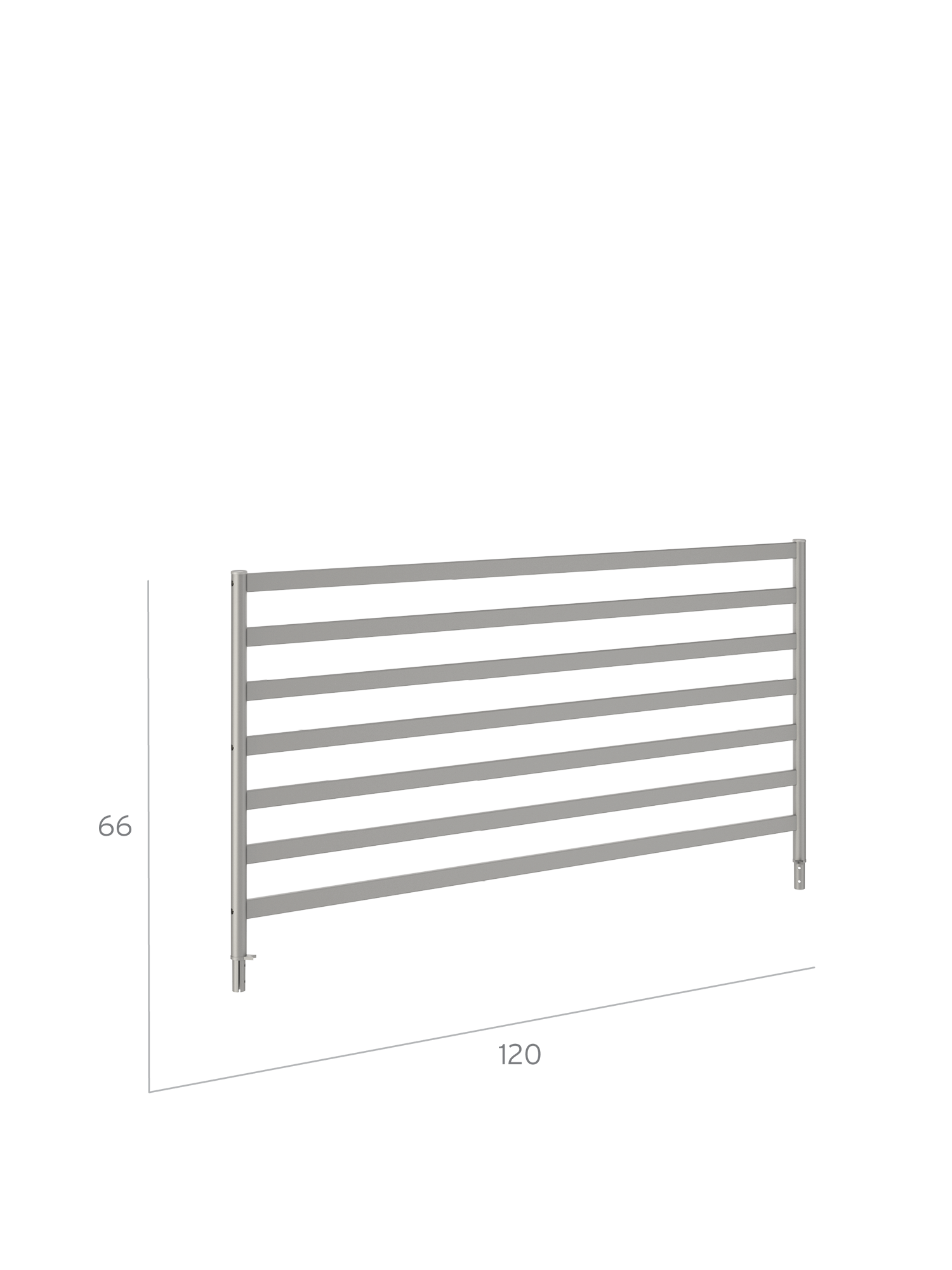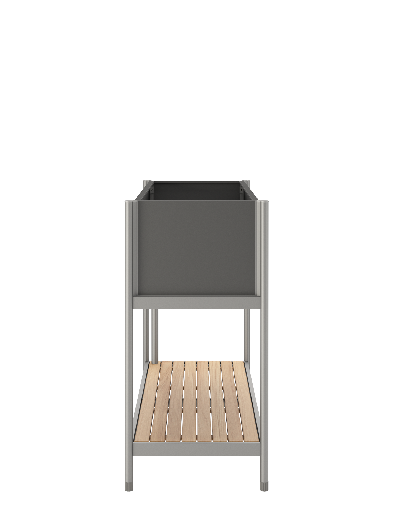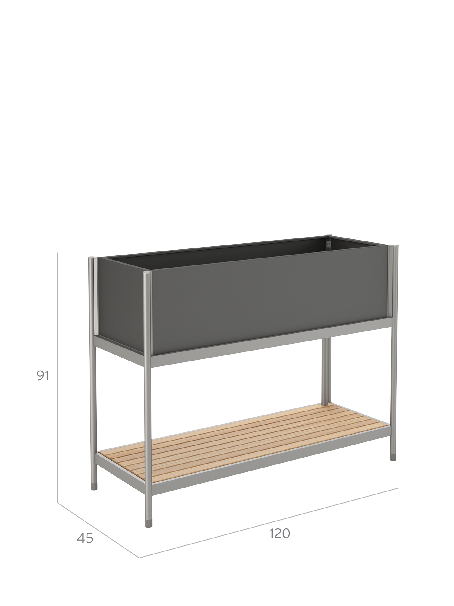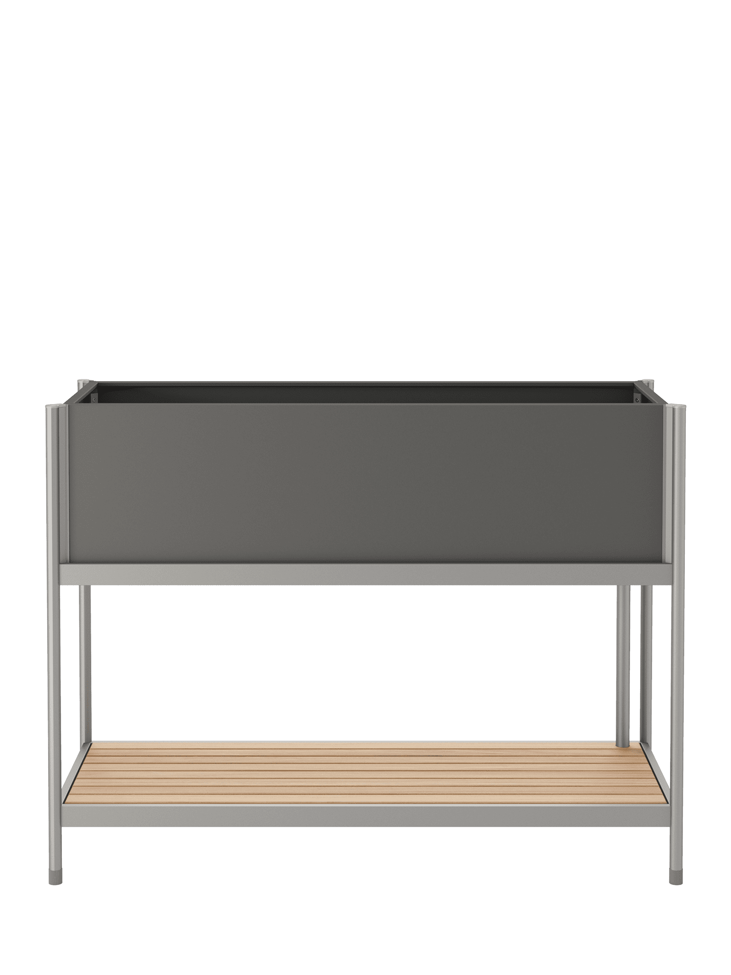 Im Hochbeet aus eloxiertem Aluminium gedeihen frisches Gemüse, Kräuter und Salat auch auf der Terrasse oder dem Balkon. Ein grosser Pflanzkasten aus pulverbeschichtetem Aluminium im Farbton Graphit sorgt für ideale Wachstumsbedingungen. Überschüssiges Wasser leitet ein im Gestell verborgener Auslauf zur Erde. Unter dem Pflanzkübel hält eine praktische Ablage aus Teakleisten Gartenwerkzeuge und Giesskanne griffbereit. Höhenversteller an den Beinen gleichen Unebenheiten im Boden aus. Ein einzeln zu bestellendes Rankgitter unterstützt den Wuchs von Pflanzen, die höher hinauswollen, und eignet sich auch als filigraner Raumteiler. Es wird einfach in die beiden hinteren Holme des Hochbeets gesteckt.