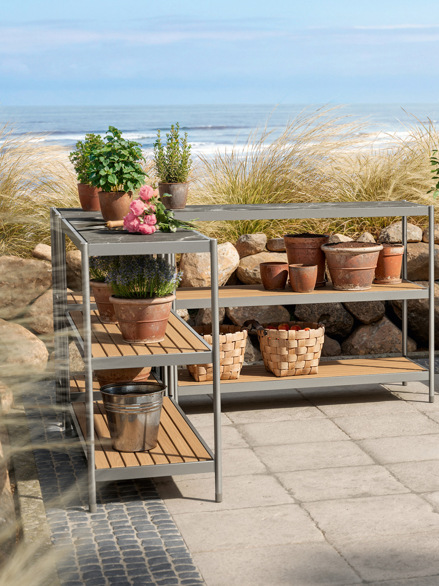 Zur modularen Rana Kollektion gehören hochwertige Regale in zwei Grössen, ein Hochbeet und ein Pflanzkübel im korrespondierenden Design. In vollendeter Formensprache, mit aufeinander abgestimmten Massen und durchdachter Funktionalität ergänzen sich die einzelnen Elemente auch als Ensemble, schaffen nützlichen Stauraum und bilden dekorative Arrangements.