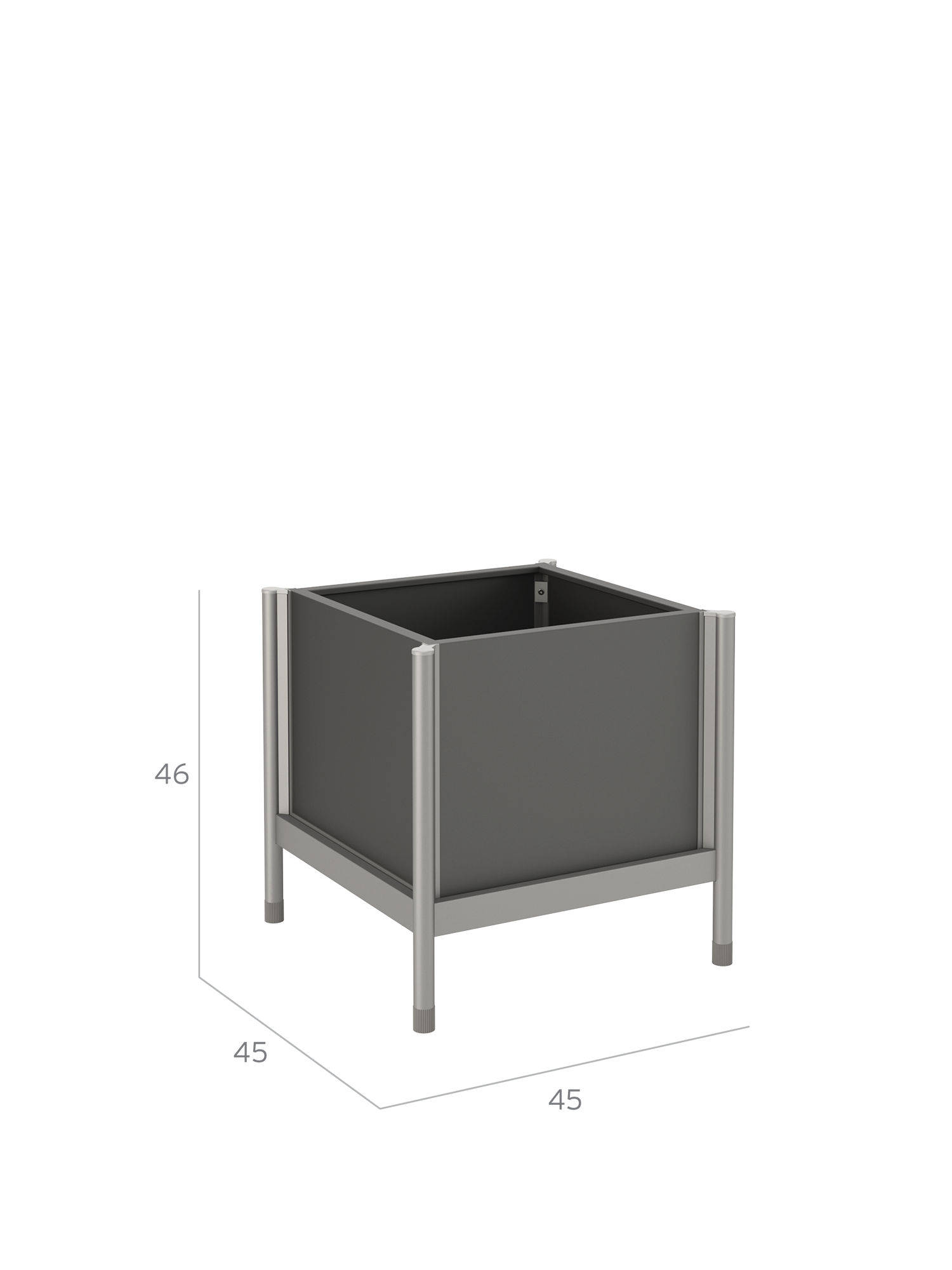 Im quadratischen Pflanztopf aus eloxiertem Aluminium setzen kleinere Gehölze, Stauden, Kräuter oder Sommerblumen natürliche Akzente. Sein Einsatz besteht aus pulverbeschichtetem Aluminium im Farbton Graphit. Überschüssiges Wasser leitet ein im Gestell verborgener Auslauf zur Erde. Höhenversteller an den Beinen gleichen Unebenheiten im Boden aus.