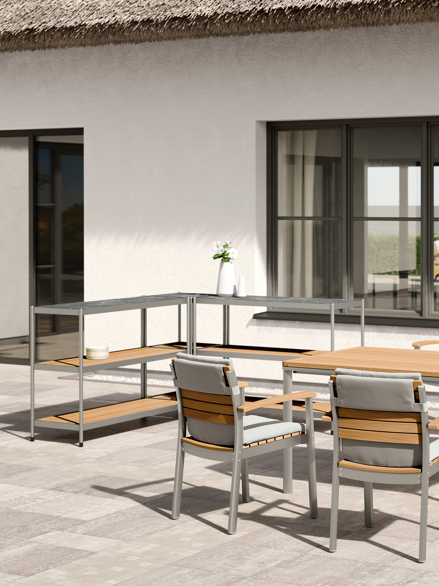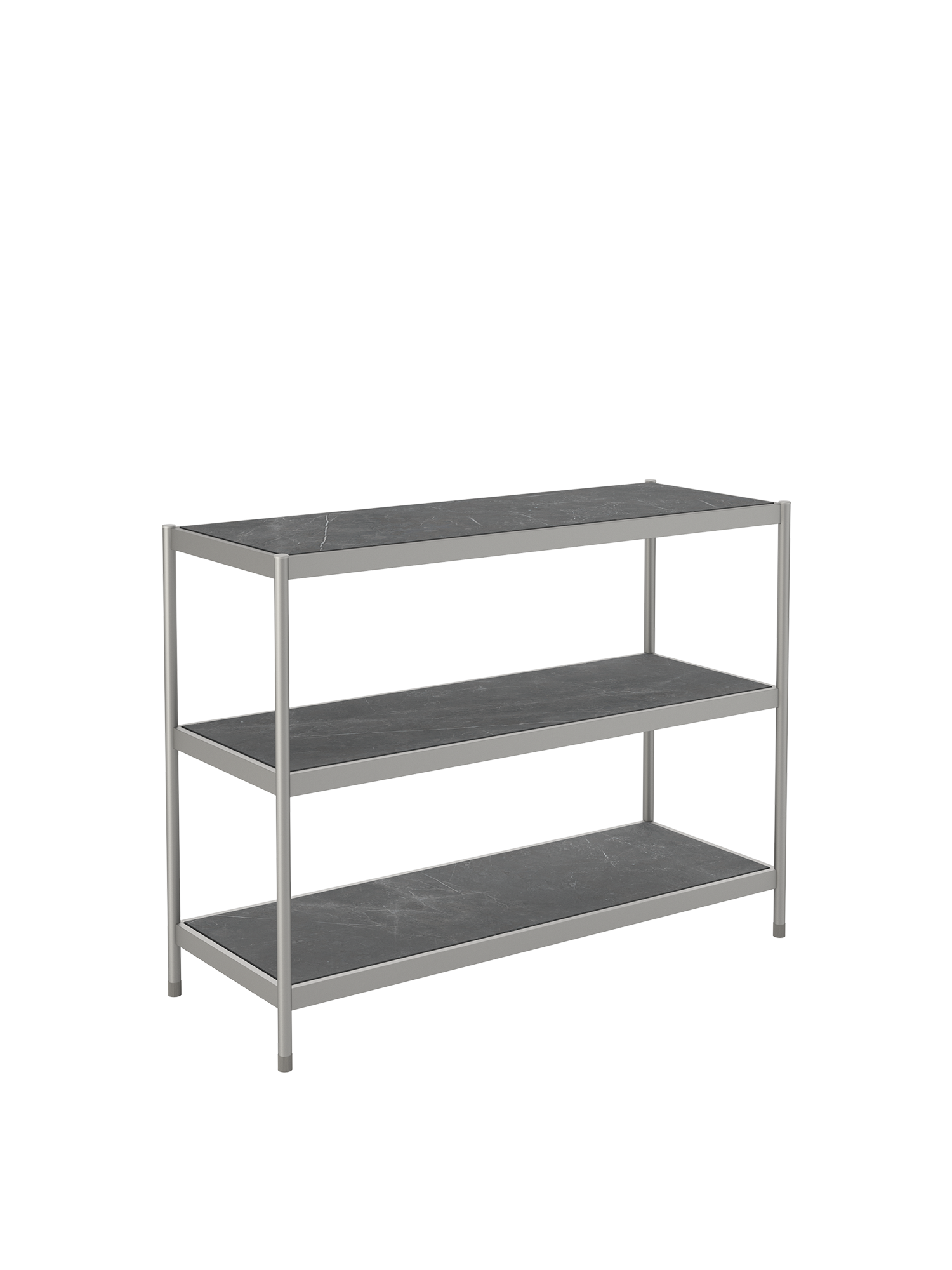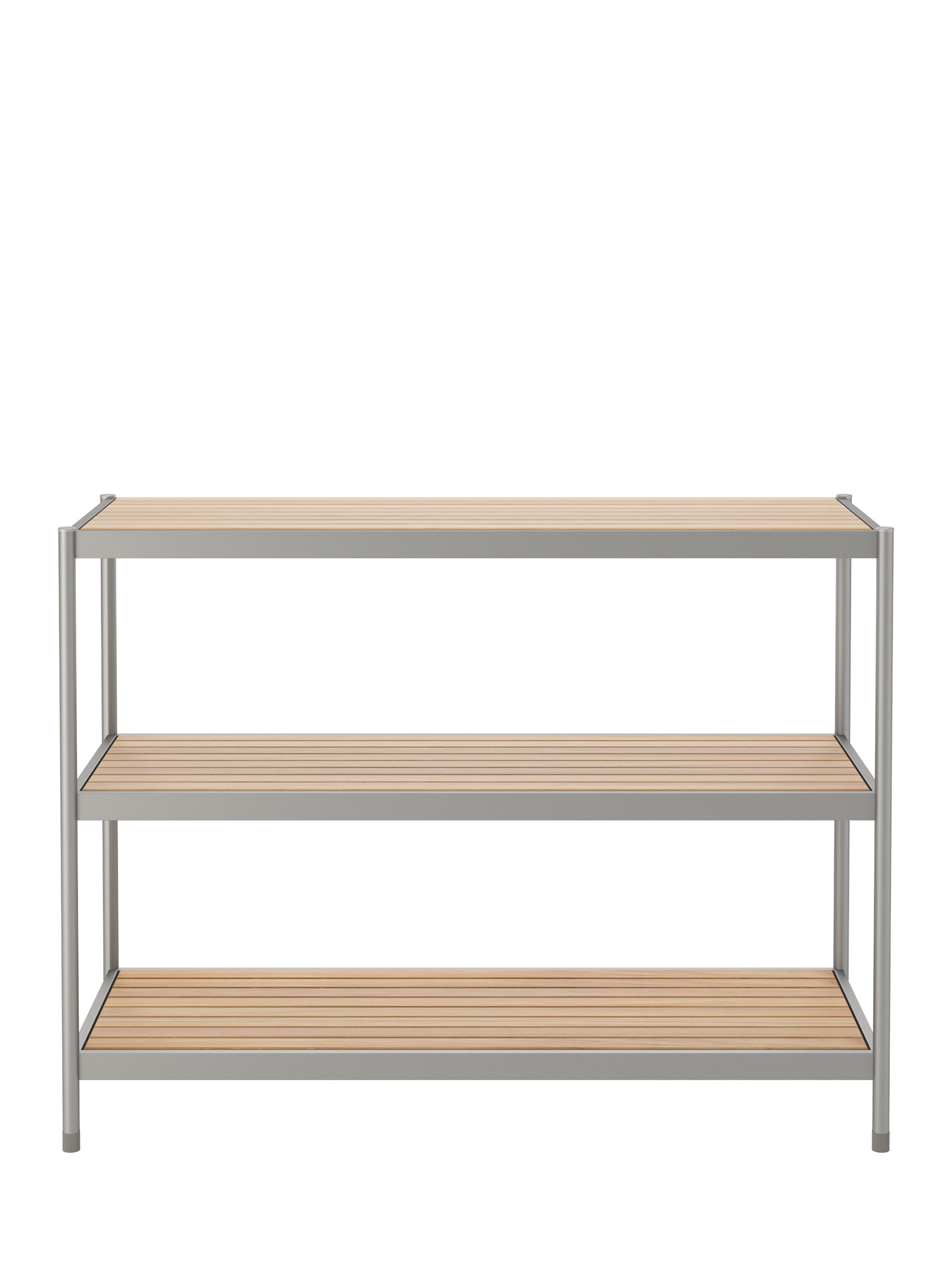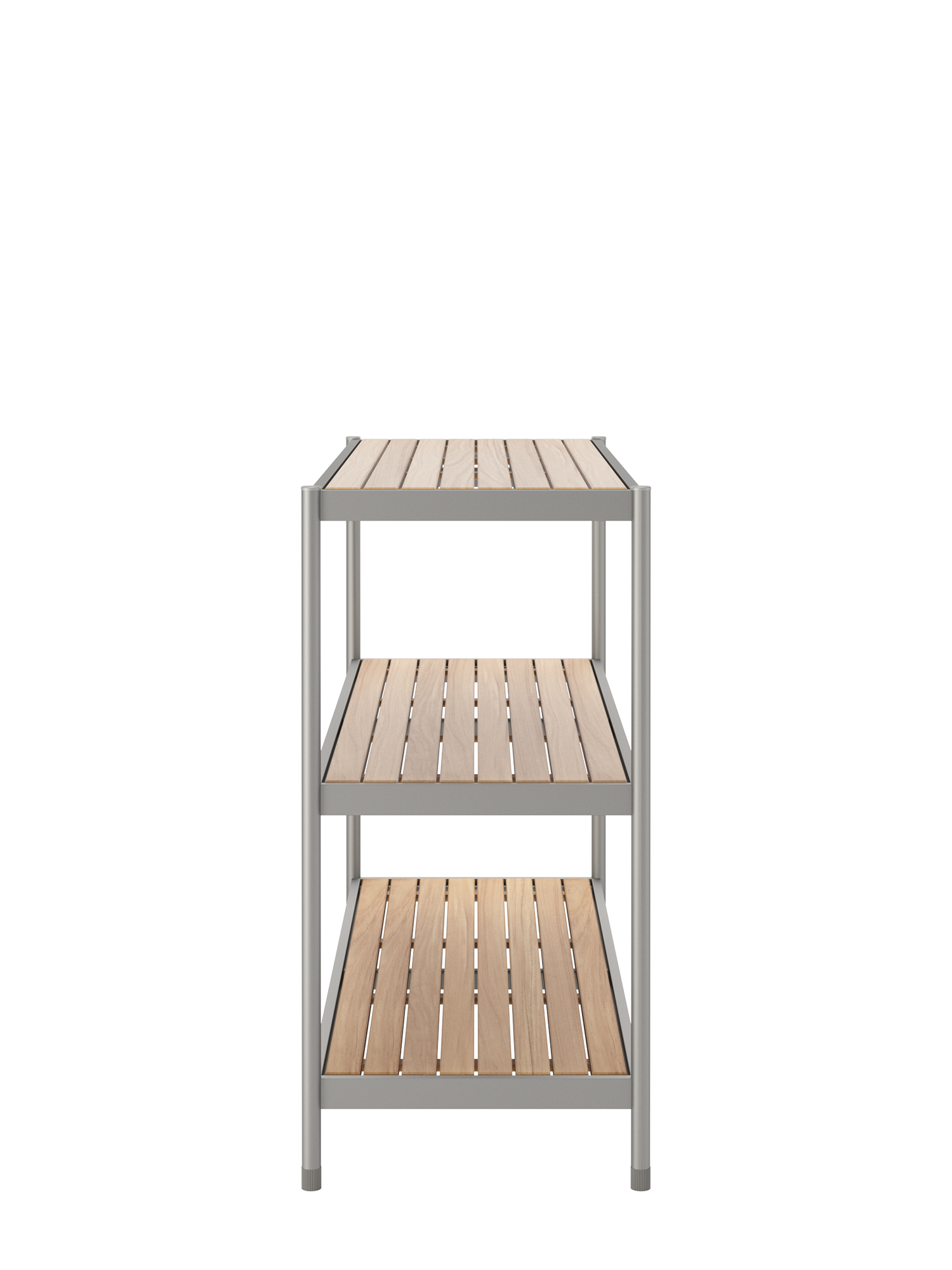 Das wetterfeste Gartenregal aus eloxiertem Aluminium fügt sich mit seinem reduzierten Design und einem sanft changierenden Farbton harmonisch in jede Umgebung. Als geräumiger Solitär oder flexibles Modul in einer Reihe mit weiteren Elementen der Rana Kollektion bietet es praktische Ablagefläche für Geschirr, Accessoires oder Zutaten für die Outdoor-Küche. Und fungiert im Zusammenspiel mit dem Hochbeet der Kollektion auch als eleganter Pflanztisch. Die separat zu bestellenden Einlegeböden für seine drei Ebenen bestehen wahlweise aus Teakleisten oder Keramikplatten. Höhenversteller an den Beinen gleichen Unebenheiten im Boden aus.