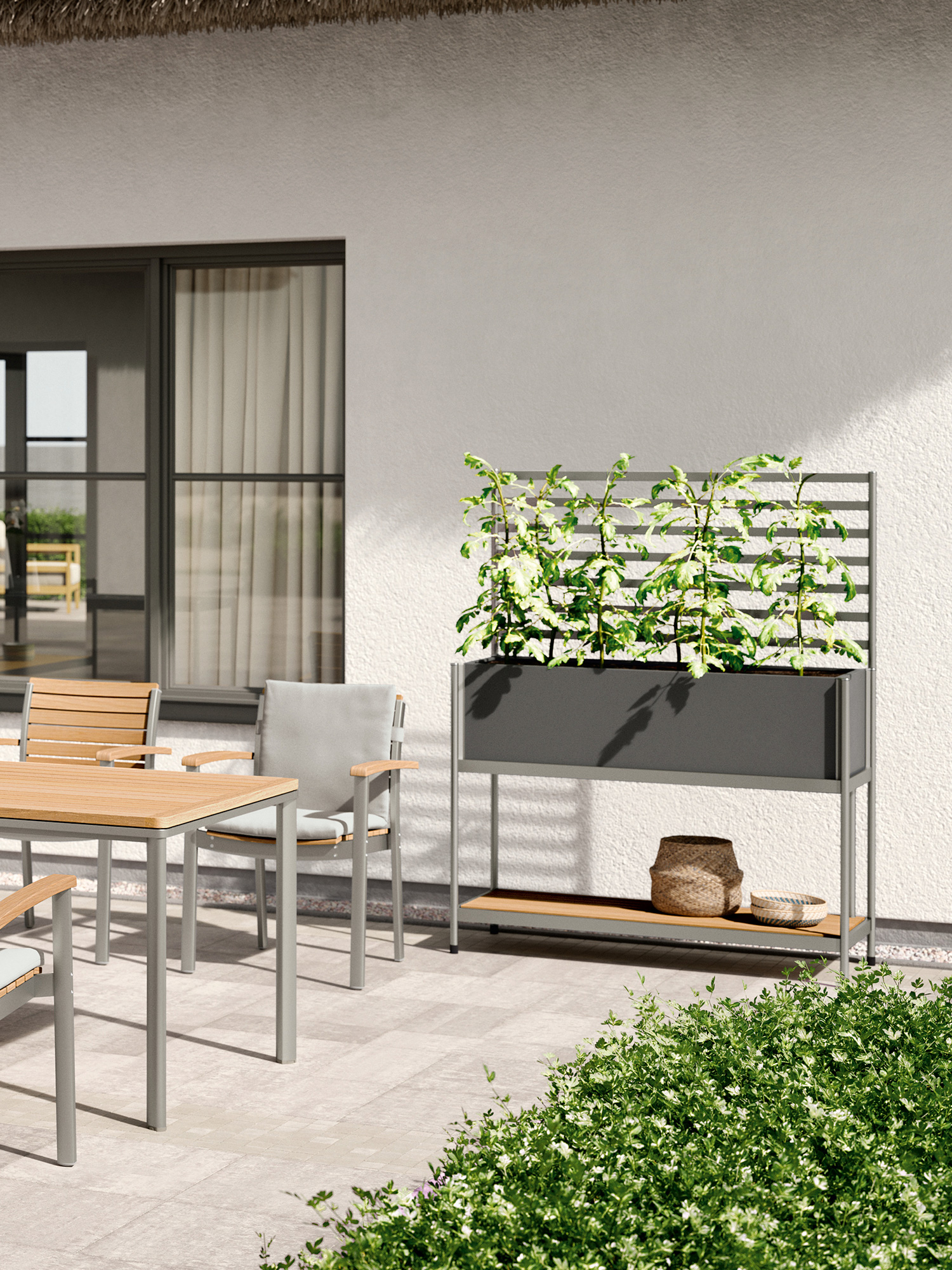 Zur modularen Rana Kollektion gehören hochwertige Regale in zwei Grössen, ein Hochbeet und ein Pflanzkübel im korrespondierenden Design. In vollendeter Formensprache, mit aufeinander abgestimmten Massen und durchdachter Funktionalität ergänzen sich die einzelnen Elemente auch als Ensemble, schaffen nützlichen Stauraum und bilden dekorative Arrangements.