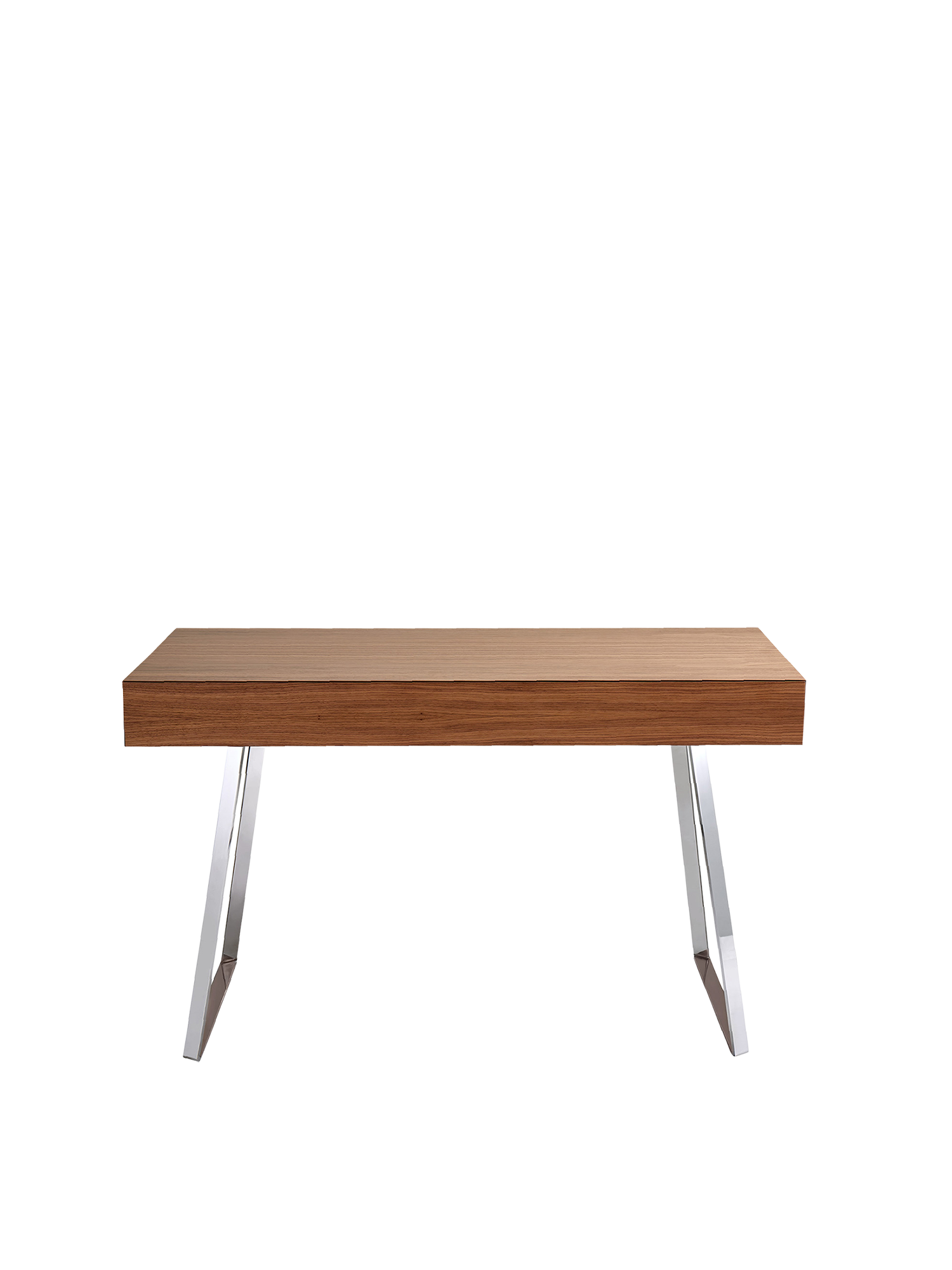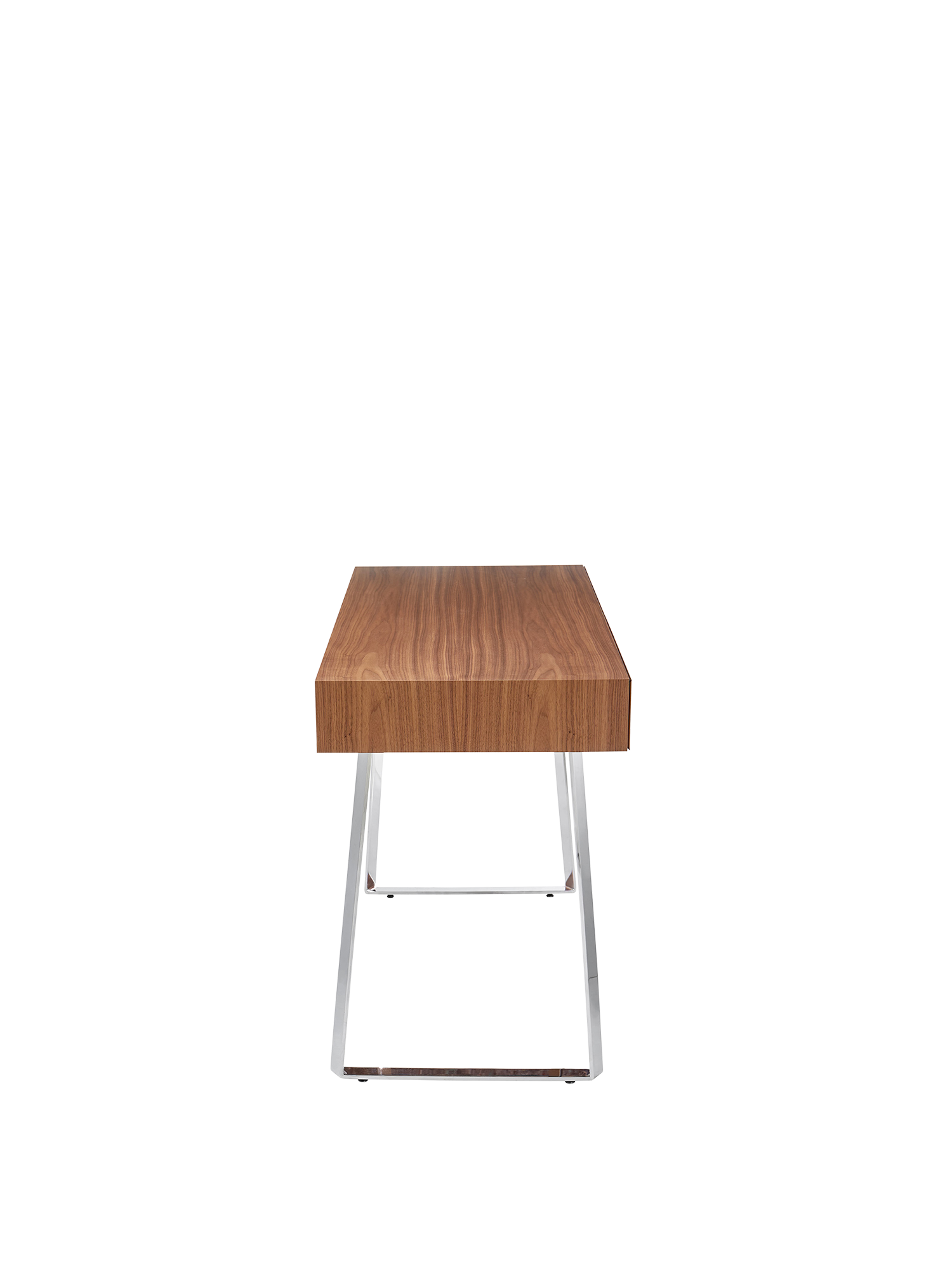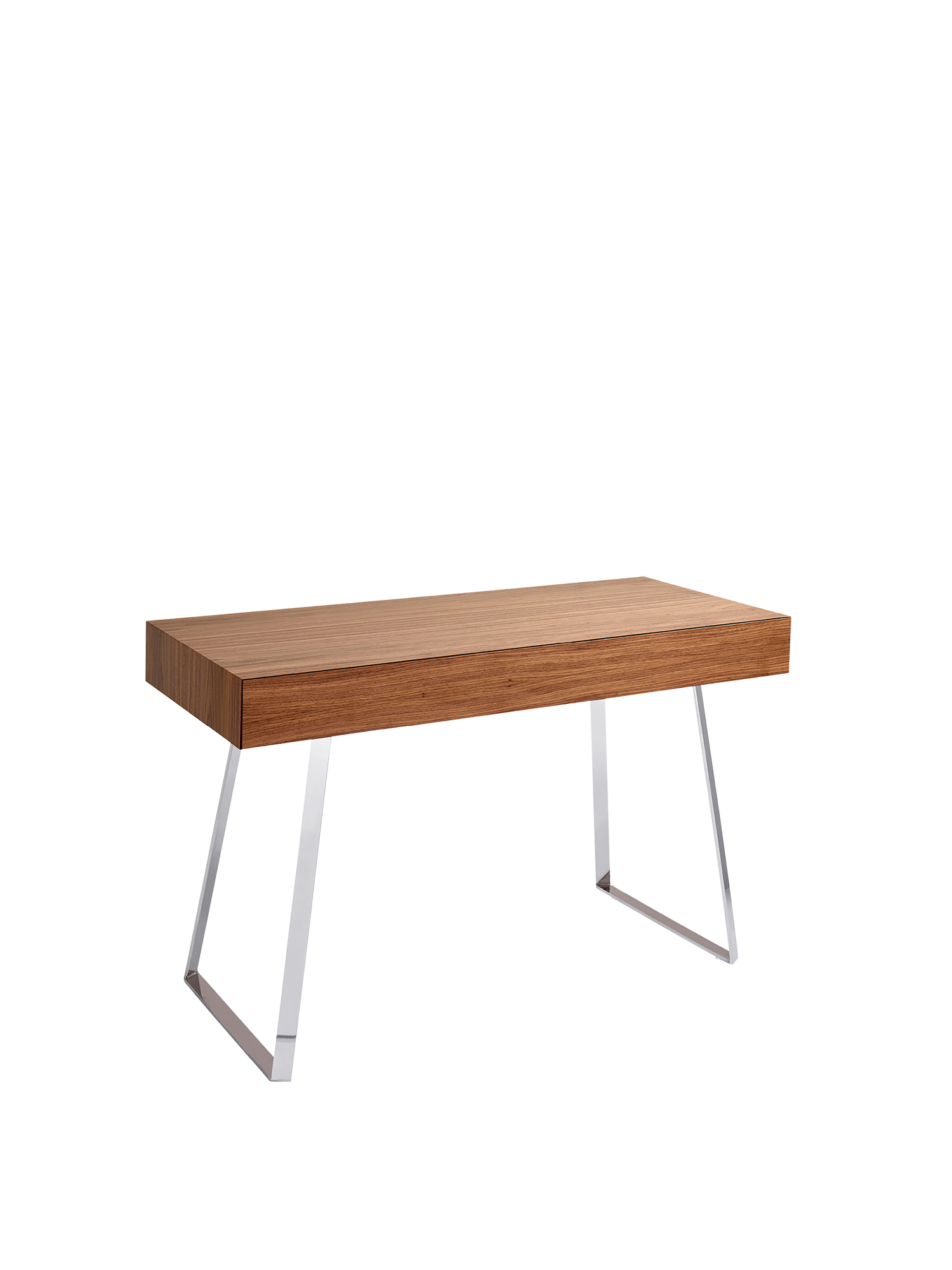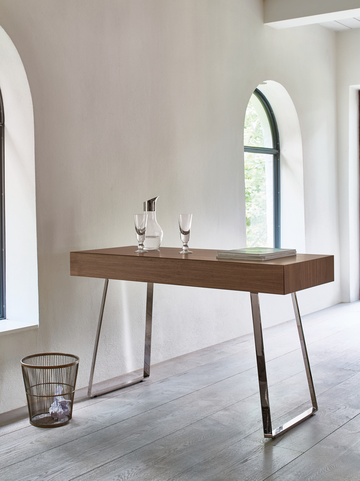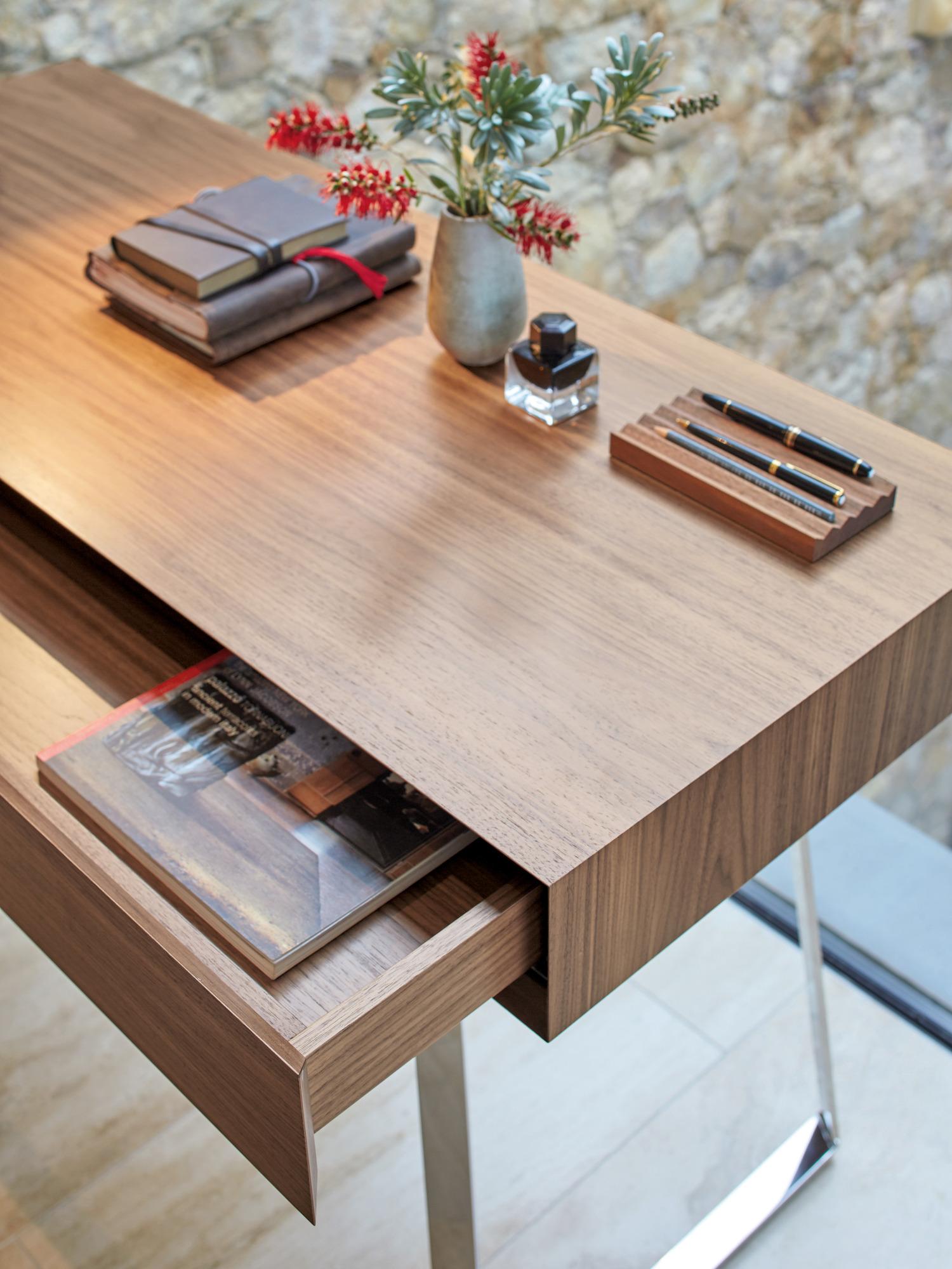 Am Konsoltisch Reeva ist alles etwas leichter, nicht nur das Arbeiten. Den besonderen Charme macht dabei die Perfektion der Holzbearbeitung des amerikanischen Nussbaums aus: Denn die leise gleitende breite Schublade der Konsole ist zunächst nicht zu erkennen – so genau schliessen die mit 45 Grad gewinkelten Holzkanten der Lade in die Passform des Korpus. Dass auch die Beine des Gestells aus poliertem Edelstahl in diesem Winkel gedreht sind, optimiert das elegante Design.
