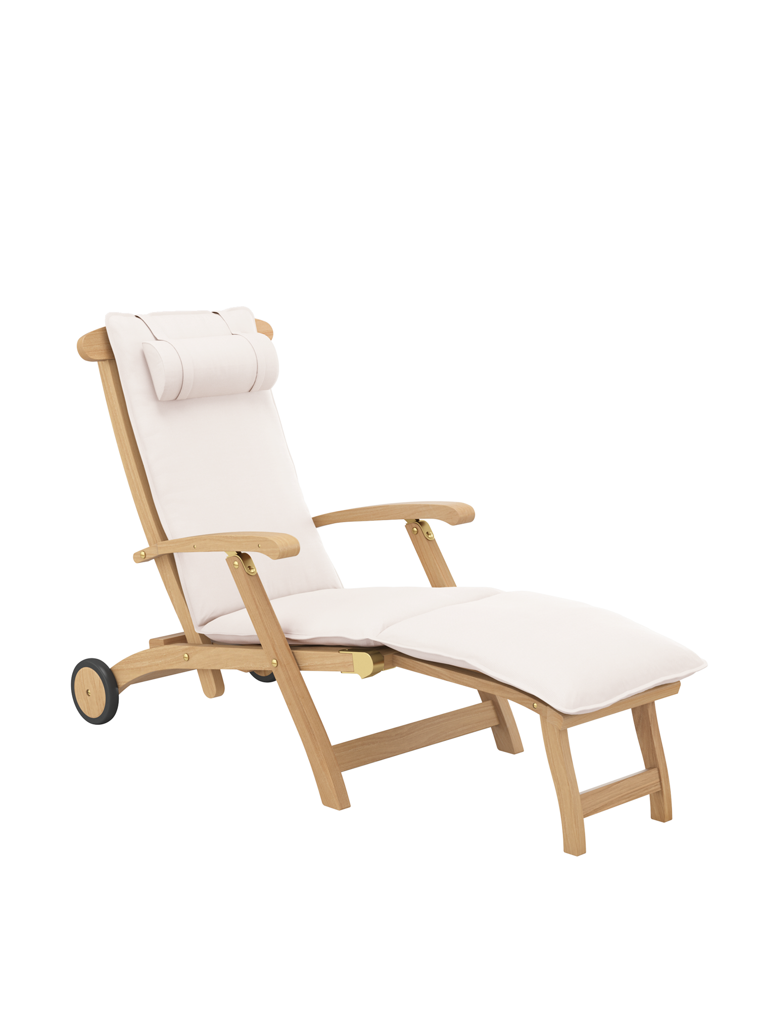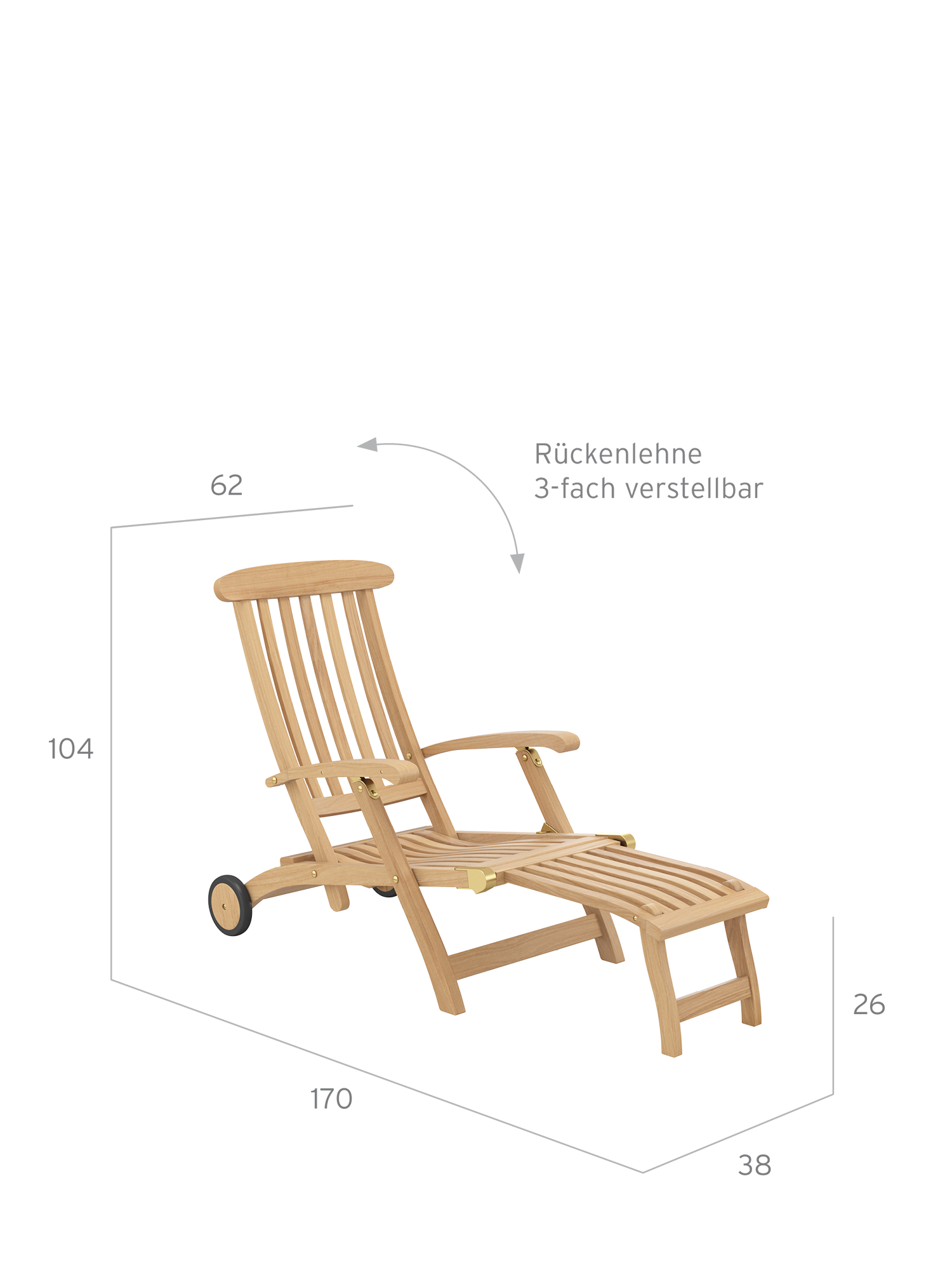 Die Teakleisten der Sitz- und Rückenfläche sind nach den Körperlinien geformt, die Armlehnen sanft gerundet - sie sorgen für den besonderen Komfort, der unseren Deck Chair auszeichnet.