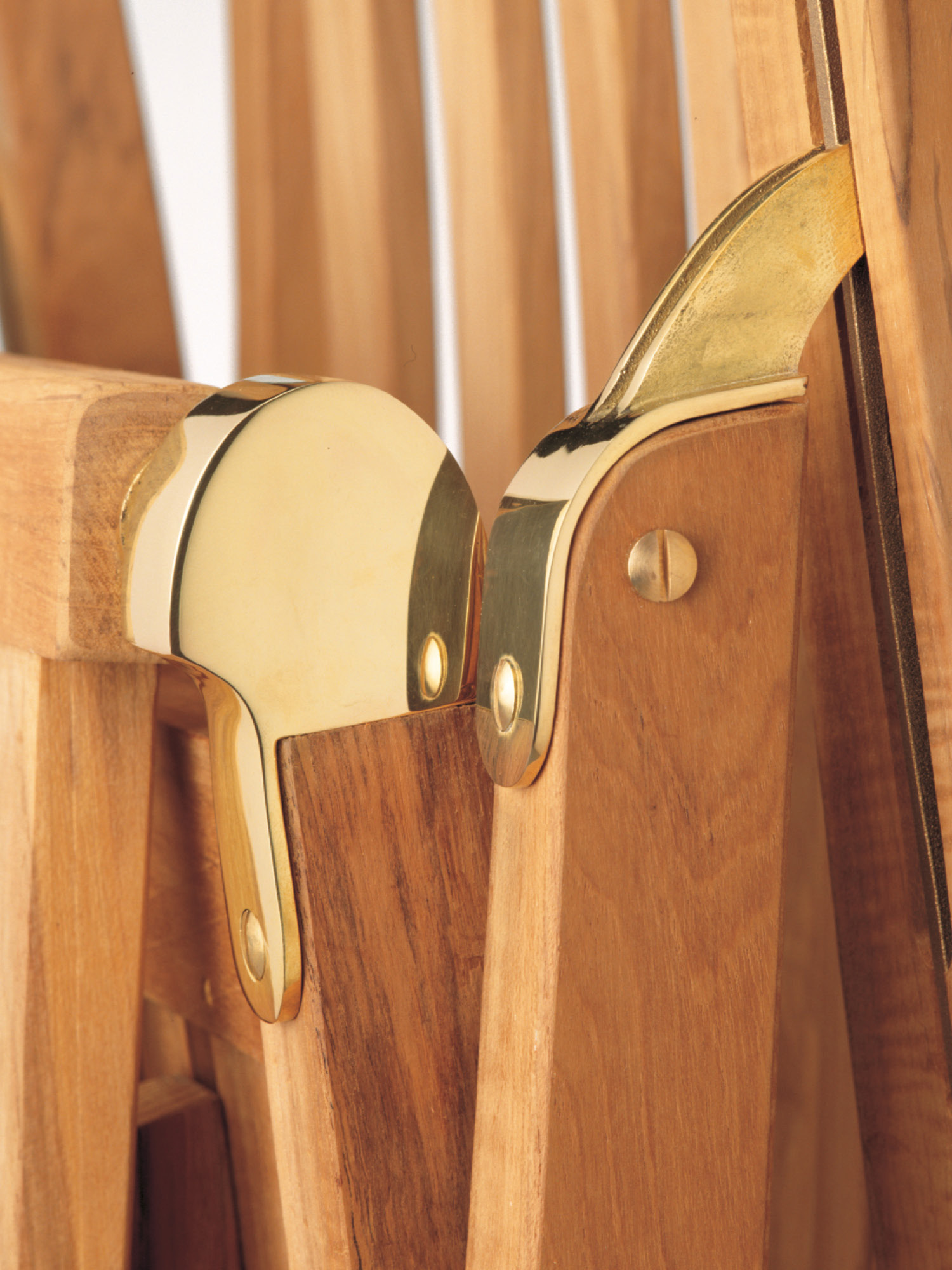 Gelenke und Beschläge sind aus hochwertigem Messing, das dafür sorgt, dass Verstell- und Klappmechanik des Möbels leichtgängig funktionieren.