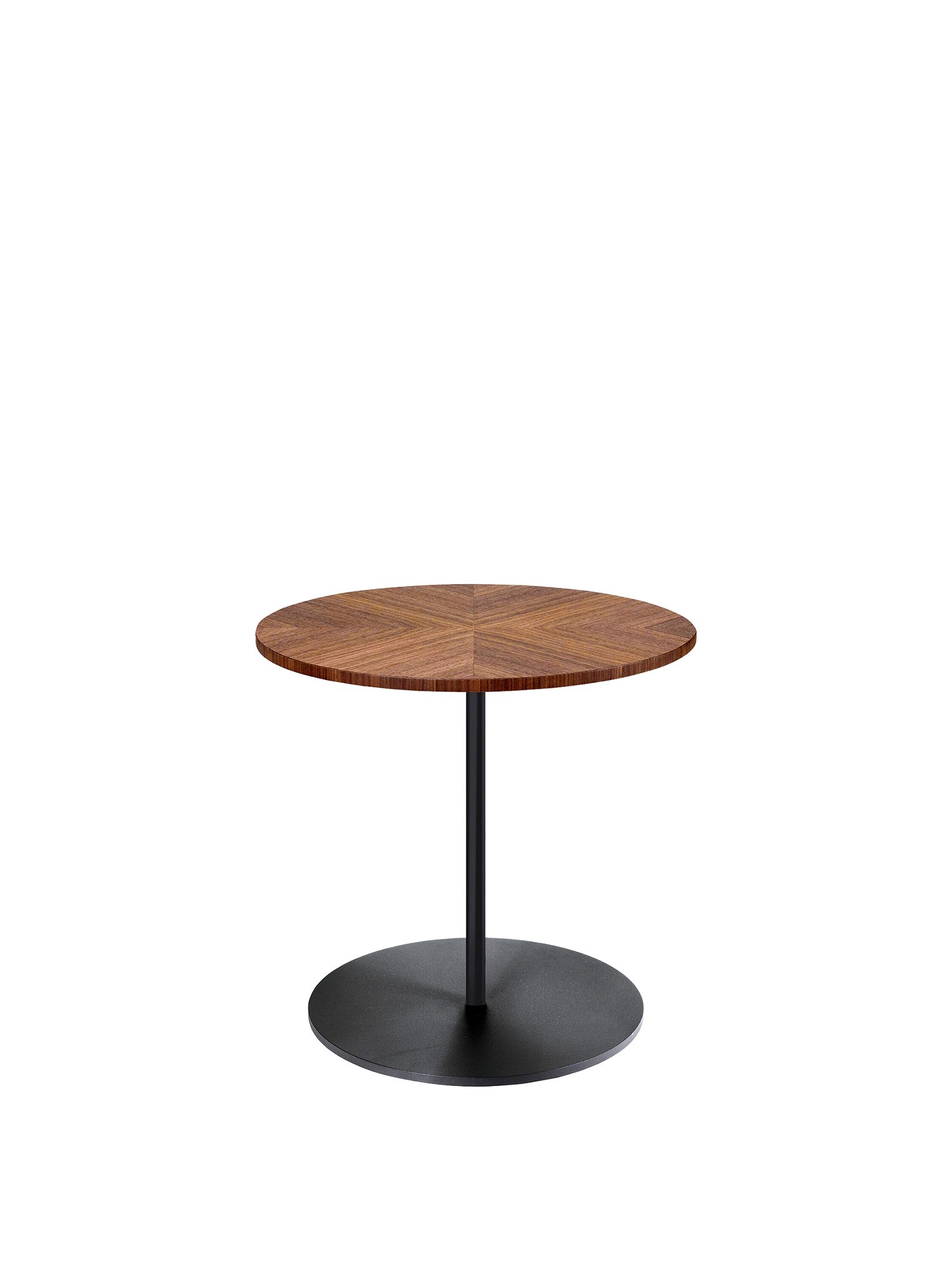 Inmitten behaglicher Polstermöbel empfiehlt sich der 50 cm hohe Beistelltisch als praktische Ablage. Das mattschwarze Untergestell aus Metall trägt eine ovale Oberfläche aus amerikanischem Nussbaum. Die besondere Maserung verläuft in zwei Richtungen.