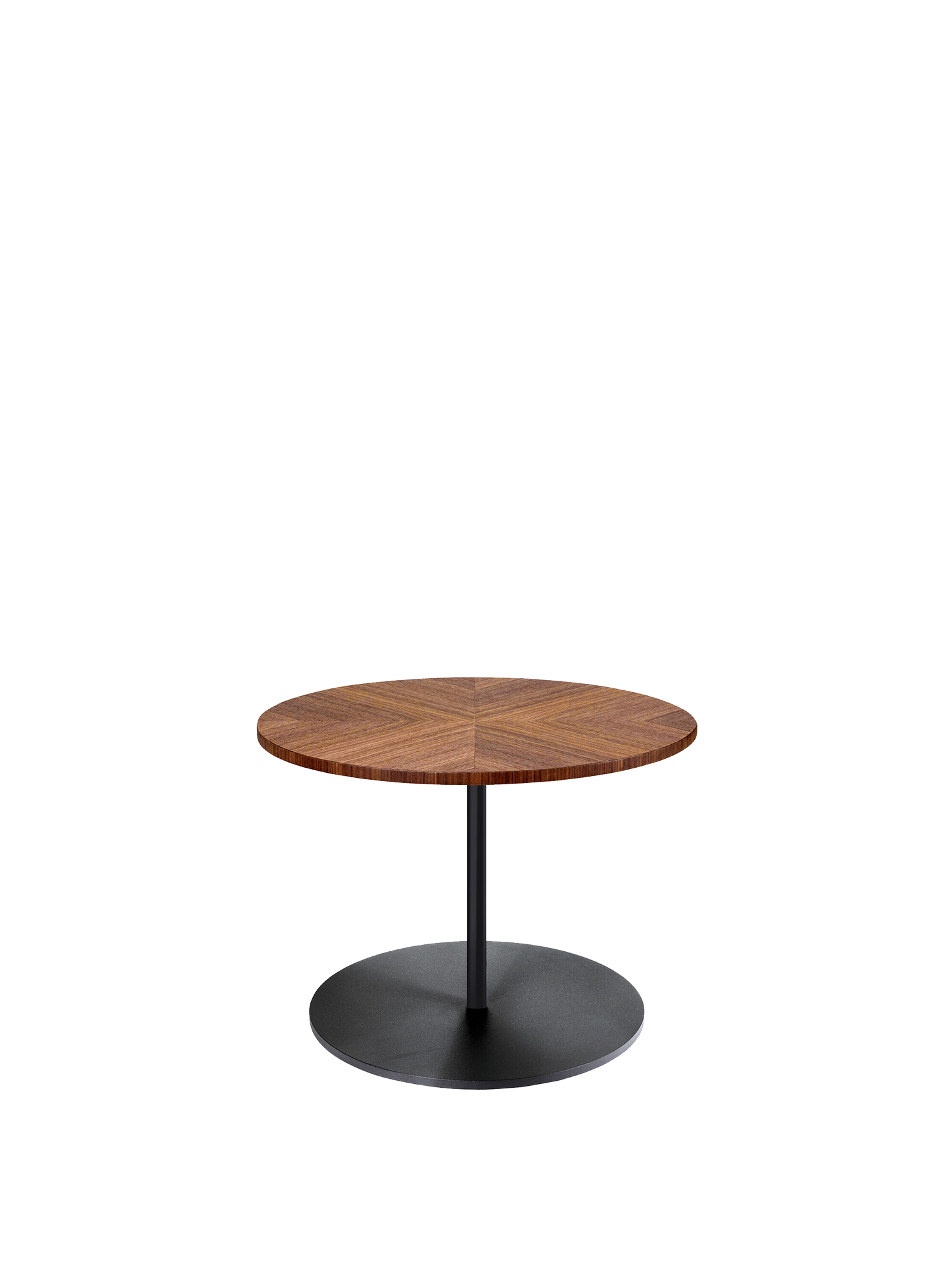 Inmitten behaglicher Polstermöbel empfiehlt sich der 40 cm hohe Beistelltisch als praktische Ablage. Das mattschwarze Untergestell aus Metall trägt eine ovale Oberfläche aus amerikanischem Nussbaum. Die besondere Maserung verläuft in zwei Richtungen.