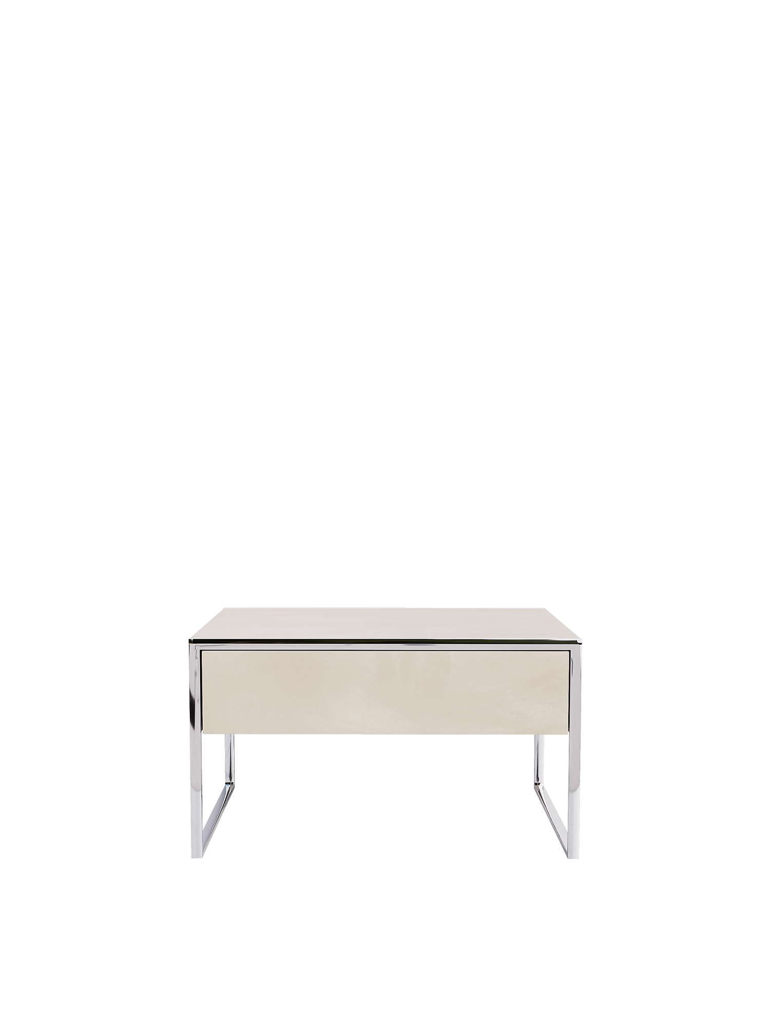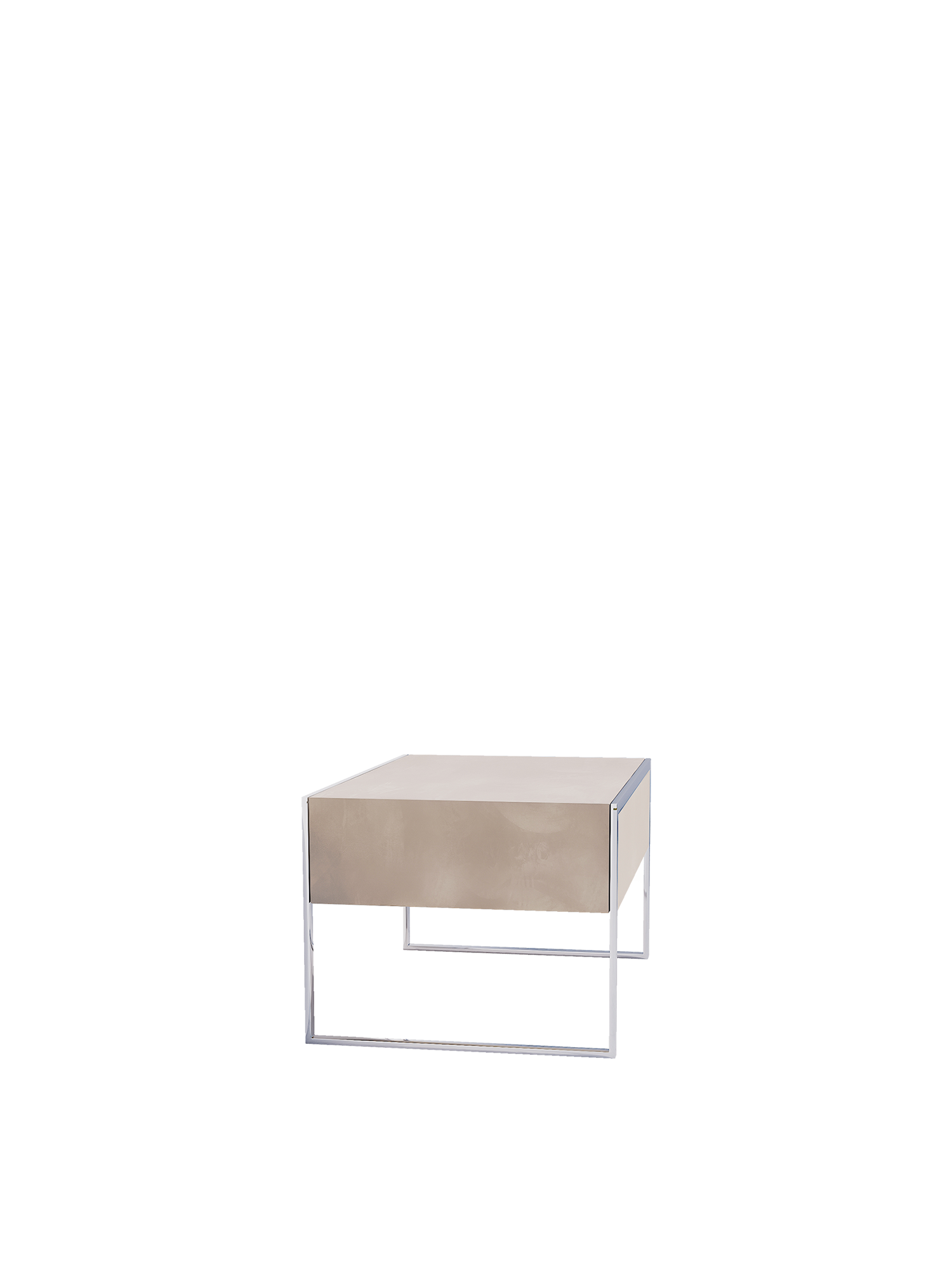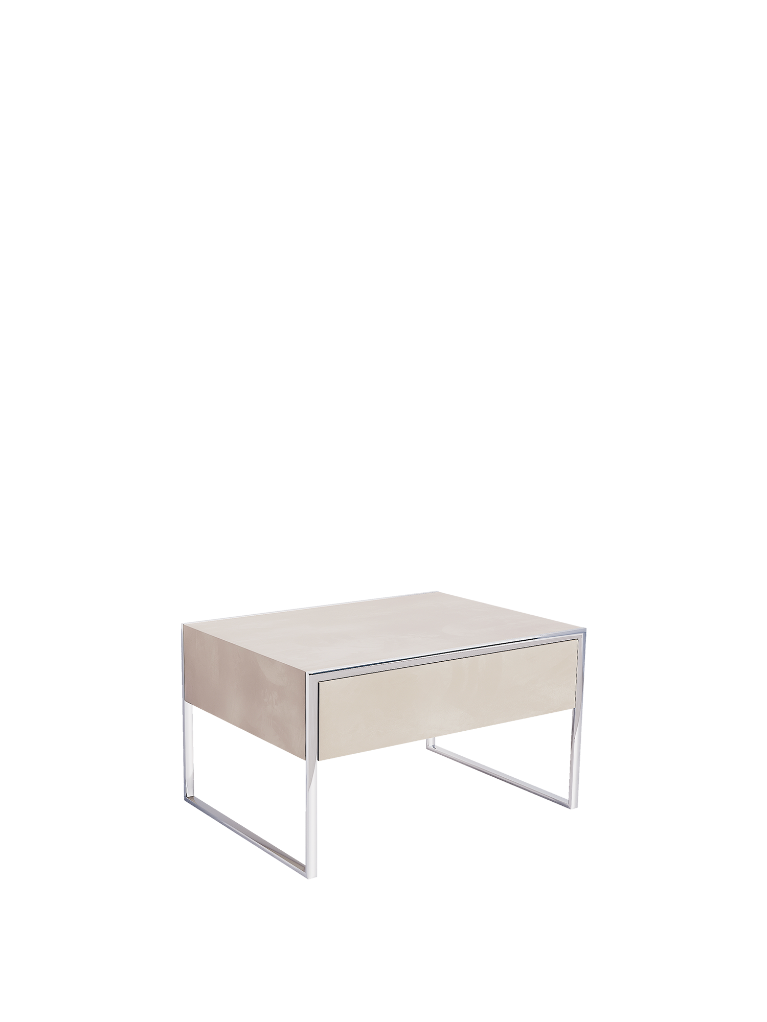 Das puristische Design des niedrigen Sideboards fügt sich in jedes wohnliche Umfeld und setzt mit geradlinigen Konturen und sanft changierenden Oberflächen einen eigenen Akzent. Das Gestell besteht aus glänzend poliertem Edelstahl, die Oberflächen sind mit beigefarbenem Mikroleder bezogen. Die Schublade schliesst mit Soft-Close.