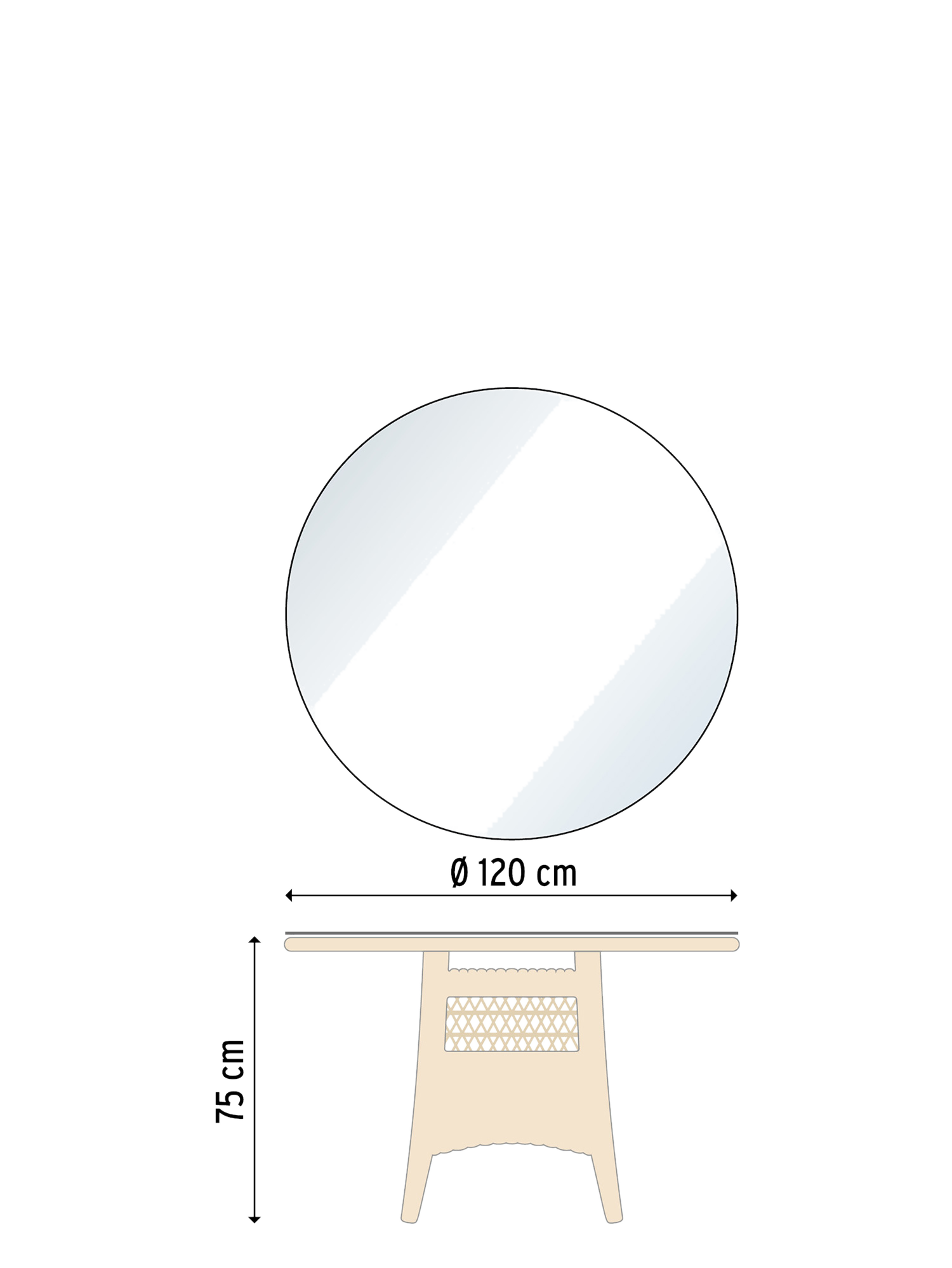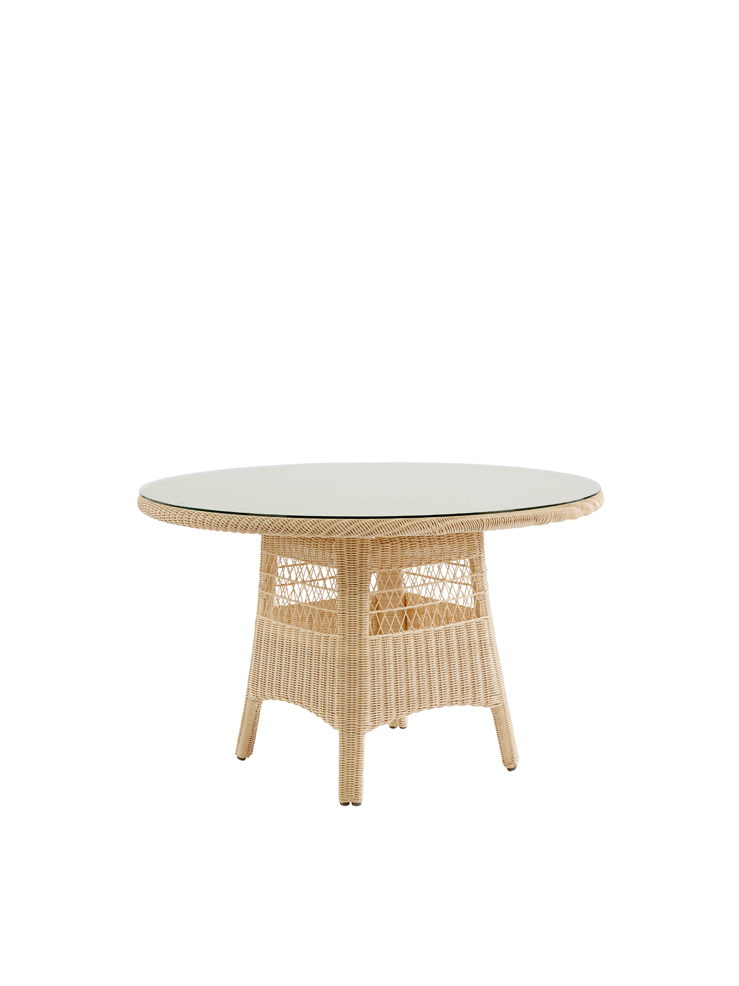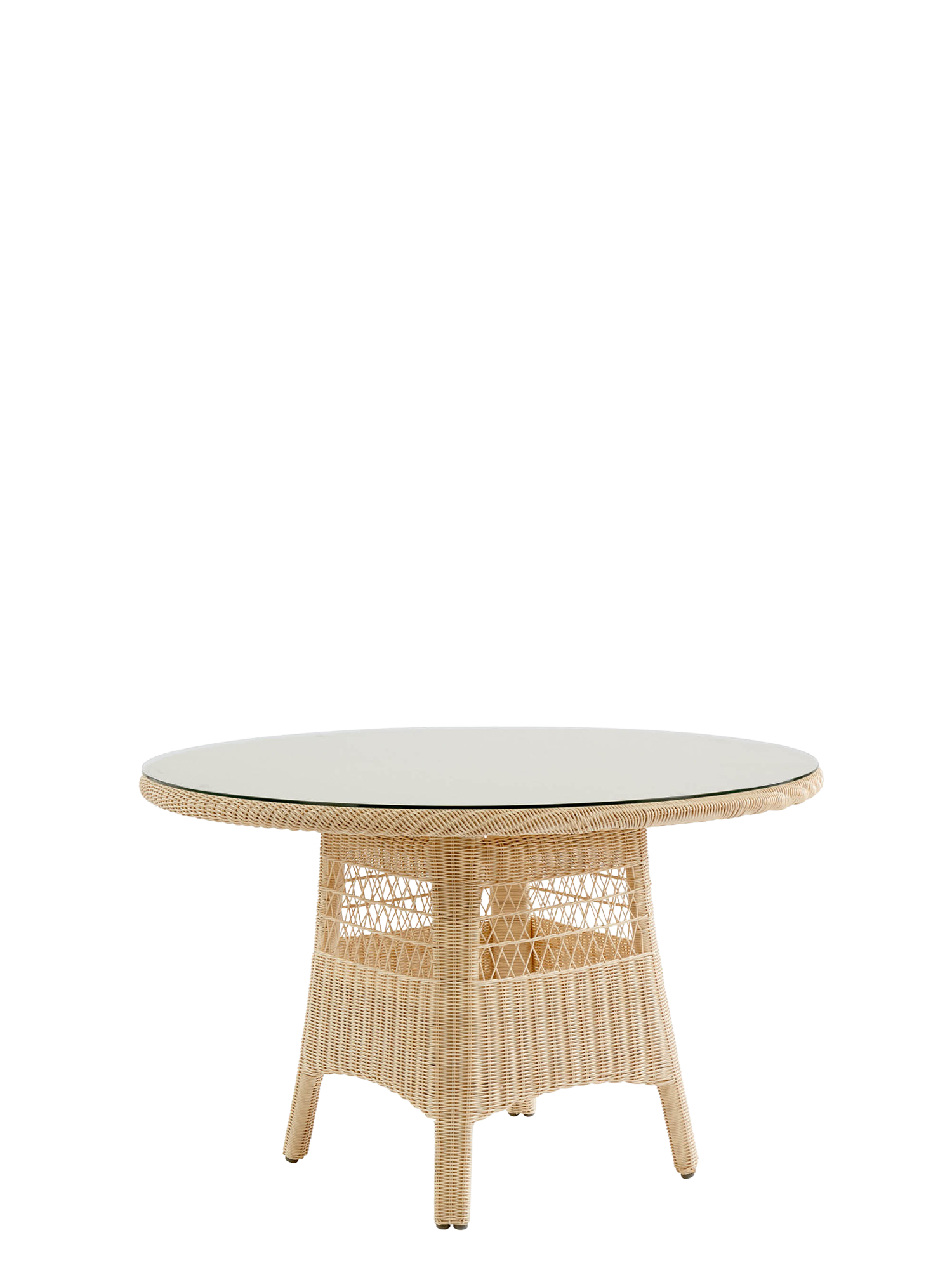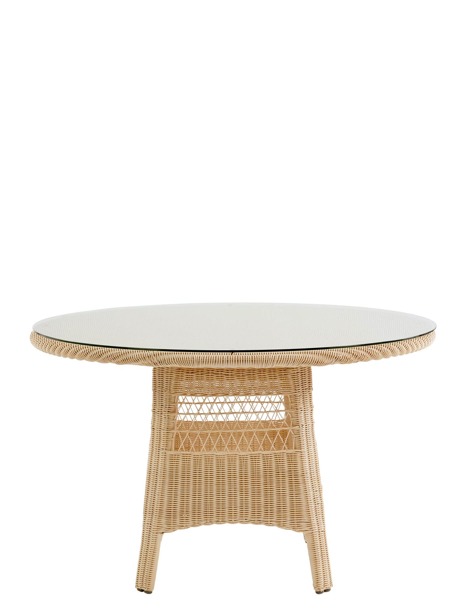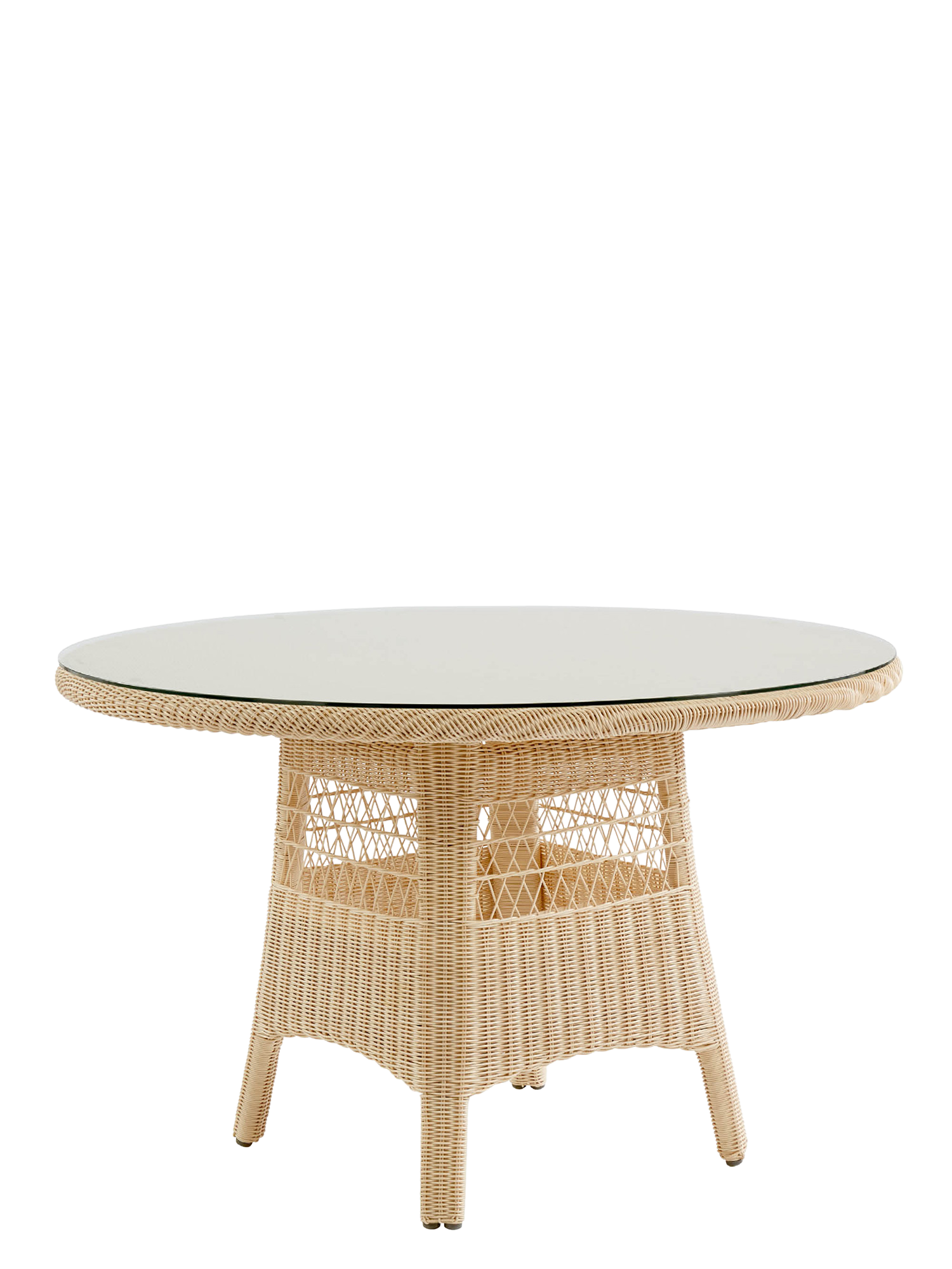 Das Geflecht des runden Tisches aus hochwertiger, wetterfester Kunststofffaser schimmert in schönen Naturtönen von Creme bis zu einem hellen Sandton. Seine Oberfläche schützt transparentes Sicherheitsglas.