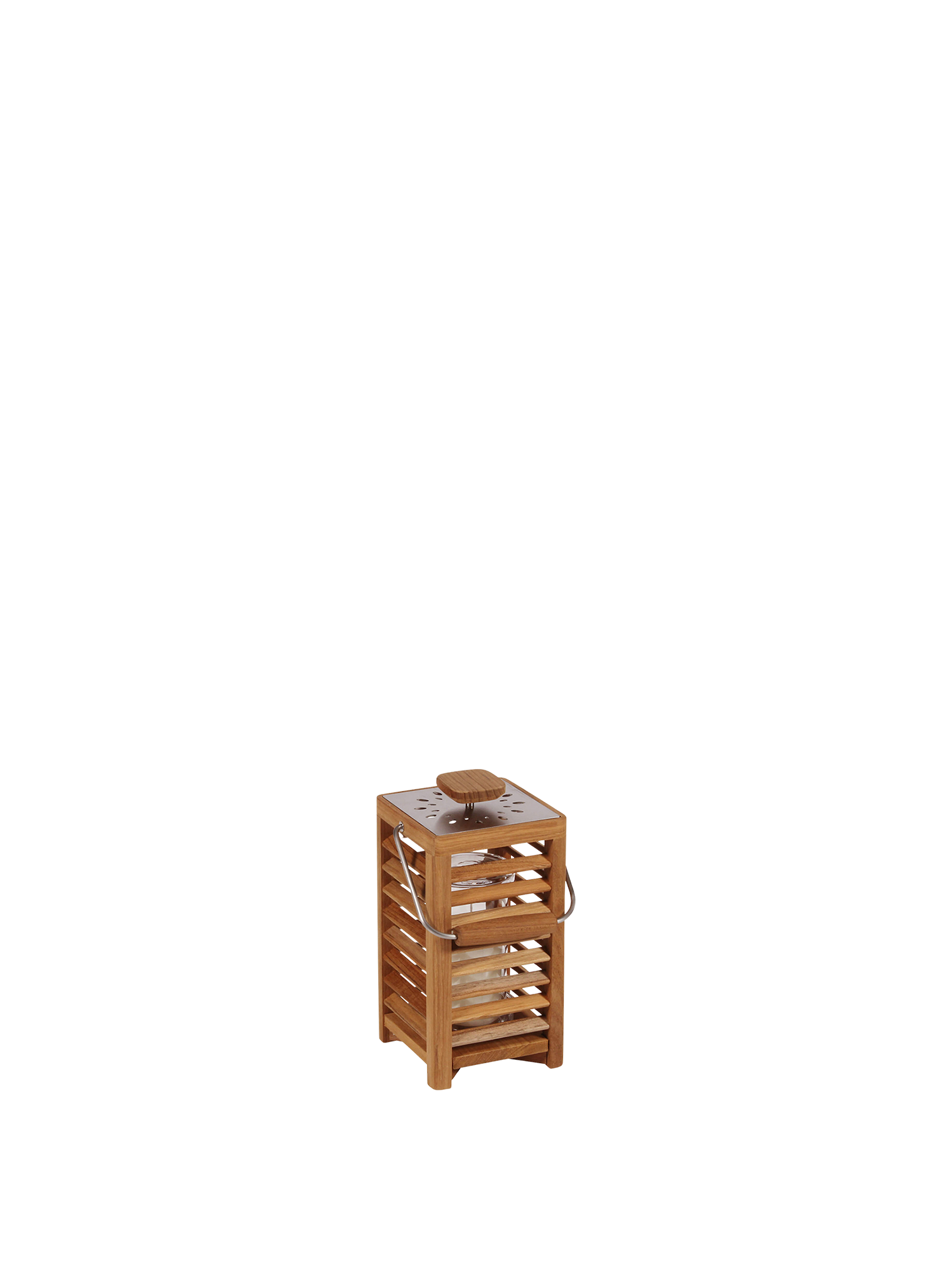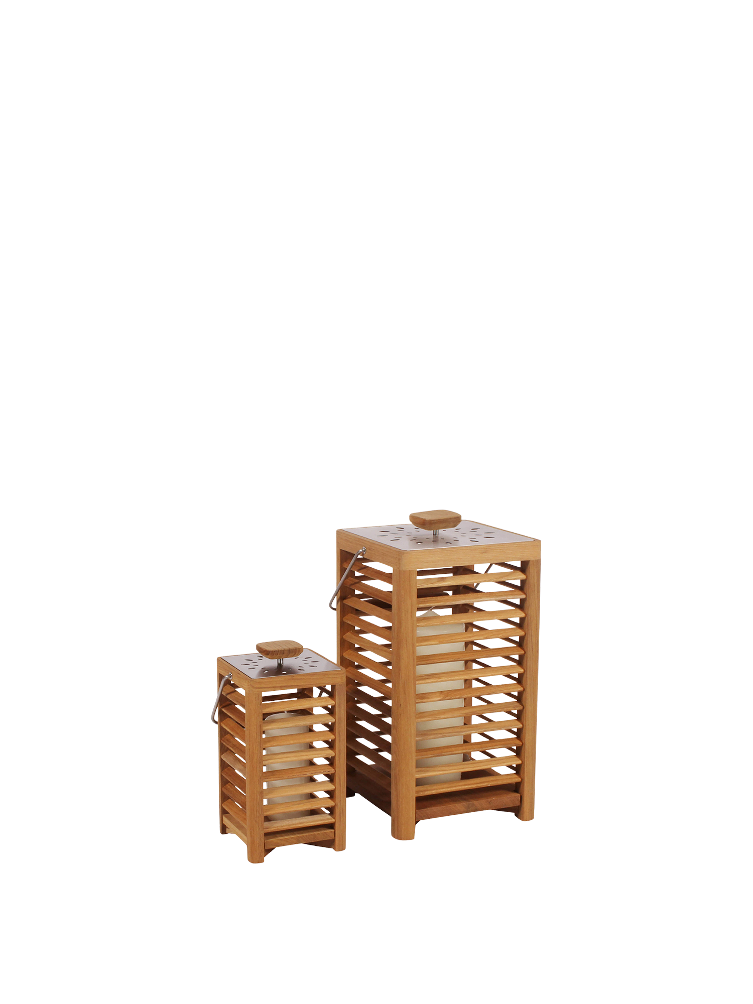 Gerade Linien bestimmen das ungewöhnliche Design der Windlichter aus wetterfestem Teakholz, die in zwei Grössen erhältlich sind. Ein herausnehmbarer Glaszylinder im Innern der Laterne schützt das Kerzenlicht, das durch die sanft nach unten abgeschrägten Lamellen besondere Effekte entstehen lässt.