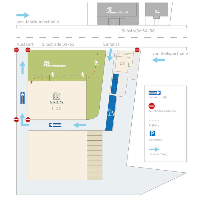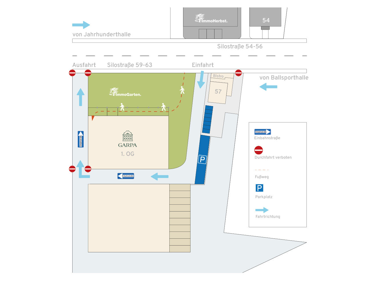 1. Haupt-Parkmöglichkeiten auf dem Gelände ImmoGarten GmbH und Garpa (Silostrasse 59-63).