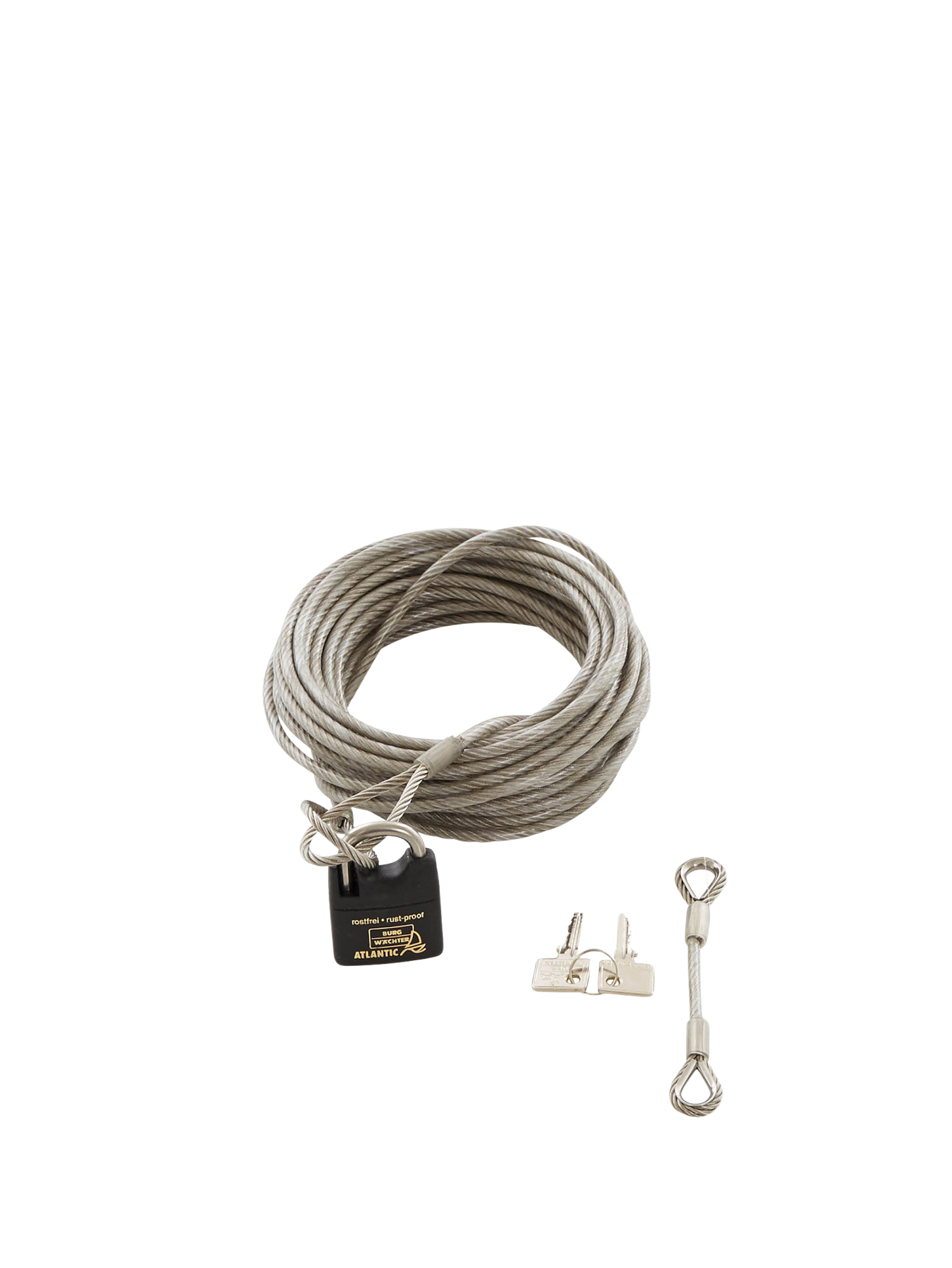 Das Sicherungsset besteht aus einem 5 mm starken, beweglichen Edelstahlseil, das mit transparentem Kunststoff ummantelt ist, einer Edelstahlöse, die am Tischbein befestigt wird und einem rostfreiem Schloss.